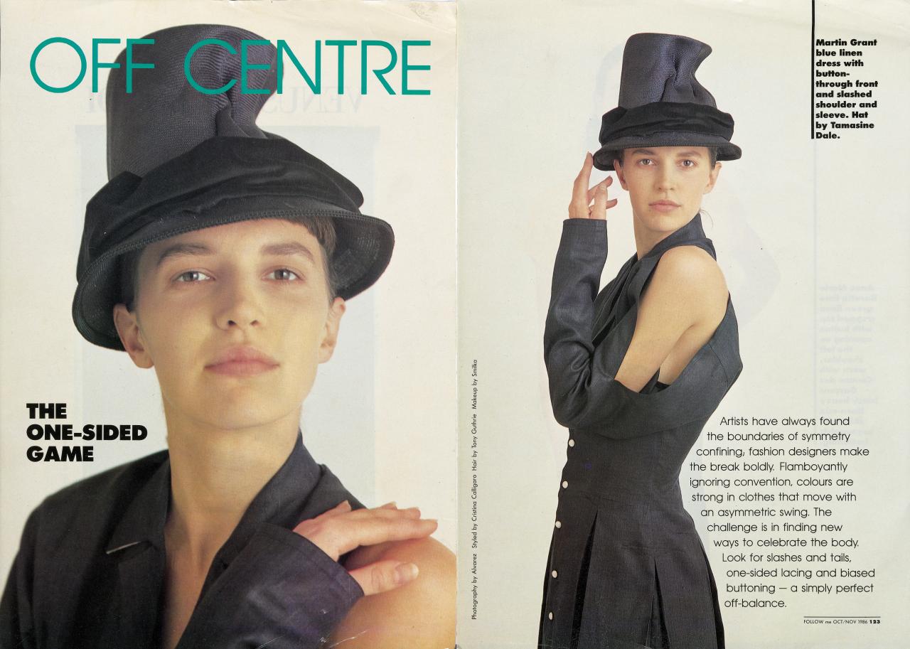 I think it was an important time in Melbourne in terms of fashion,’ reflects Grant. ‘It was the first time that young designers were given a voice and a platform to show their work.’ Along for the journey were two of his friends and earliest collaborators, milliner Tamasine Dale and photographer Polly Borland.