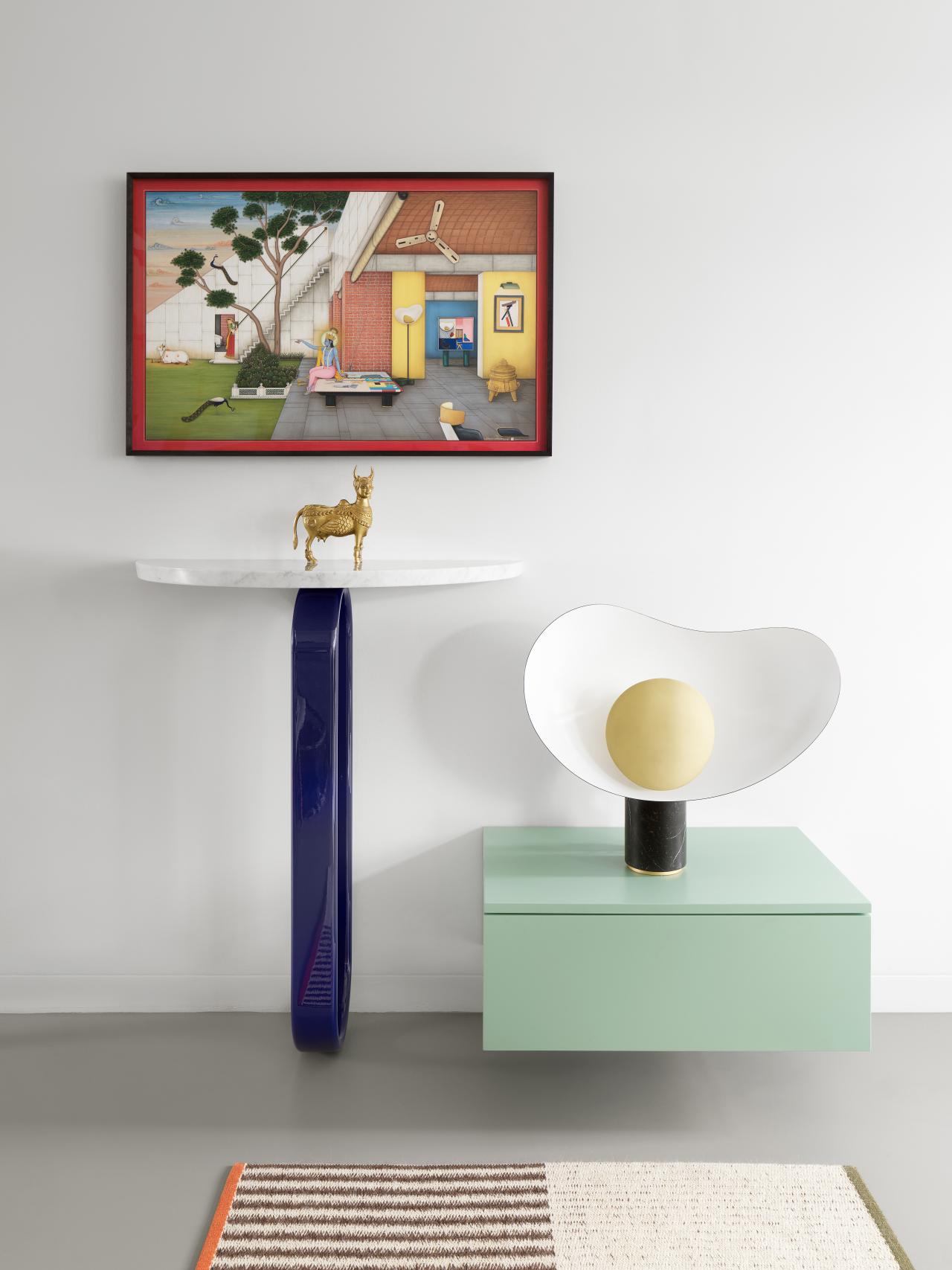 Throughout her career, Doshi has drawn inspiration from an array of influences, including seminal 1970s Bollywood films, Indian pigments and textiles, the architecture of Le Corbusier, her grandmother’s traditional gold and enamel earrings, and the royal miniature paintings of Jodhpur.