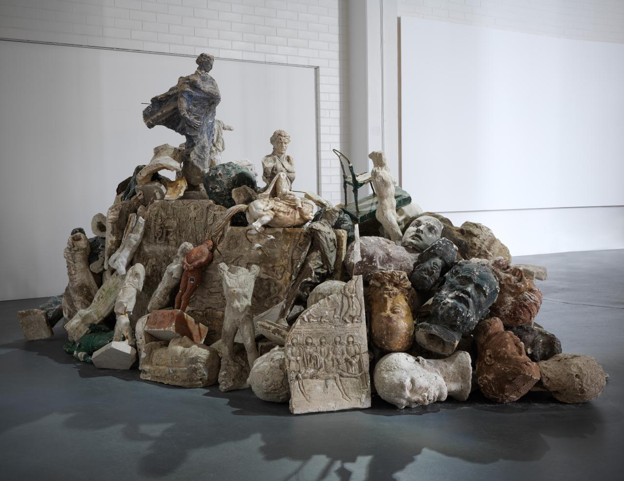 In Apotheosis 2021, a collage of sculptural fragments, Sanadze has used collected remnants of Soviet sculptor Valentin Topuridze (1907-1980), Sanadze’s family friend and childhood neighbour. Gifted from the family of the sculptor, Sanadze has reconstructed elements of Topuridze’s archive, piled into a large-scale installation which question complex historical legacies.