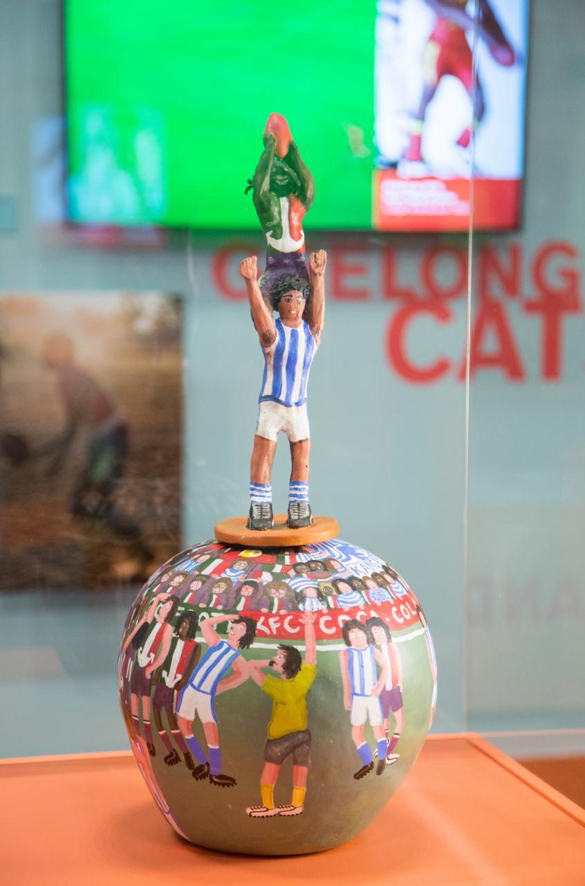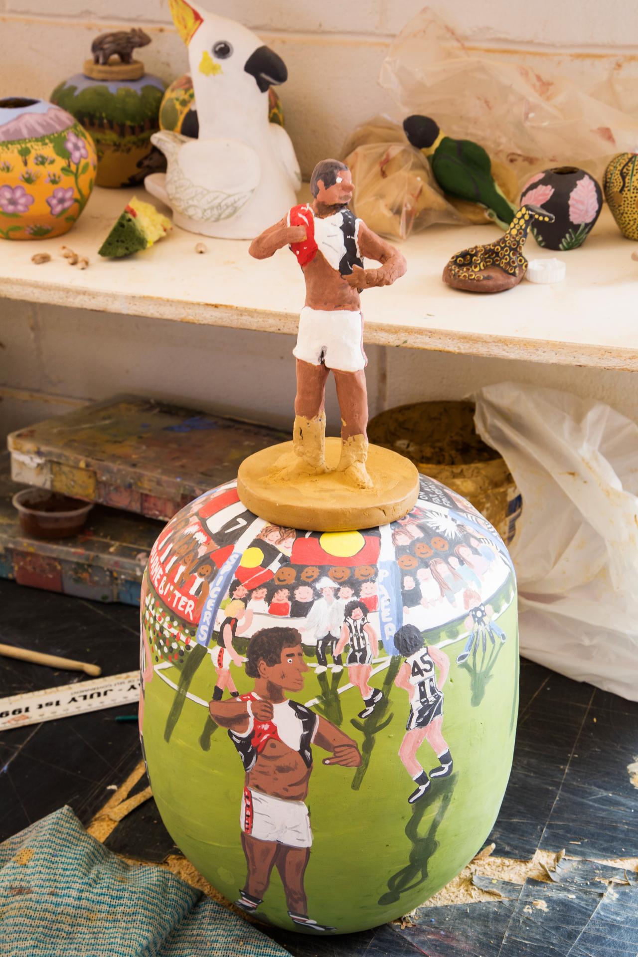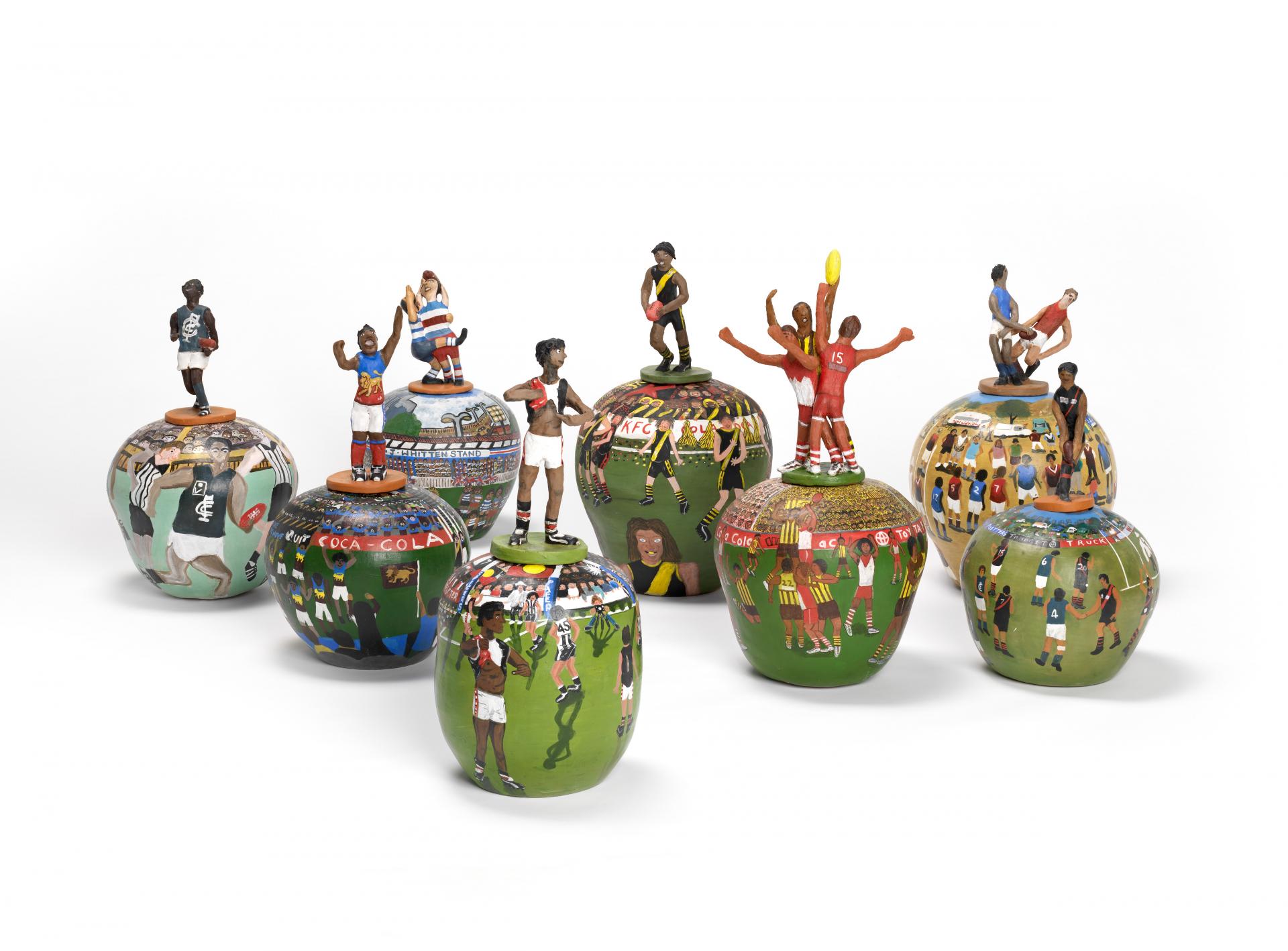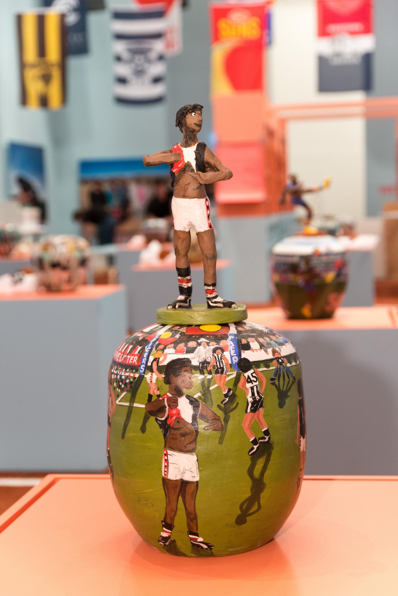 Australian Rules Football has taken over the NGV! The Hermannsburg Potters have created twenty pots depicting some of the AFL’s best and finest Indigenous players from all eighteen teams. Who do you barrack for?