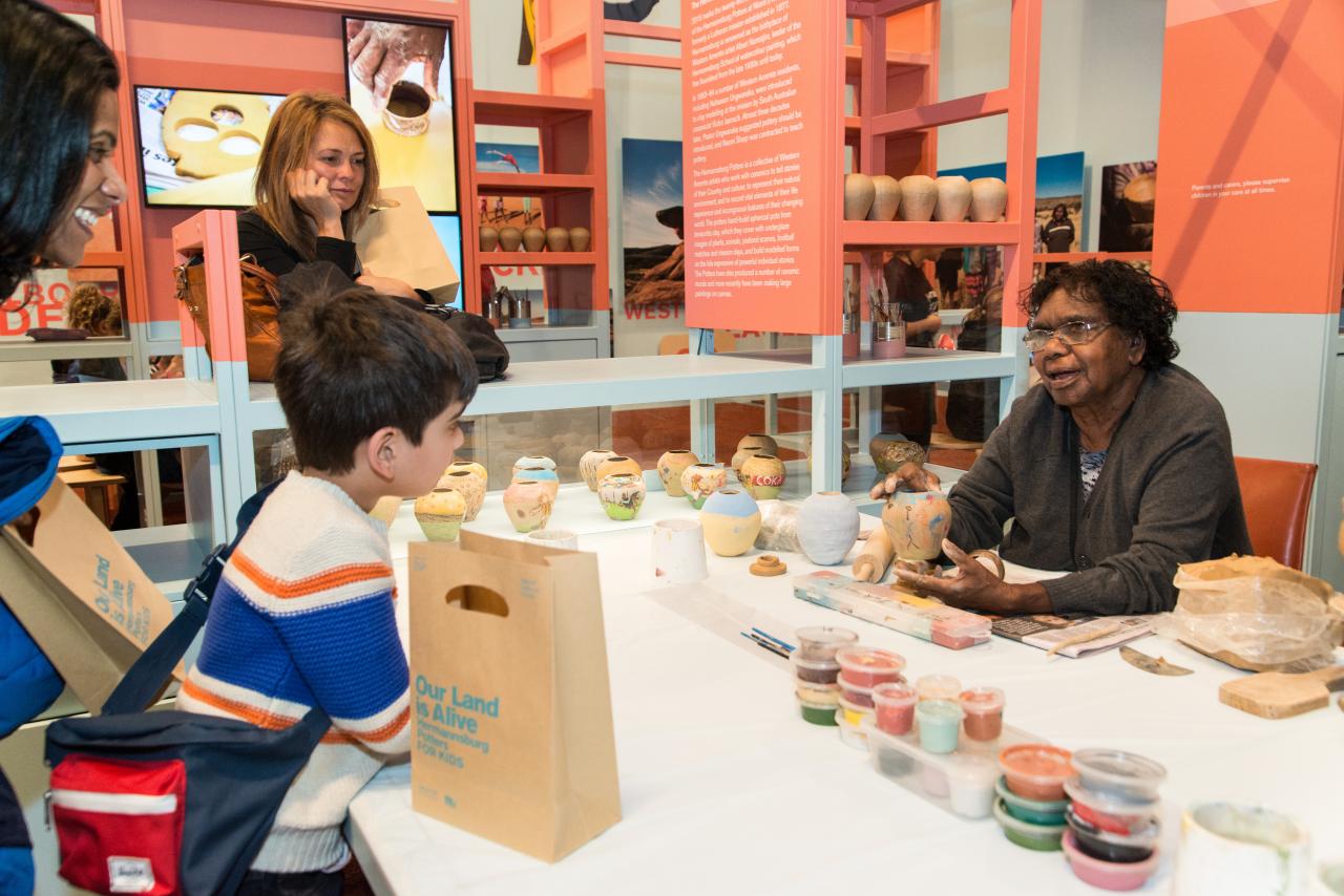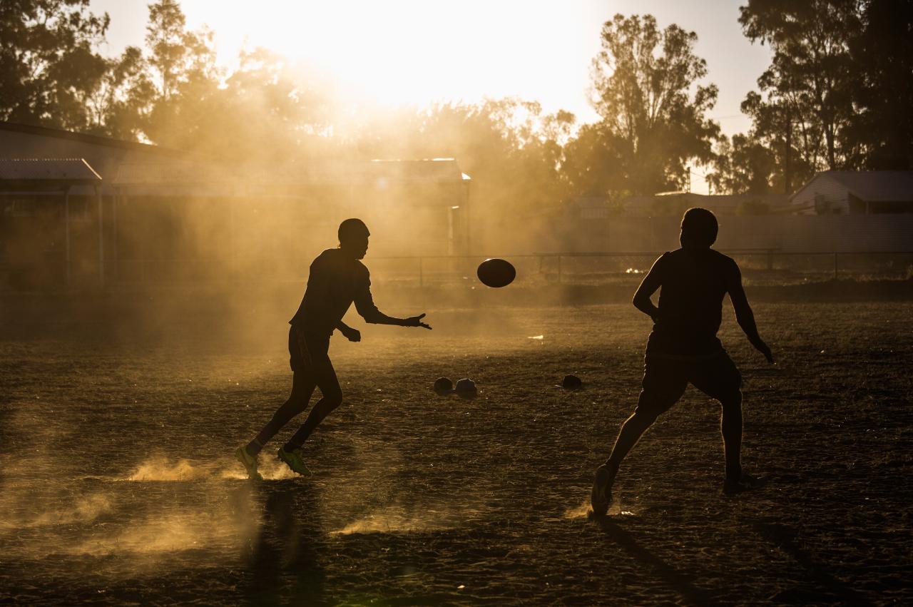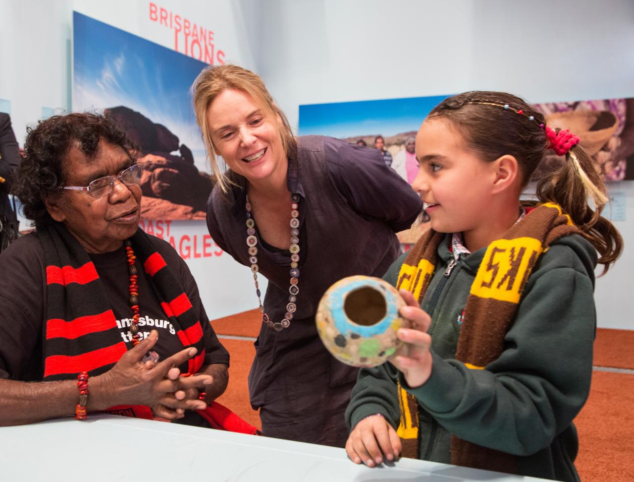 The Hermannsburg Potters belong to a small community 130 kilometres south-west of Alice Springs. They are famous for their colourful terracotta pots which tell stories about their culture and where they live: their Country, the mission days, bush tucker and, of course, football! During footy season the Hermannsburg community get together to watch AFL on TV and on weekends many make the trip to Alice Springs to support local teams.