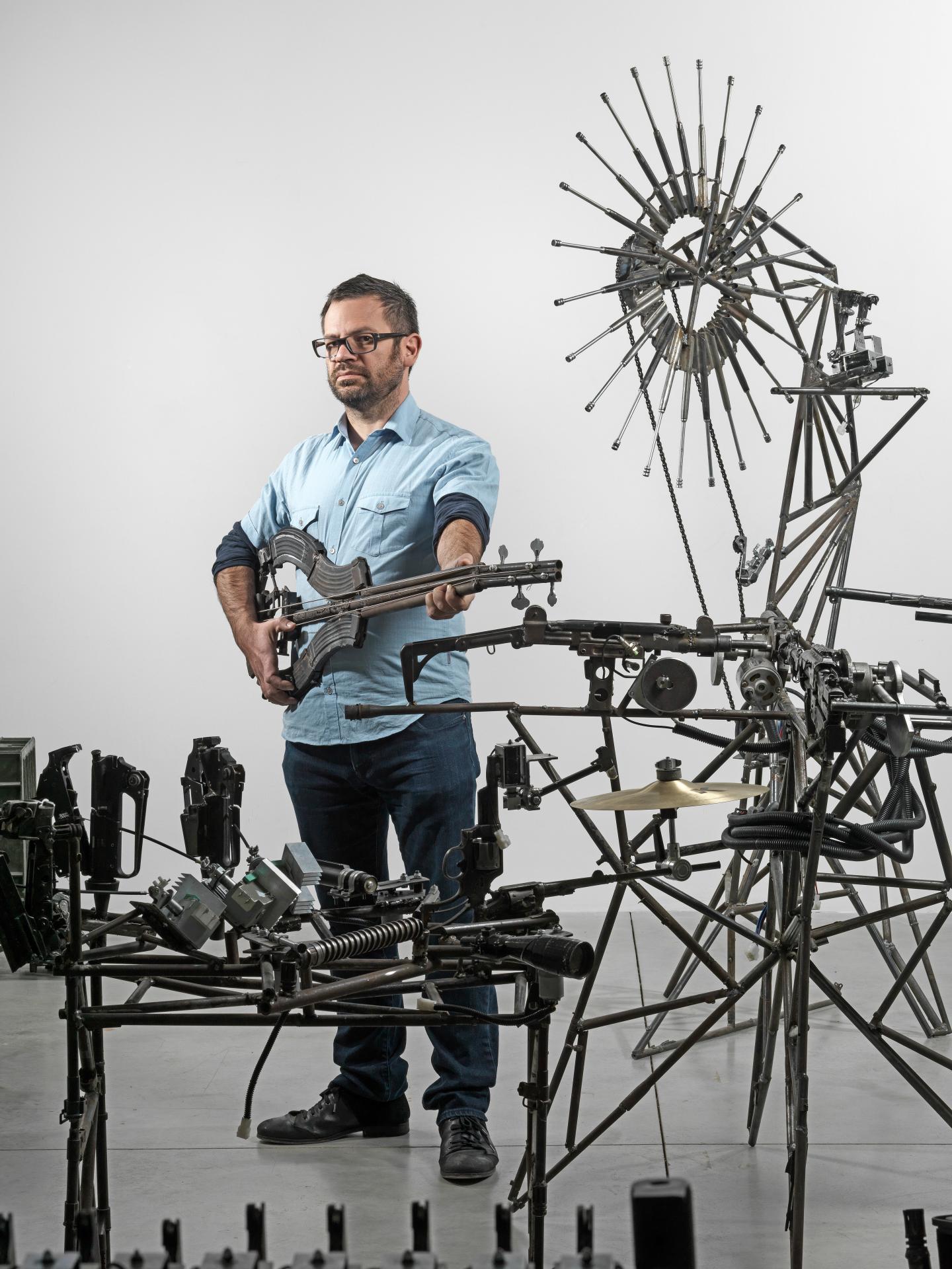 Disarm is Mexican artist Pedro Reyes’s response to global civilian warfare, the result of the illicit arms trafficking that claims many lives daily. Using parts from thousands of weapons confiscated by the Mexican government, Reyes has worked with local artisans to create an ensemble of forty-seven ingenious instruments including electric guitars fashioned from assault weapons, drum sets from pistols, flutes from shotguns and a harmonica carved from a handgun. Disarm is an inspired model of symbolic transformation, and a bold declaration: make art not war!