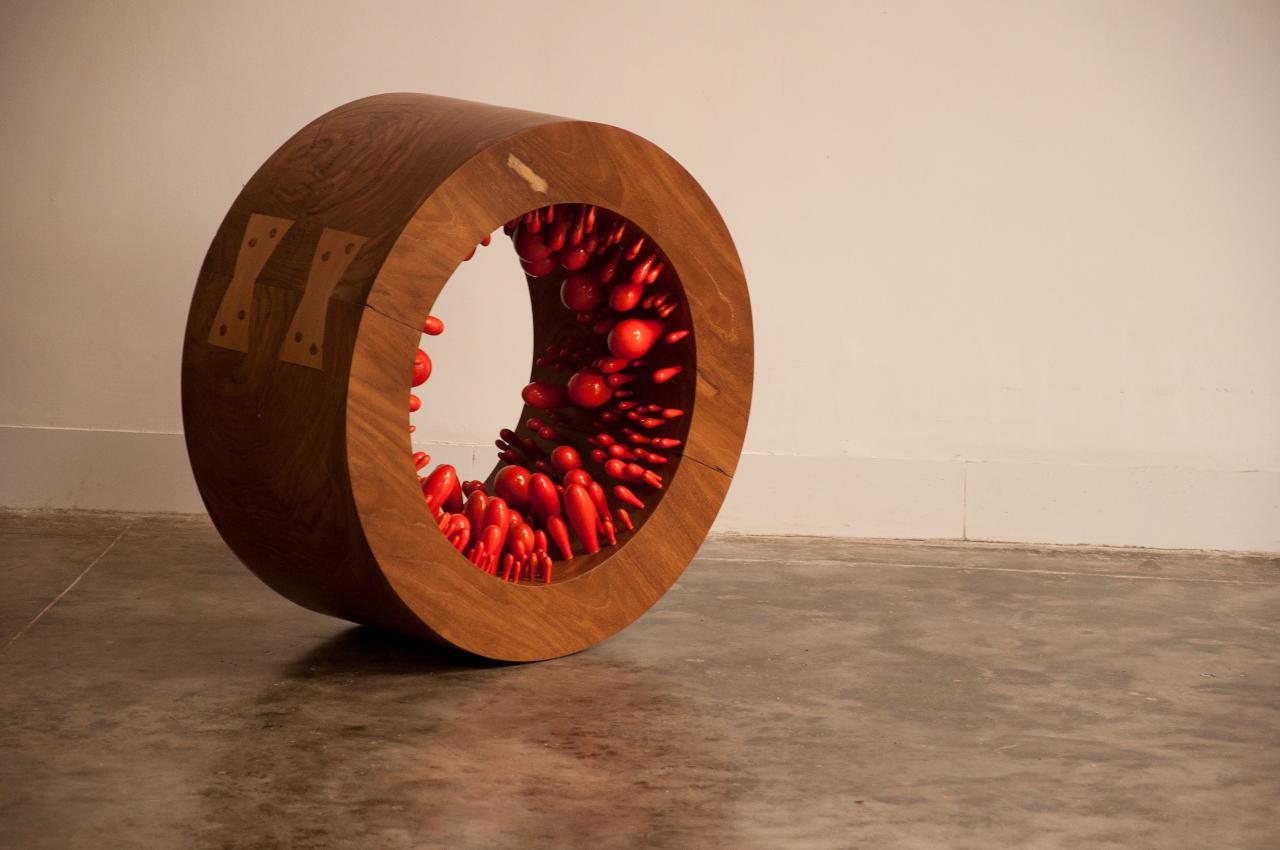 The sculptures featured in Ranjani Shettar: Dewdrops and Sunshine reveal Shettar’s dextrous ability to work with a range of materials; her choice of media a disparate roster of the organic and human-made, including tamarind kernel paste, muslin, lacquer, wood, automotive paint, fishing line, beeswax, dyed thread, latex rubber and steel.