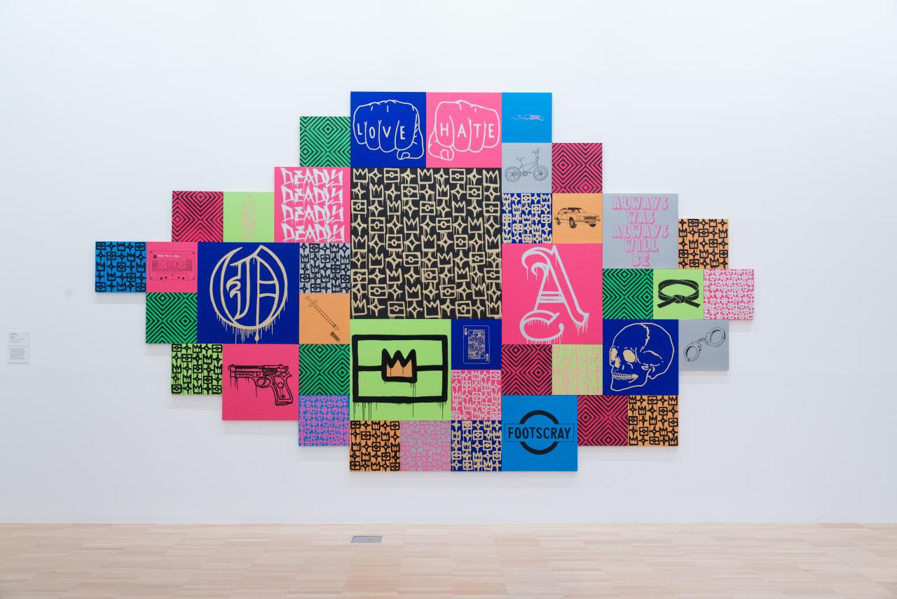 REKOSPECTIVE is an immersive exhibition that charts the bold and dynamic practice of renowned Kamilaroi artist, Reko Rennie. The exhibition resists a conventional chronological sequence, allowing audiences to freely navigate the intersection between culture, politics and identity from a contemporary First Nations perspective.