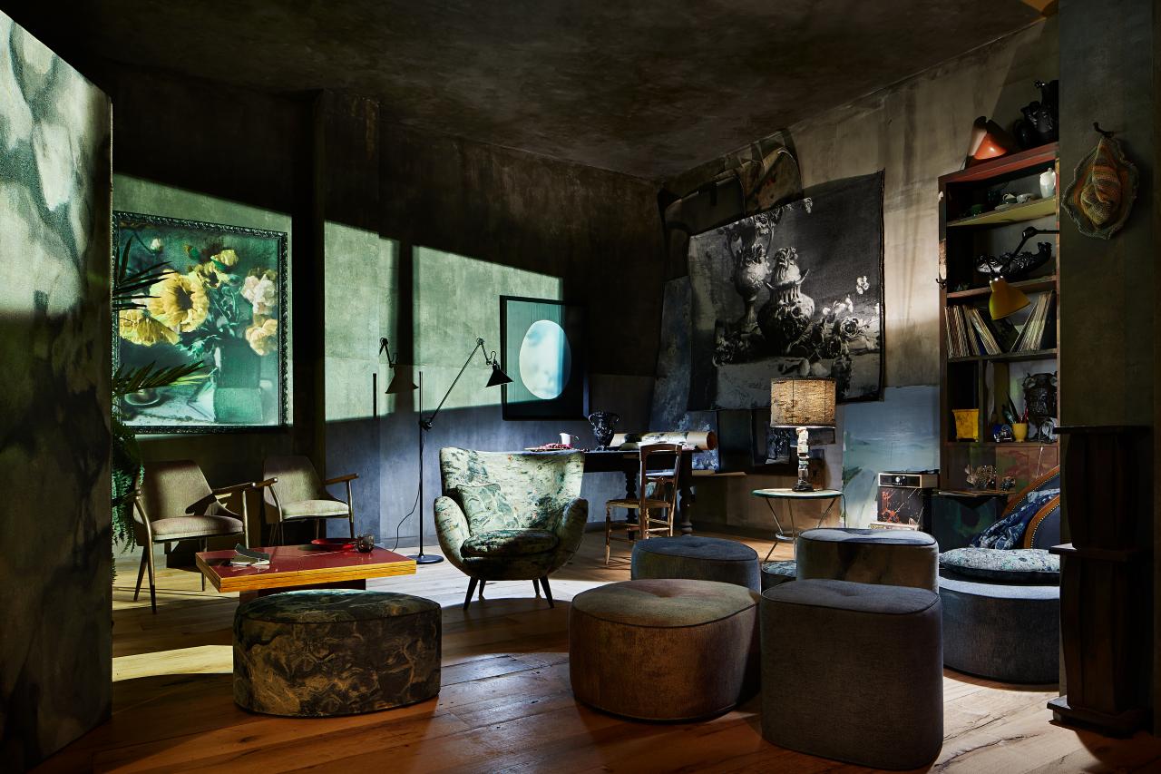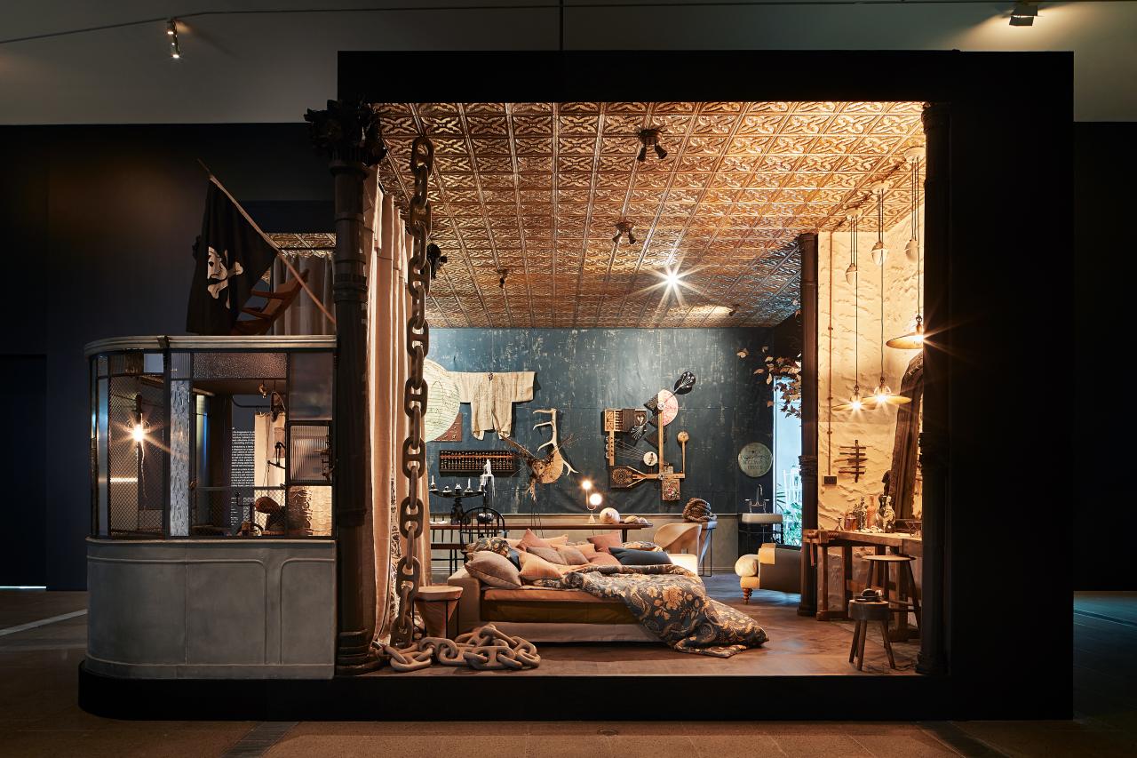Atelier is layered and textural, and woven throughout are intriguing pieces which demonstrate that interiors are intensely personal. Clothes are hung like artworks to give the sense of a moment captured in time, and discarded apple boxes act as bedside tables. These are offset by a vintage chair, a hand-crafted lamp and a luxurious rug to convey the importance of both ‘high’ and ‘low’ material culture, or the perceived value of pieces. Thompson designed the room to engage the senses and generate an emotional response through the movement and play of light as well as ambient music commissioned specially for the installation.