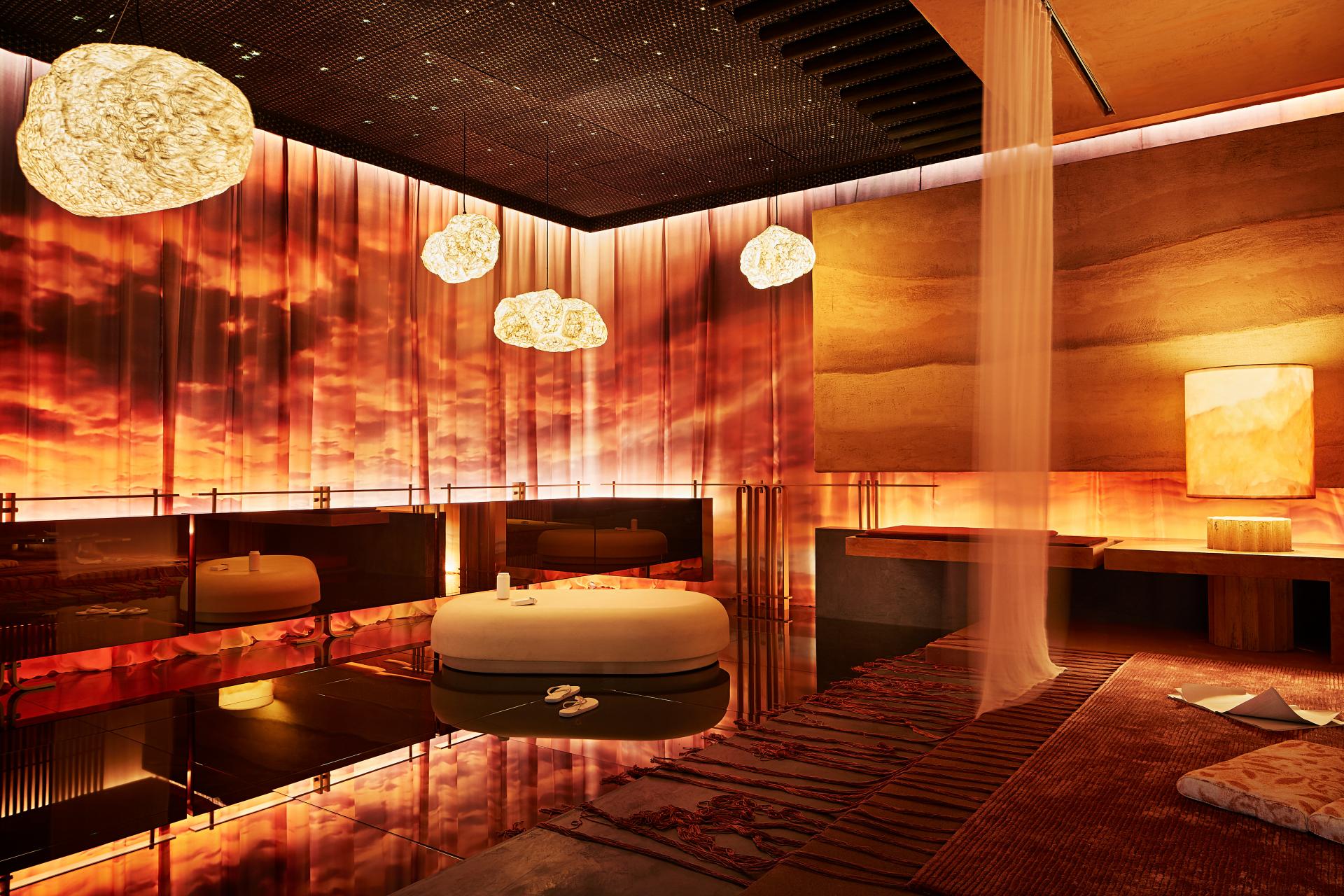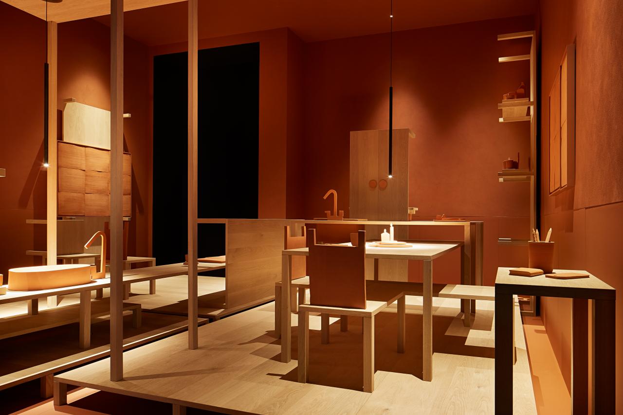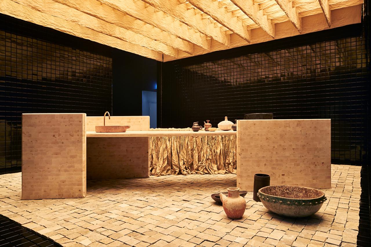 Within the room, the connection between domestic living and emotional and physical wellbeing is explored by looking into what the designers say are the essential needs of the human soul: to replenish (feast), to restore (bathe) and to retreat (rest).