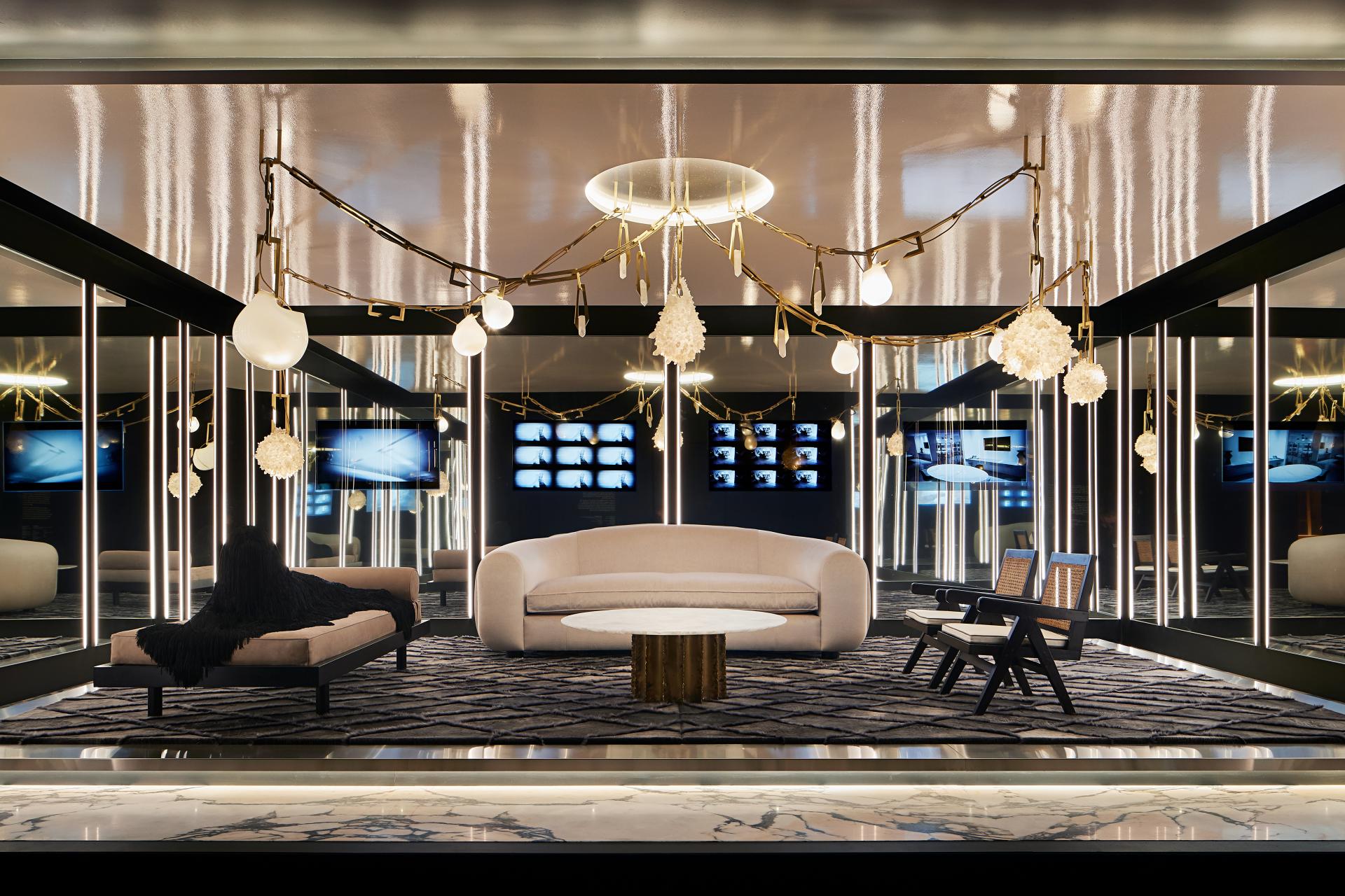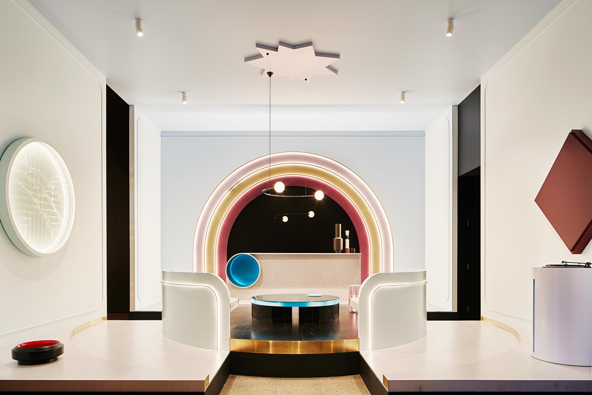 Inner-Terior is part conversation pit, part lounge room and part stage. It takes its design cues from the cult-classic film Xanadu (1980), Art Deco bandshells of the 1920s, European retrofuturistic design of the 1960s, and rollerskating rinks and amusement rides of the 1980s. The thread running through these seemingly disparate references is the designer’s own psychological ‘inner terior’, where the aesthetics of performance and stage provide a rich and idiosyncratic source of inspiration.