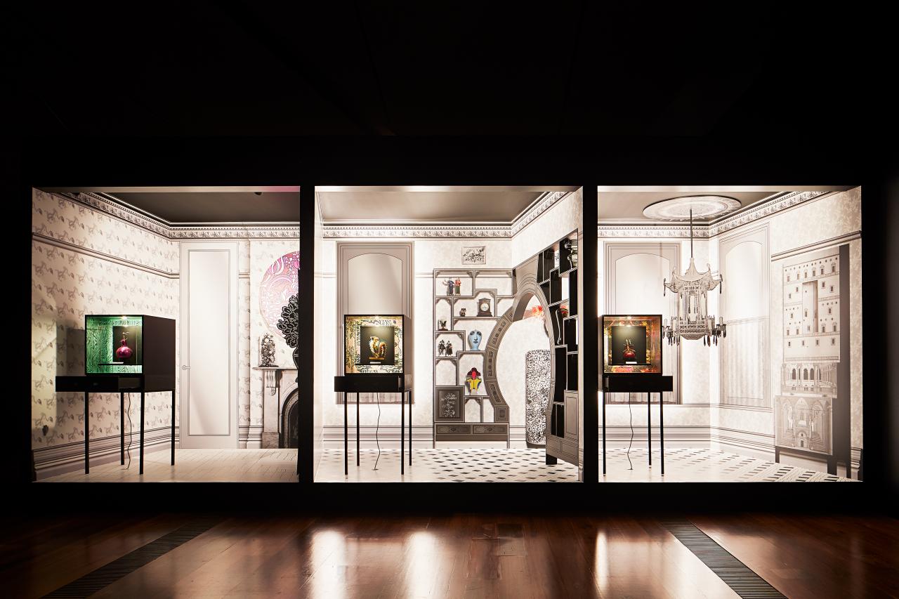 Each of the six rooms features a ‘wunderkammer’, a repository of wondrous and exotic ornaments, materials and finishes. Within each of these cabinets, Weston has displayed prized ‘jewels’ created in miniature form by six of his most admired artists. Weston describes them as things that provide him with wonder and delight: the macabrely beautiful forms created from tiny bones by Linde Ivimey; the exquisite intricacy of Benja Harney’s paper sculptures; Reuben Paterson’s light-refracting glitter artworks; Di Holdsworth’s extraordinary automata assemblages; the tactile pleasures of Kirsten Frederick’s knitted Angora wool work; and Maris Cummins’s intricate Japanese glass beading.
