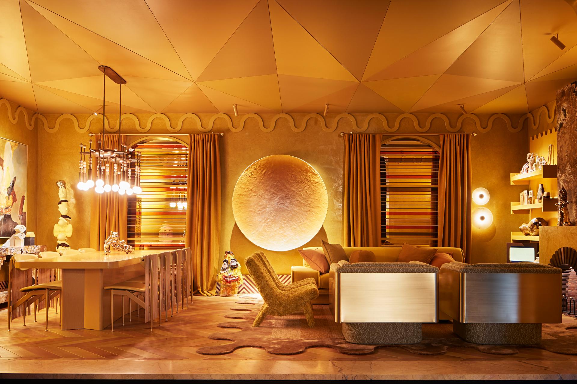 Most pieces in this display were designed or created by Martyn Thompson himself. His rugs, ceramics, textiles, art and ottomans are shown alongside collaborative pieces as a Gesamtkunstwerk (a ‘total work of art’). Thompson’s philosophy is that creative spaces are always evolving and should have flexibility embedded in their design so they can adapt to shifts in function or mood.