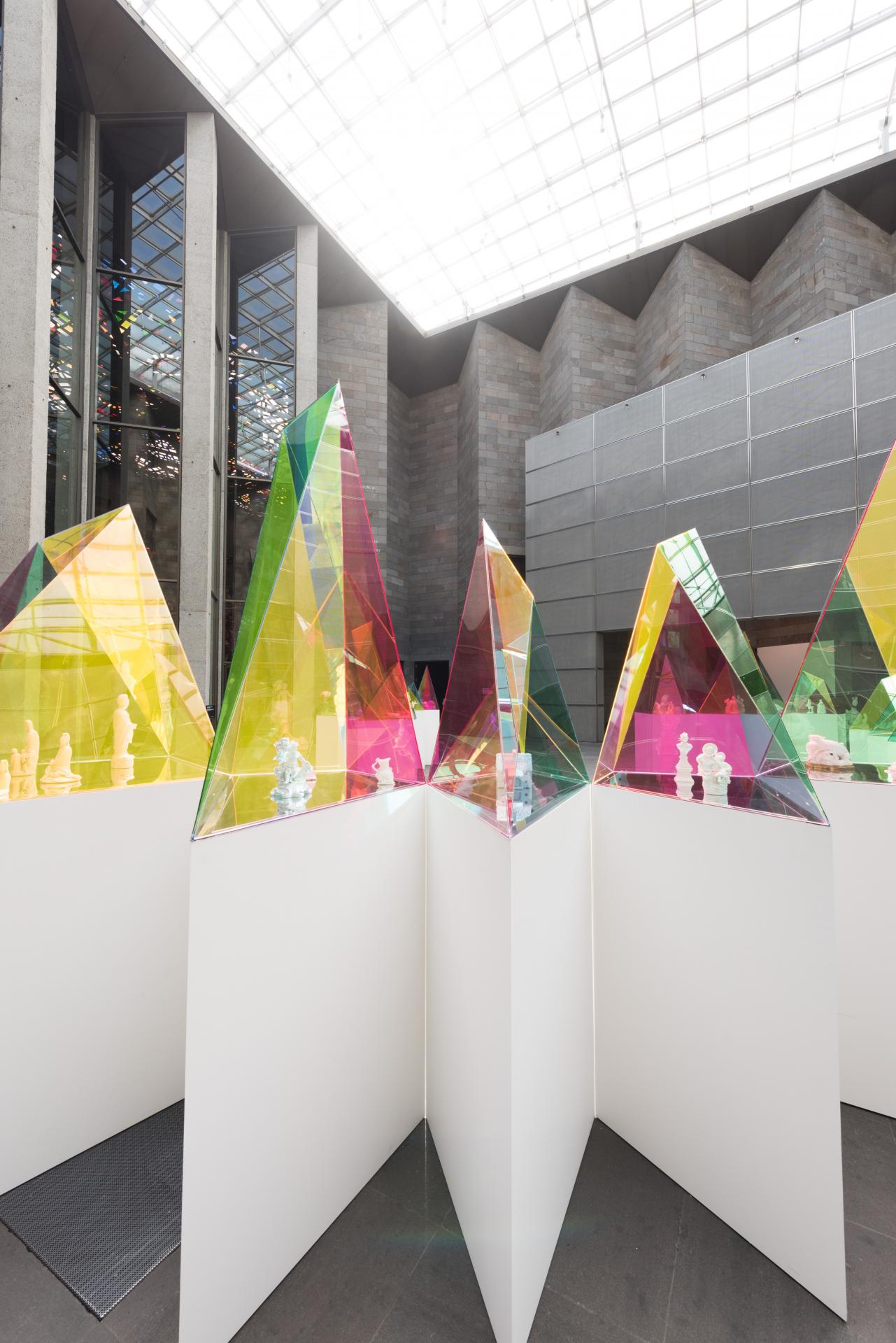 Comprising a large group of geometrically shaped vitrines constructed from brightly coloured dichroic acrylic, SO – IL’s design recontextualises and draws into focus a broad selection of white porcelain objects from the NGV’s Decorative Arts Collection, ranging from the seventeenth, eighteenth and nineteenth centuries. The display creates a unique dialogue between historical artefacts and contemporary design, as the architects explain: