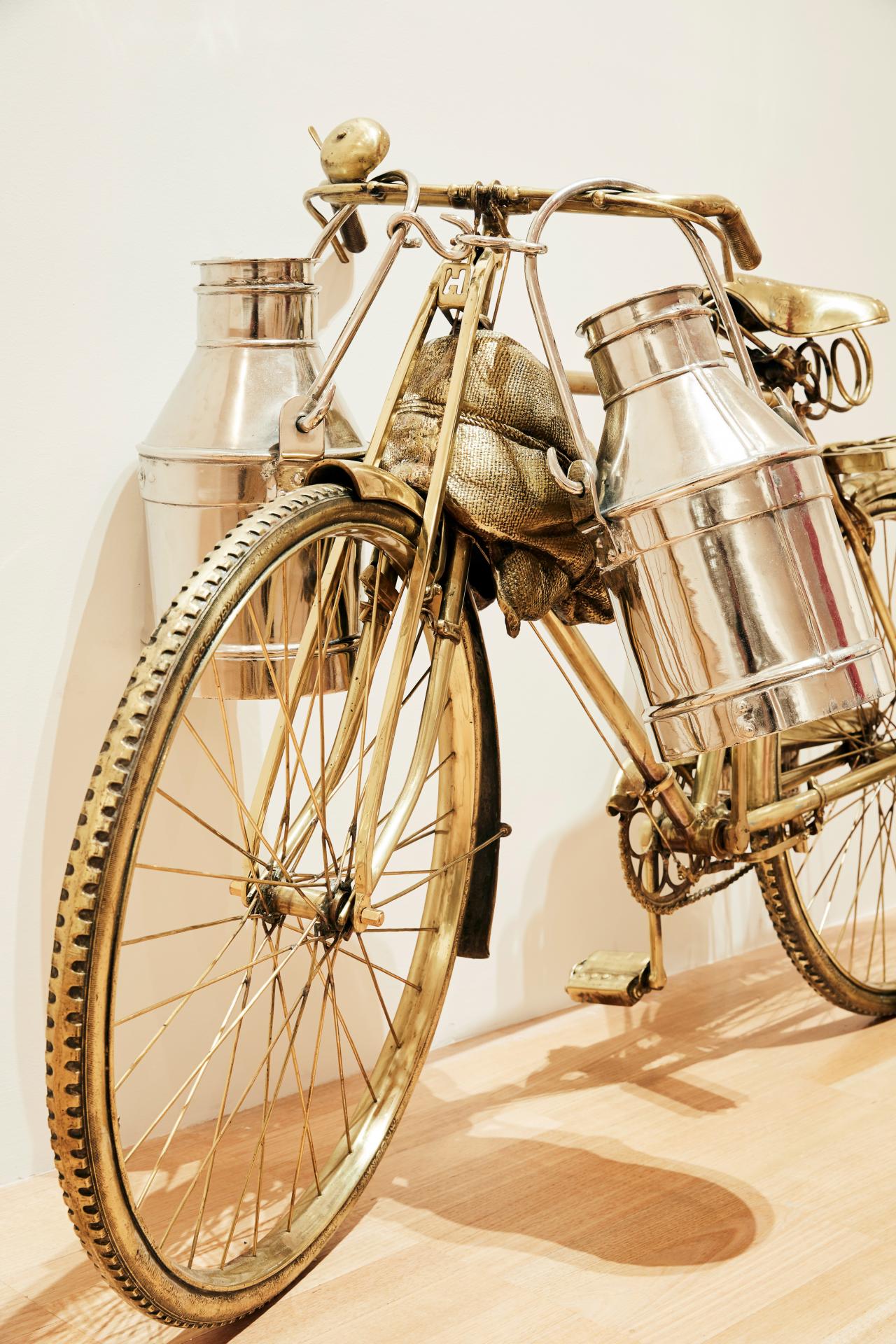 The exhibition includes key works from his oeuvre including Cow 2003, a bronze and aluminium sculpture of a life-size bicycle and milk pails, which represents the travels and travails of everyday village life.