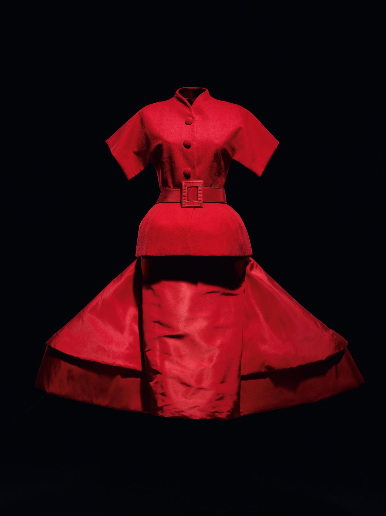 Bar coat was presented as Look 10 from Raf Simons’ first couture collection for the House of Dior. The presentation drew heavily on the traditions of the house and the style codes of founder Christian Dior, in particular the use of the colour red and the silhouette of the iconic Bar suit of 1947. Yet the collection was also a projection of Simon’s own minimalist design sensibility, underscored by an appreciation of line and form.