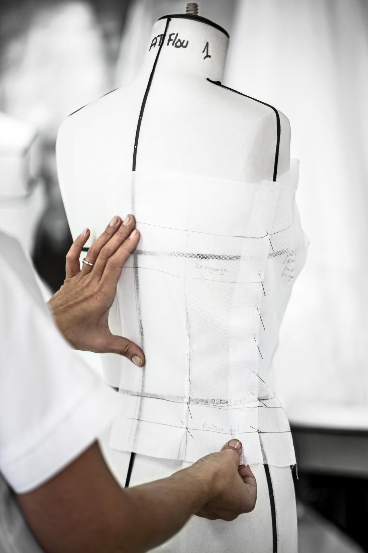 During Dior’s heyday, there were twenty-eight workrooms across five buildings, with 572 staff. Today there are just sixty permanent staff across the two specialist workrooms. Yet surprisingly, little about the dressmaking process has changed: white lab coats are still worn; employees are still ranked according to skill and experience; a house model, selected by the designer, is still used; and the flow of work courses from an idea or sketch, to toile (prototype), to fitted result over two months for each collection.