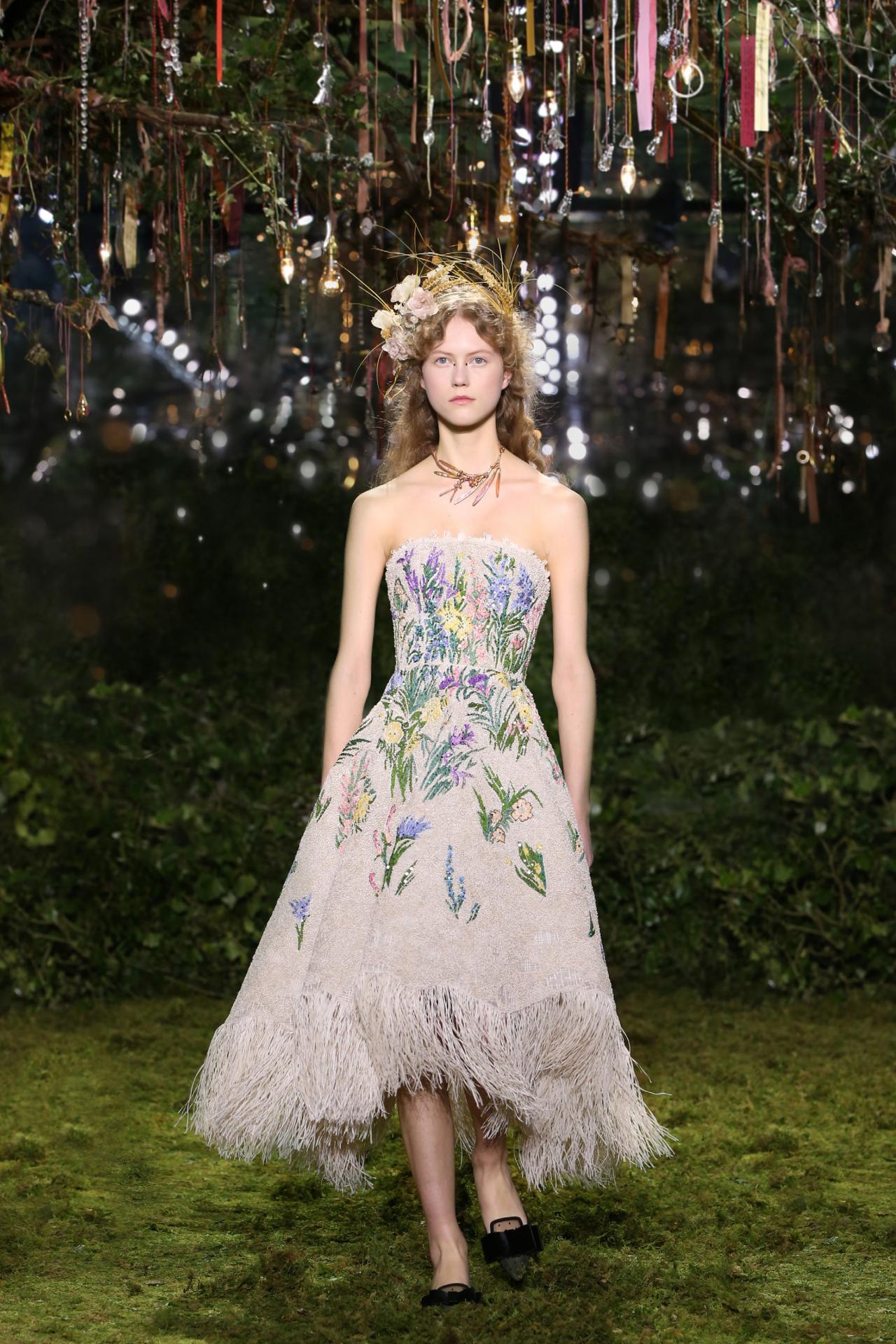 Essence d’Herbier references an early sample produced exclusively by French embroidery house Rébé for Christian Dior in the 1950s. Chiuri has used the exquisite floral design and motifs to form the embroidered surface of this dress, combining a sense of house history with her own youthful and romantic vision for couture.