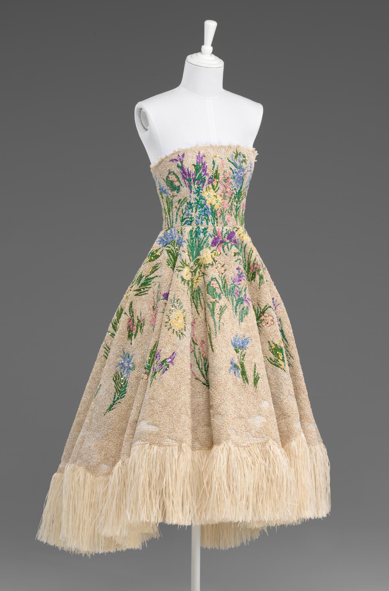 Made in the tailleur because of the nature of the fabric and manner of construction, Essence d’Herbier was first sent to a specialist embroidery workshop, atelier Safrane Cortambert as ten individual organza panels: seven for the bodice and three for the skirt. Detailed instructions were pinned to the material denoting the exact position, colour, scale, thread count and beadwork necessary for the design. Stretched over a frame, the panels were then worked on by up to seven needleworkers, beginning with the floral sprays, followed by the surrounding raffia – which was first flattened, then spliced into fine strips for stitching into a surface of small raised loops – and finishing with the beadwork. Taking over a month and several thousand hours to complete, the embroidered panels were then returned to the tailleur for fitting, shaping and assembly on a mannequin.
