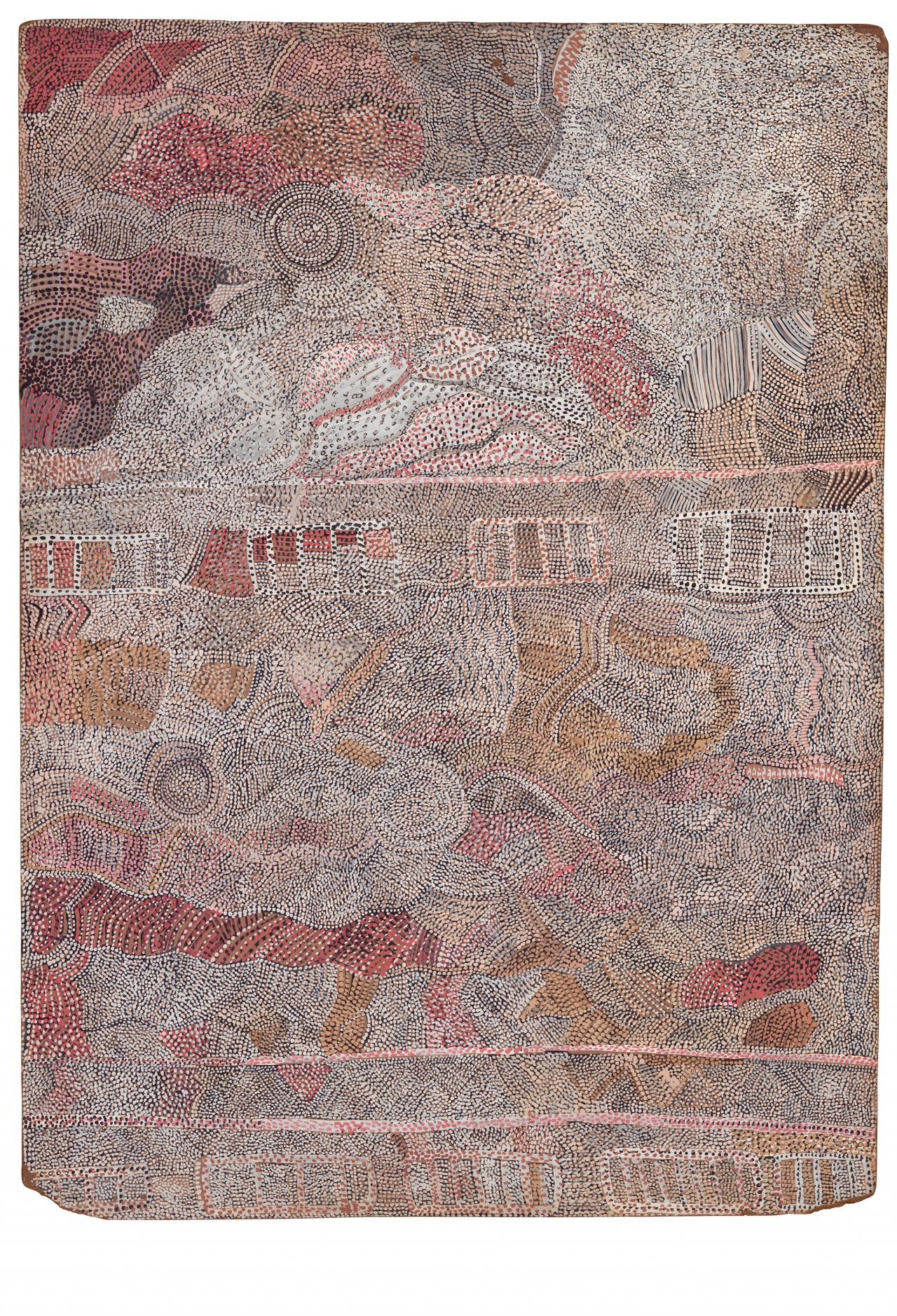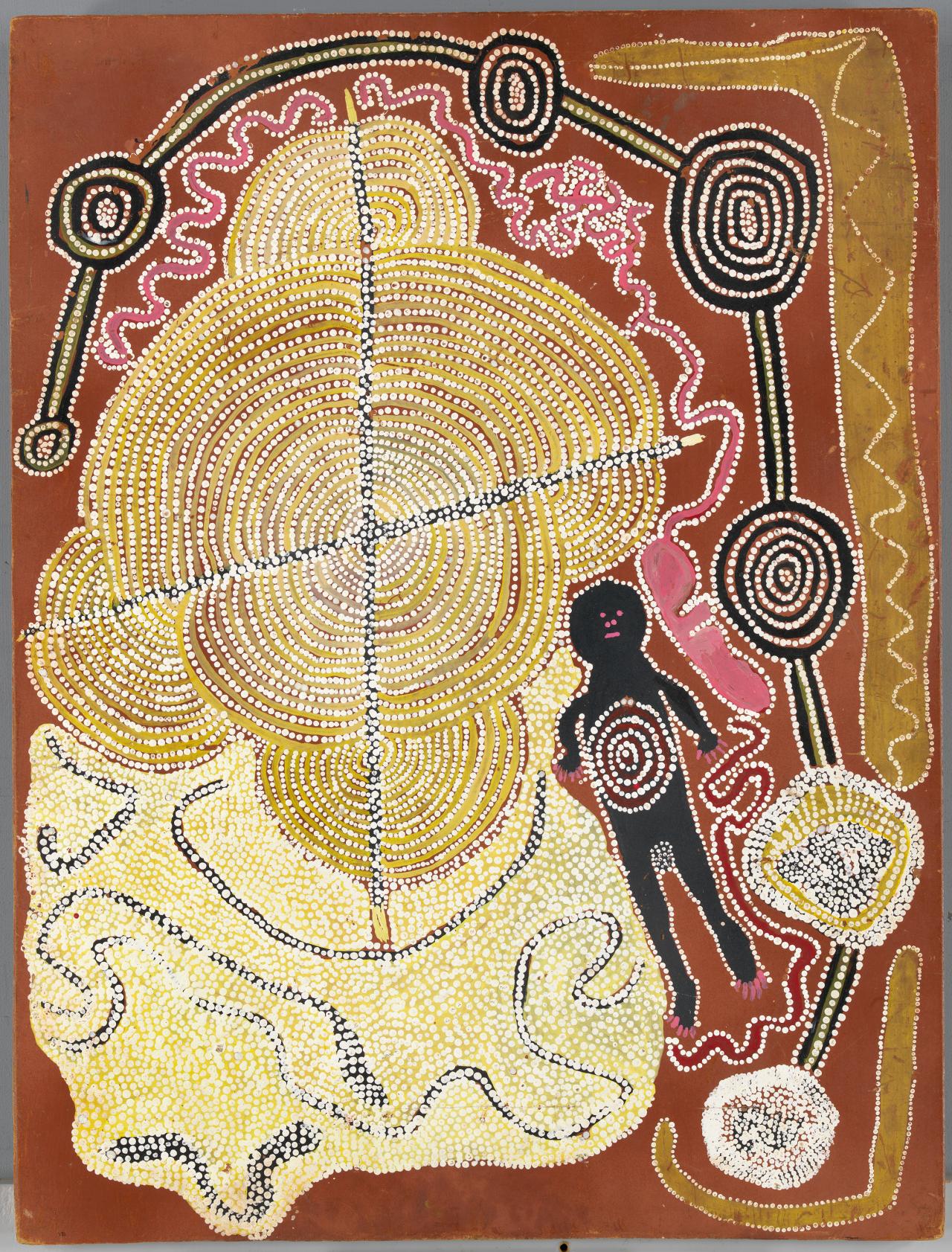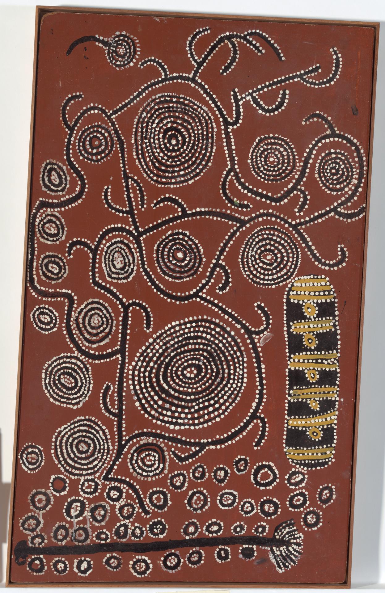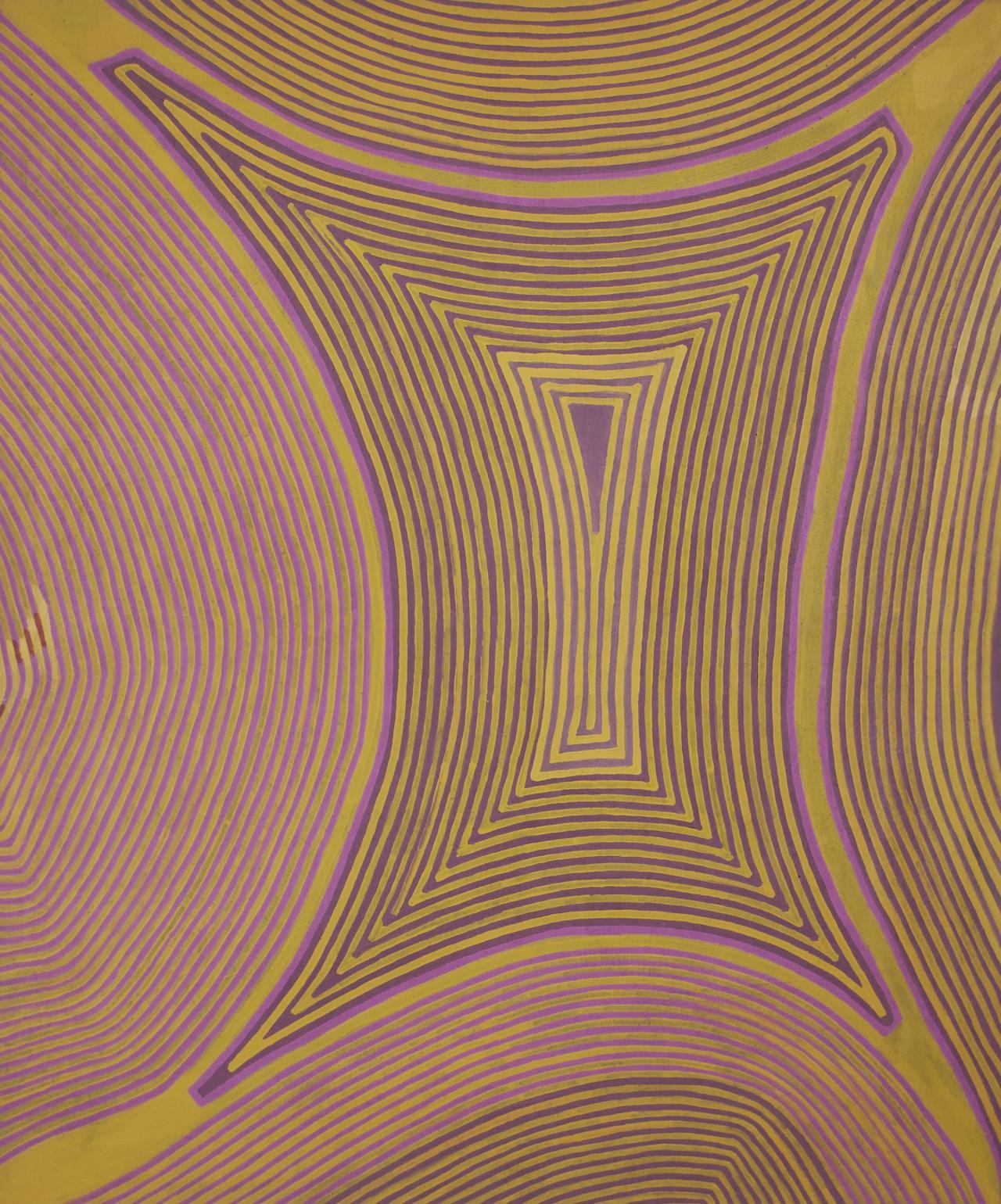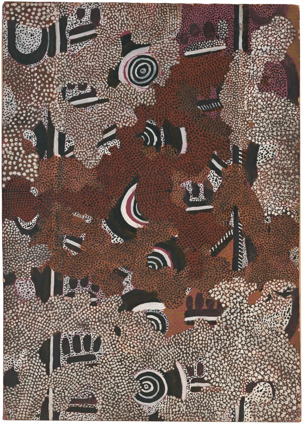One of the later arrivals at Papunya from country to the west, Anatjari had just come into the full powers of ritual maturity. He began painting in 1971 and immediately distinguished himself among the other artists as a highly skilled painter who produced elaborate and carefully planned depictions of ceremonial objects and designs. During the 1970s he made a successful transition to large canvas and painted particularly strongly in the late 1980s, when moving between homeland centres of Kiwirrkura and Tjukurla that were closer to his birthplace, Kurlkurta.