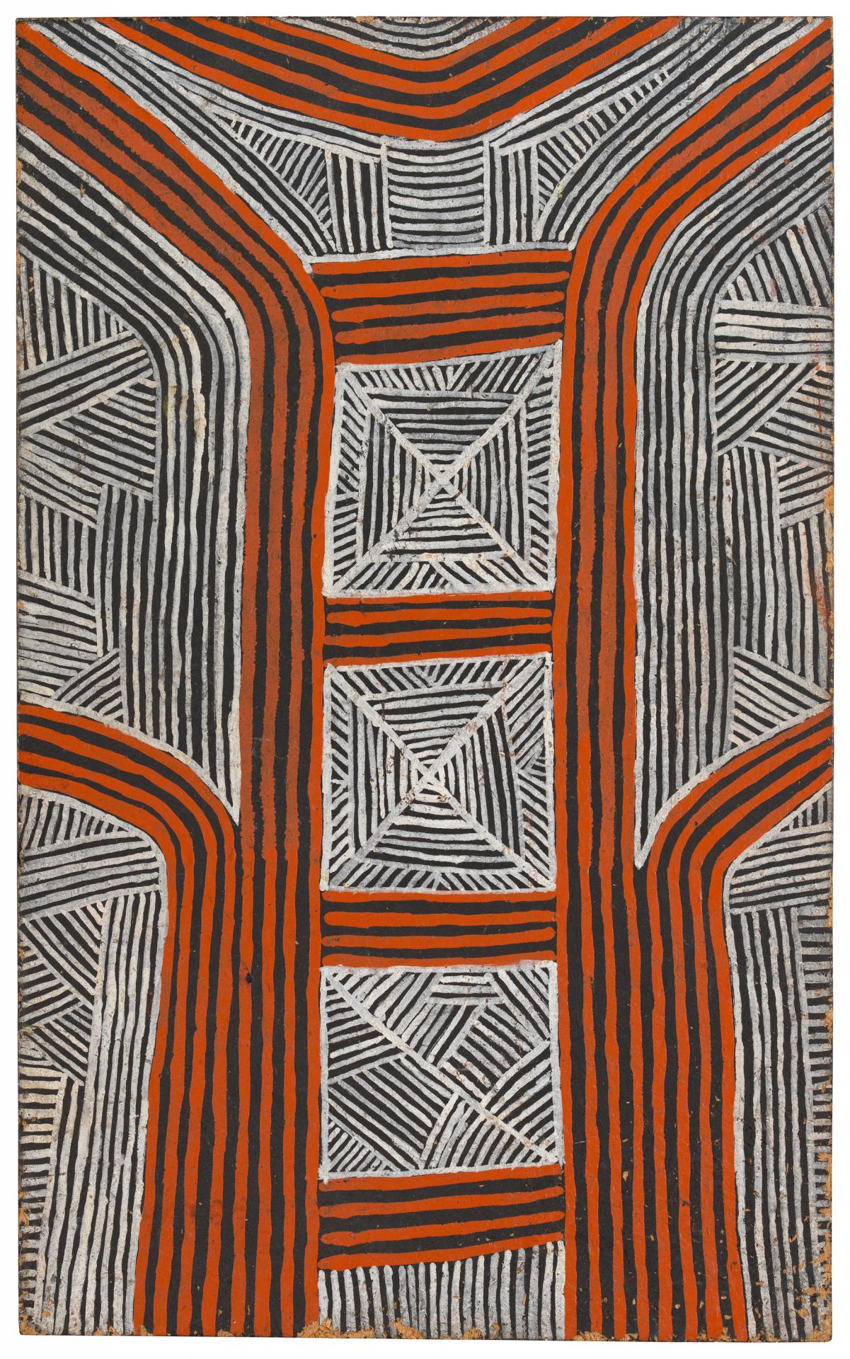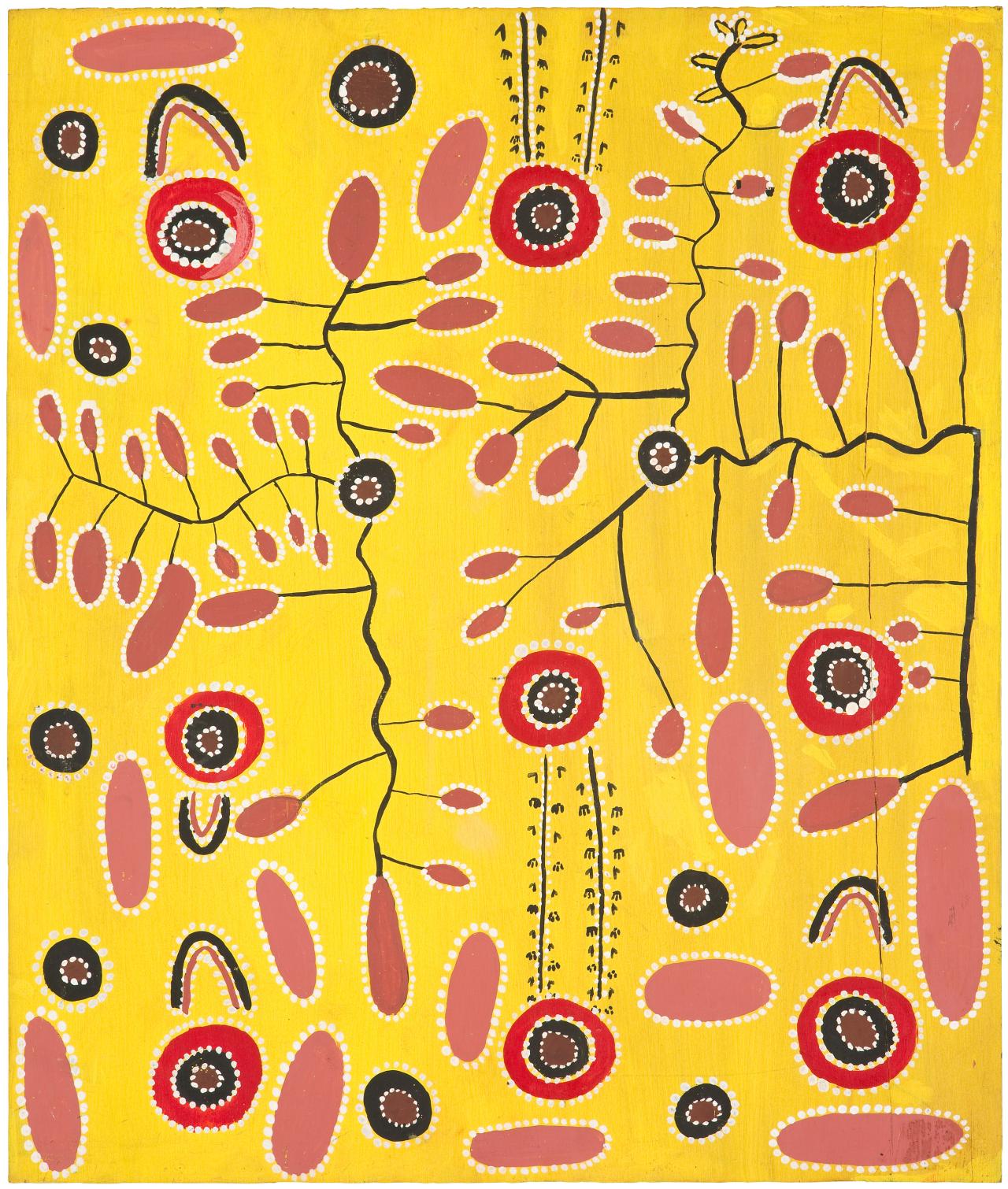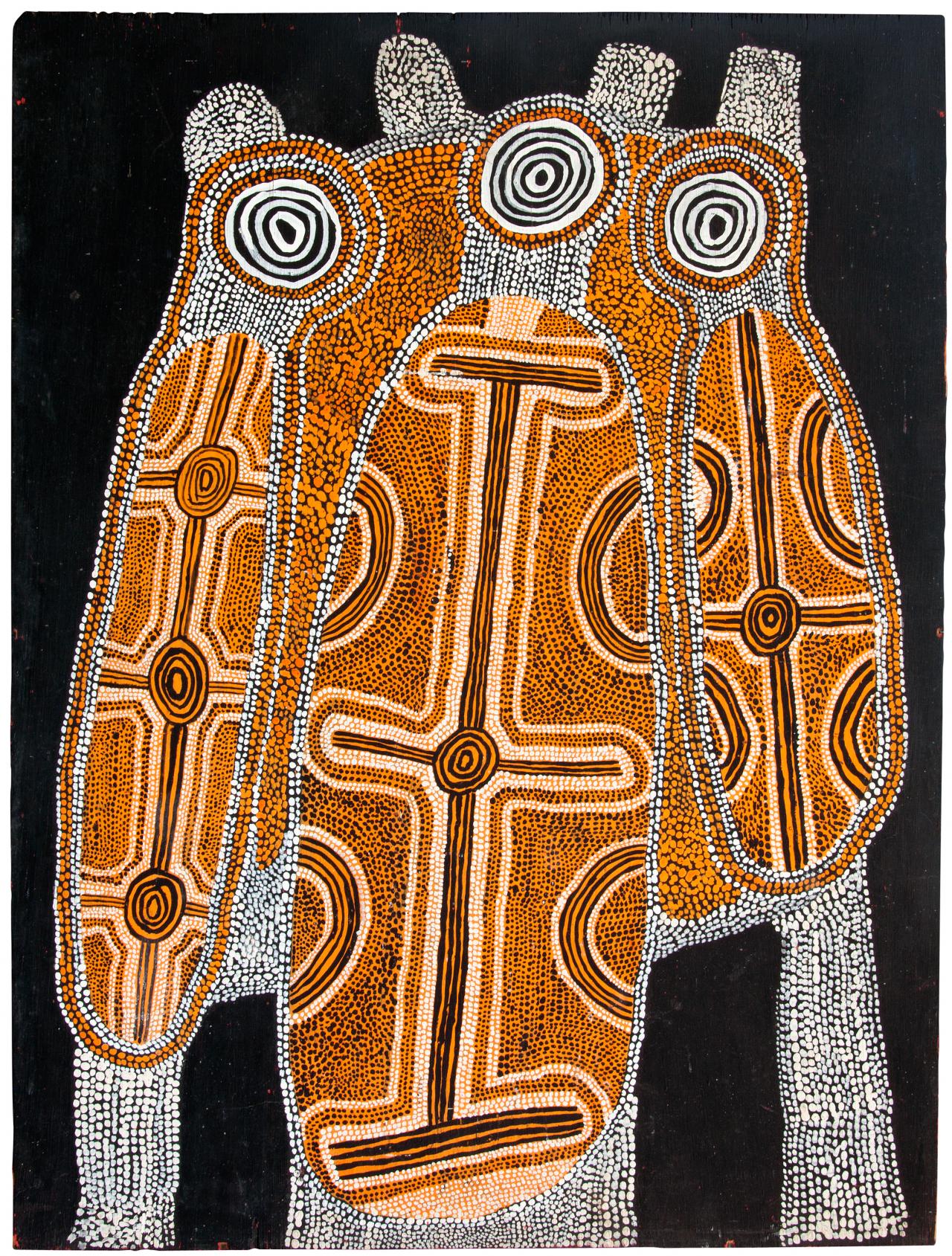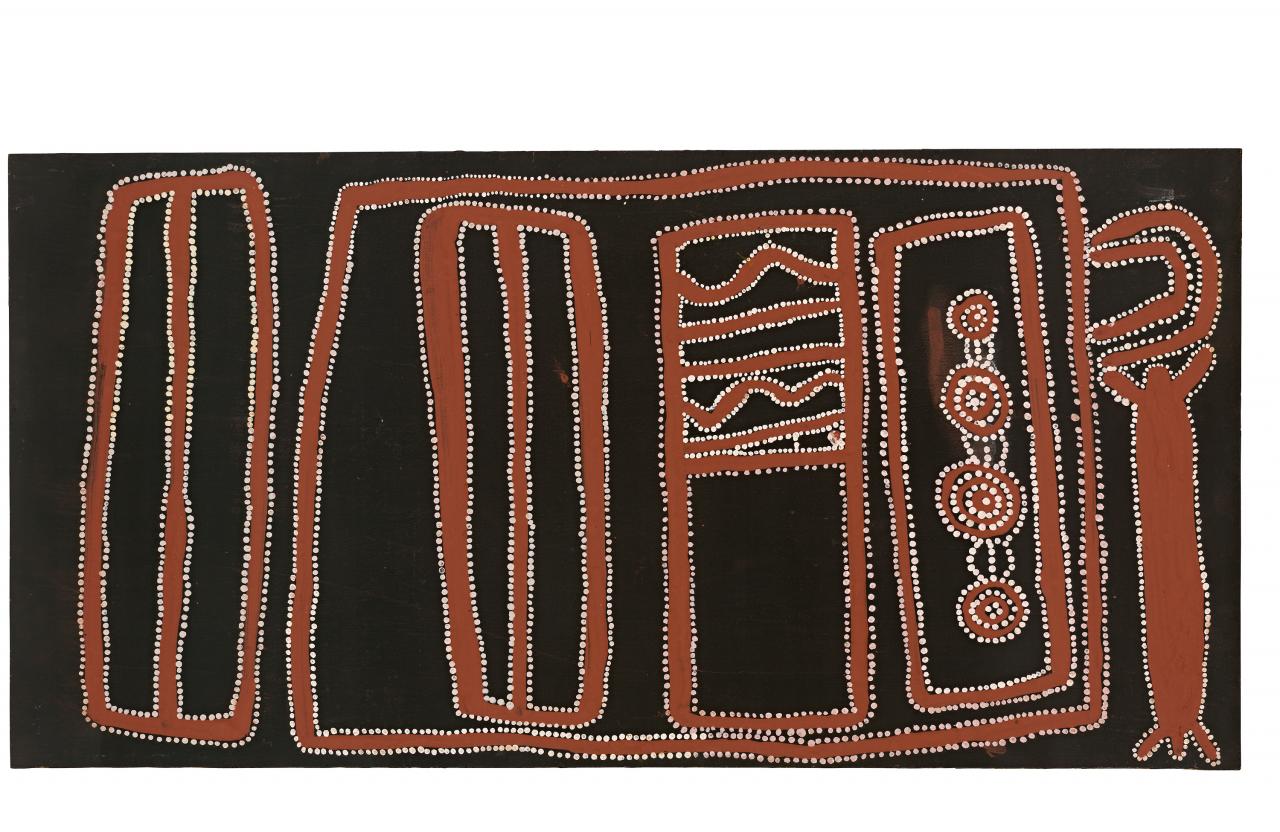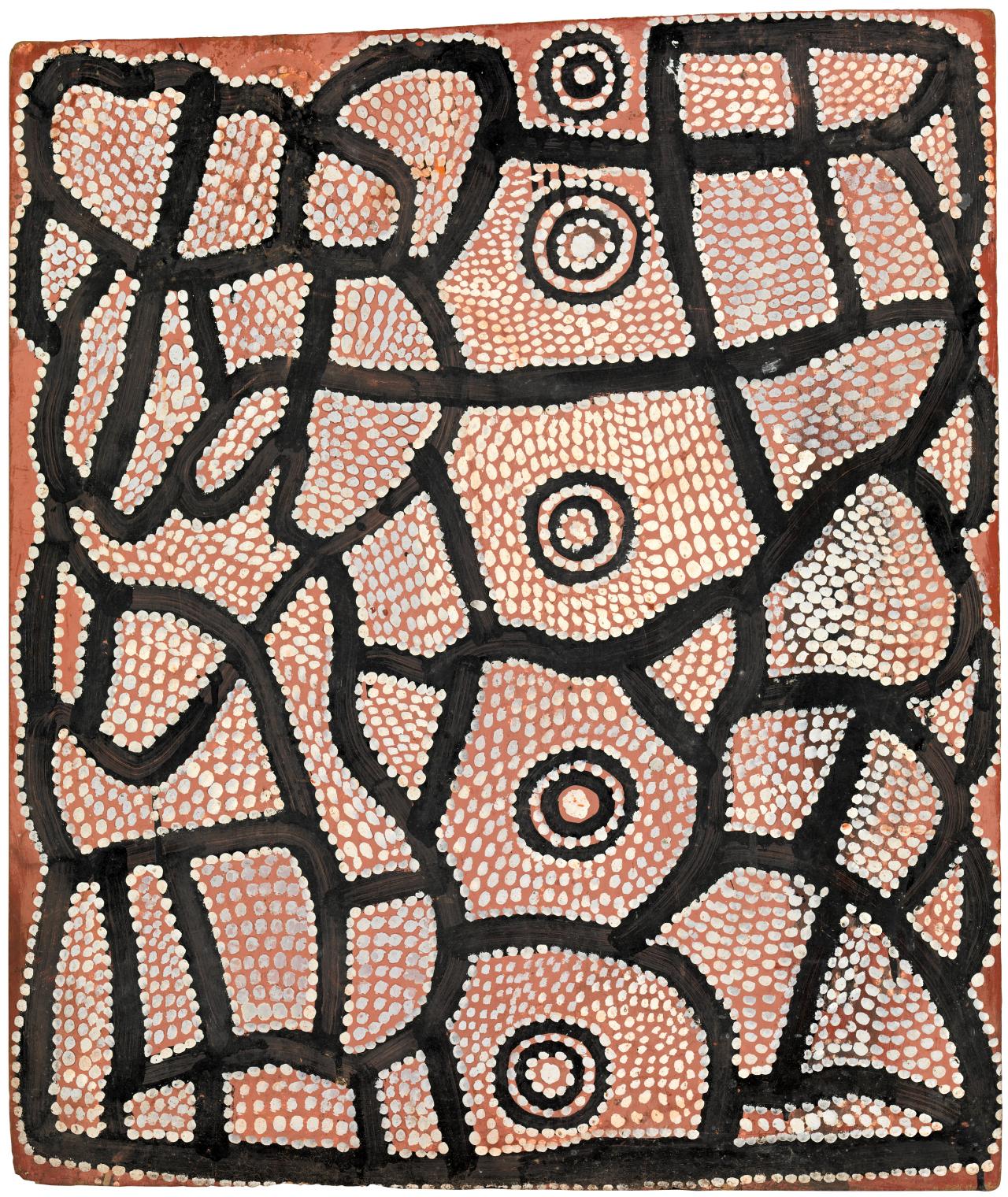 One of the later arrivals at Papunya from country to the west, Anatjari had just come into the full powers of ritual maturity. He began painting in 1971 and immediately distinguished himself among the other artists as a highly skilled painter who produced elaborate and carefully planned depictions of ceremonial objects and designs. During the 1970s he made a successful transition to large canvas and painted particularly strongly in the late 1980s, when moving between homeland centres of Kiwirrkura and Tjukurla that were closer to his birthplace, Kurlkurta.