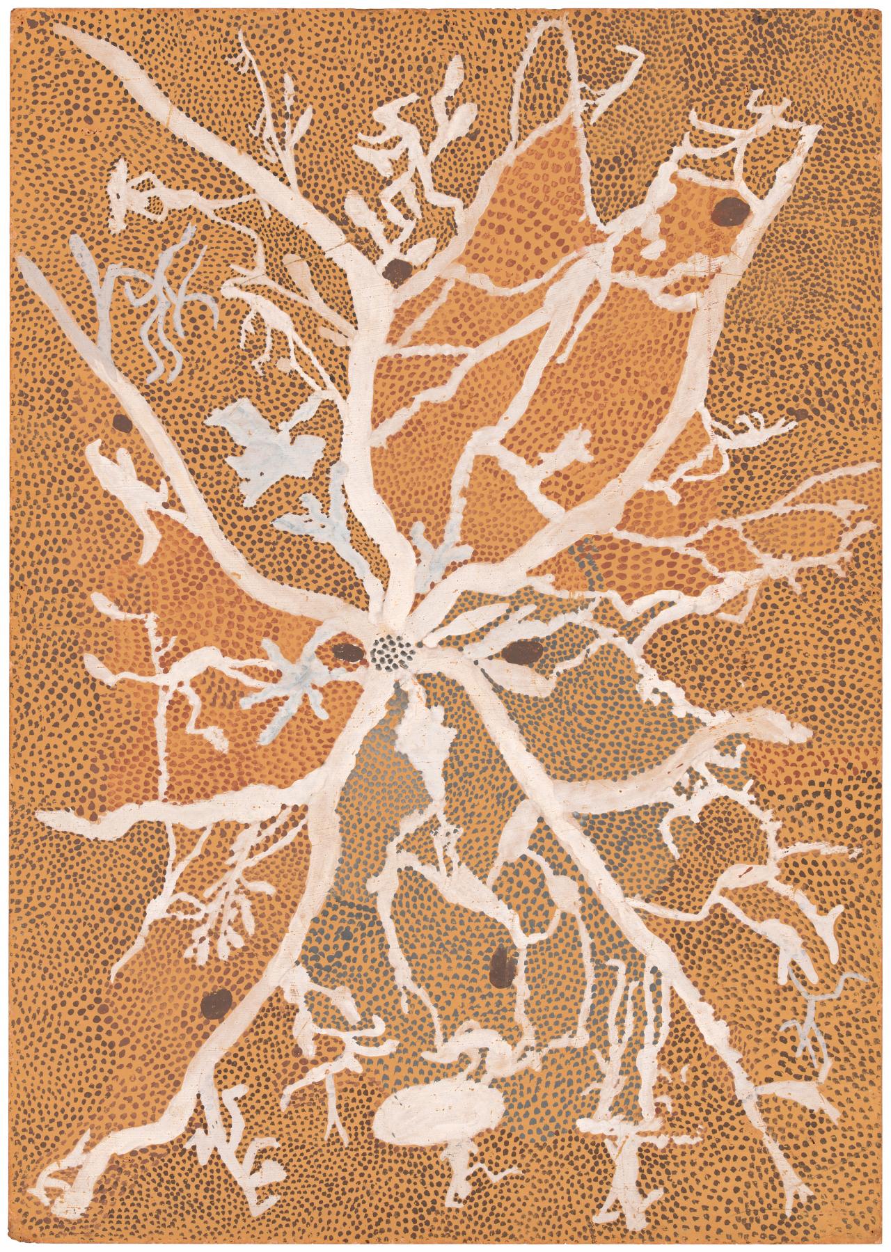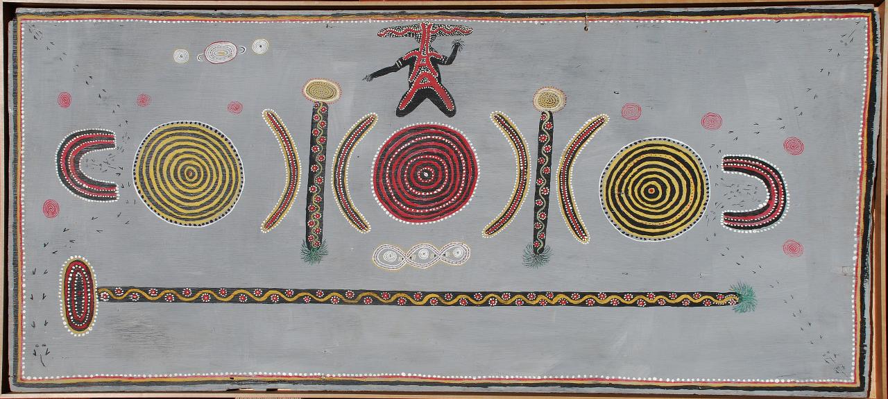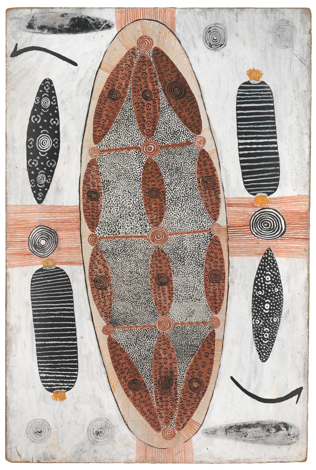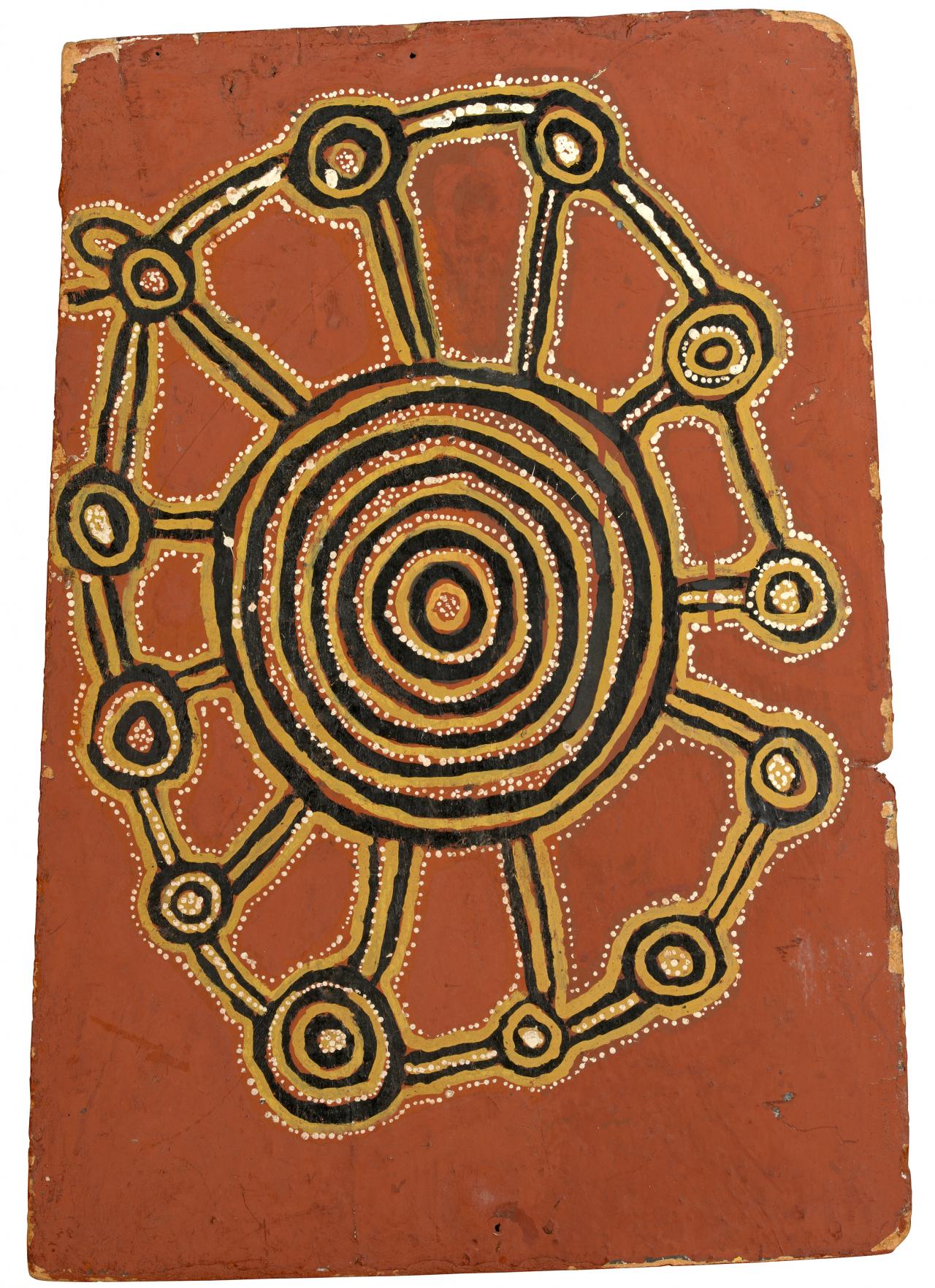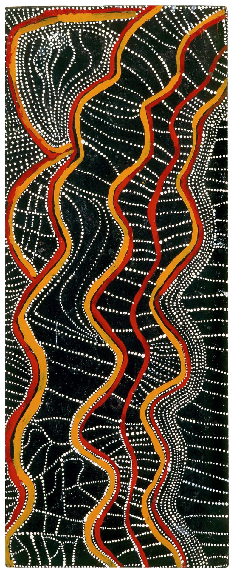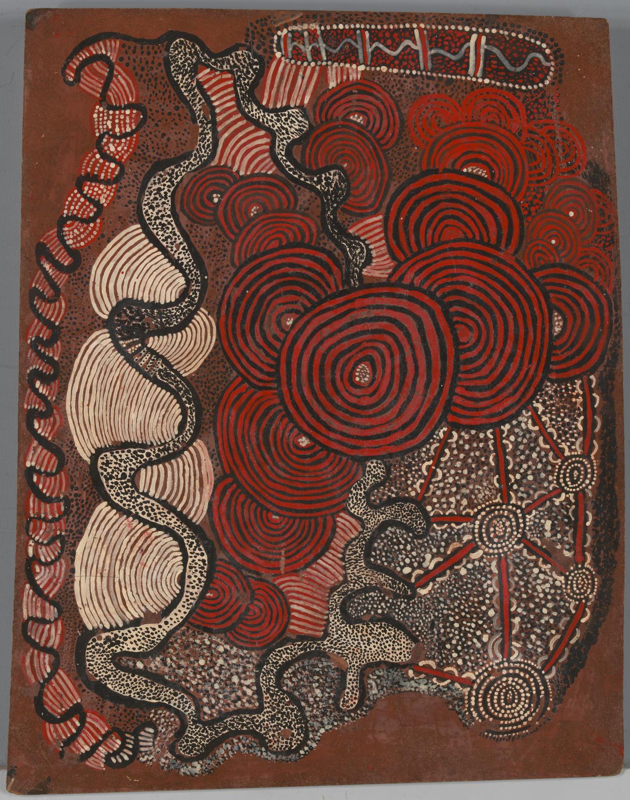 One of the later arrivals at Papunya from country to the west, Anatjari had just come into the full powers of ritual maturity. He began painting in 1971 and immediately distinguished himself among the other artists as a highly skilled painter who produced elaborate and carefully planned depictions of ceremonial objects and designs. During the 1970s he made a successful transition to large canvas and painted particularly strongly in the late 1980s, when moving between homeland centres of Kiwirrkura and Tjukurla that were closer to his birthplace, Kurlkurta.
