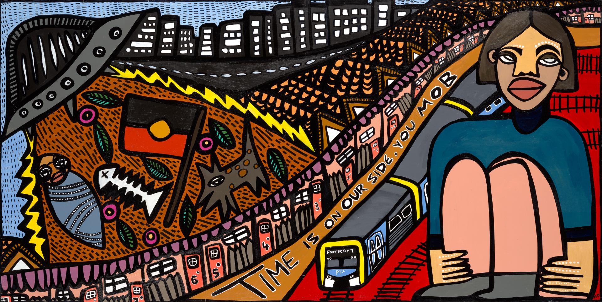 In 2017 I was elected to be the first female prime minister of the national Indigenous parliament. As well as my painting, I do a lot of social activism within my community and take influence from political leaders such as the Aboriginal Tent embassy’s founder Gary Foully and revered land-rights campaigner Eddie Mabo. This kind of social advocacy inspires me and bleeds into my painting, shaping its political style and commentary.