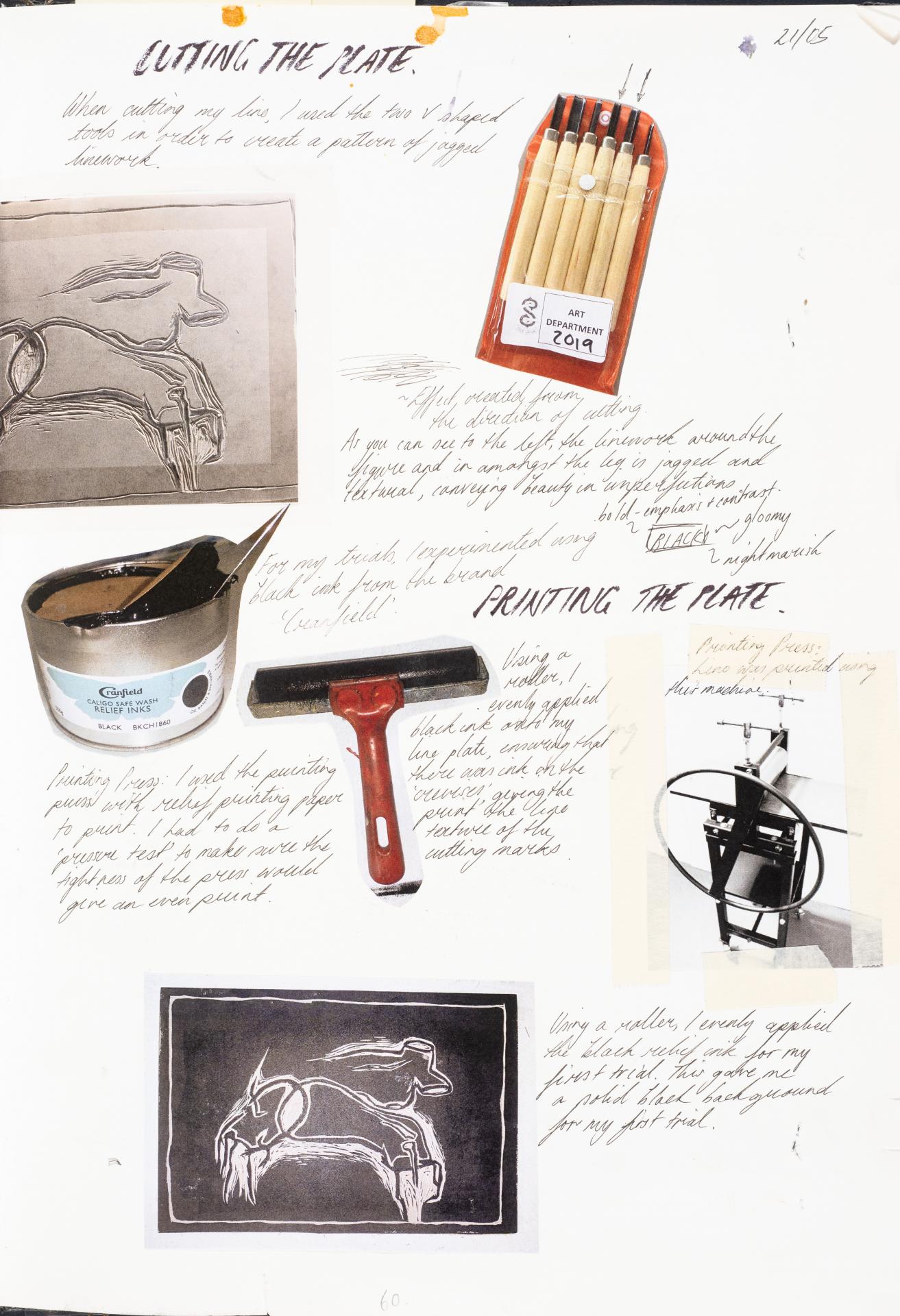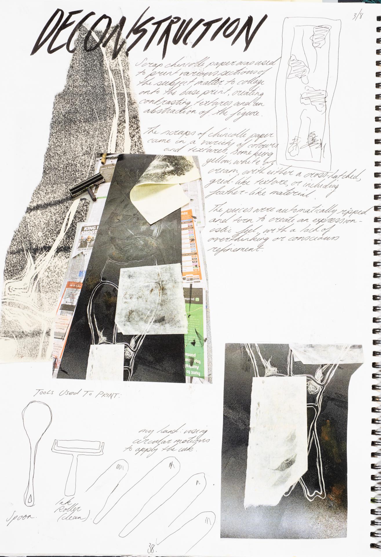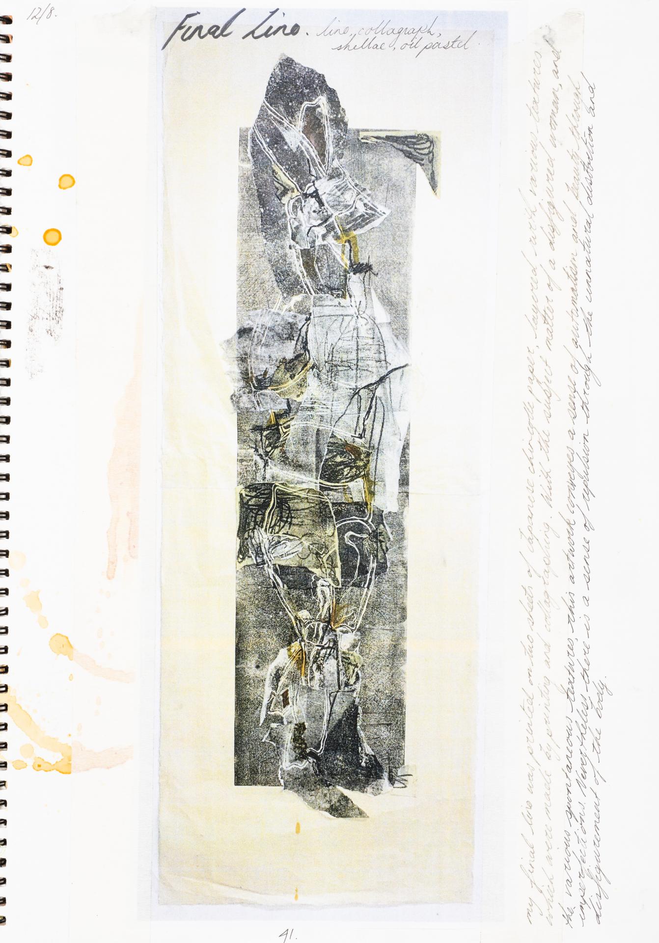 Inspired by the ideology of the Surrealist art movement which was interested in the liberation and appreciation of subconscious thoughts, my collaged print A body, 2019, aims to generate discomfort and abhorrence through its grotesque imagery and disfigurement. This was manifested through the female figure, with distortion being a reference to beauty in imperfections. The most disturbing quality of the lino print may be the confrontation experienced by the viewer with a life-size form, who is objectified by removing the face and personality. As my concept evolved, the imagery provided a commentary about the judgemental and restrictive culture of the twenty-first century, which champions a refined and sanitised aesthetic, tending to shun strange ideas.