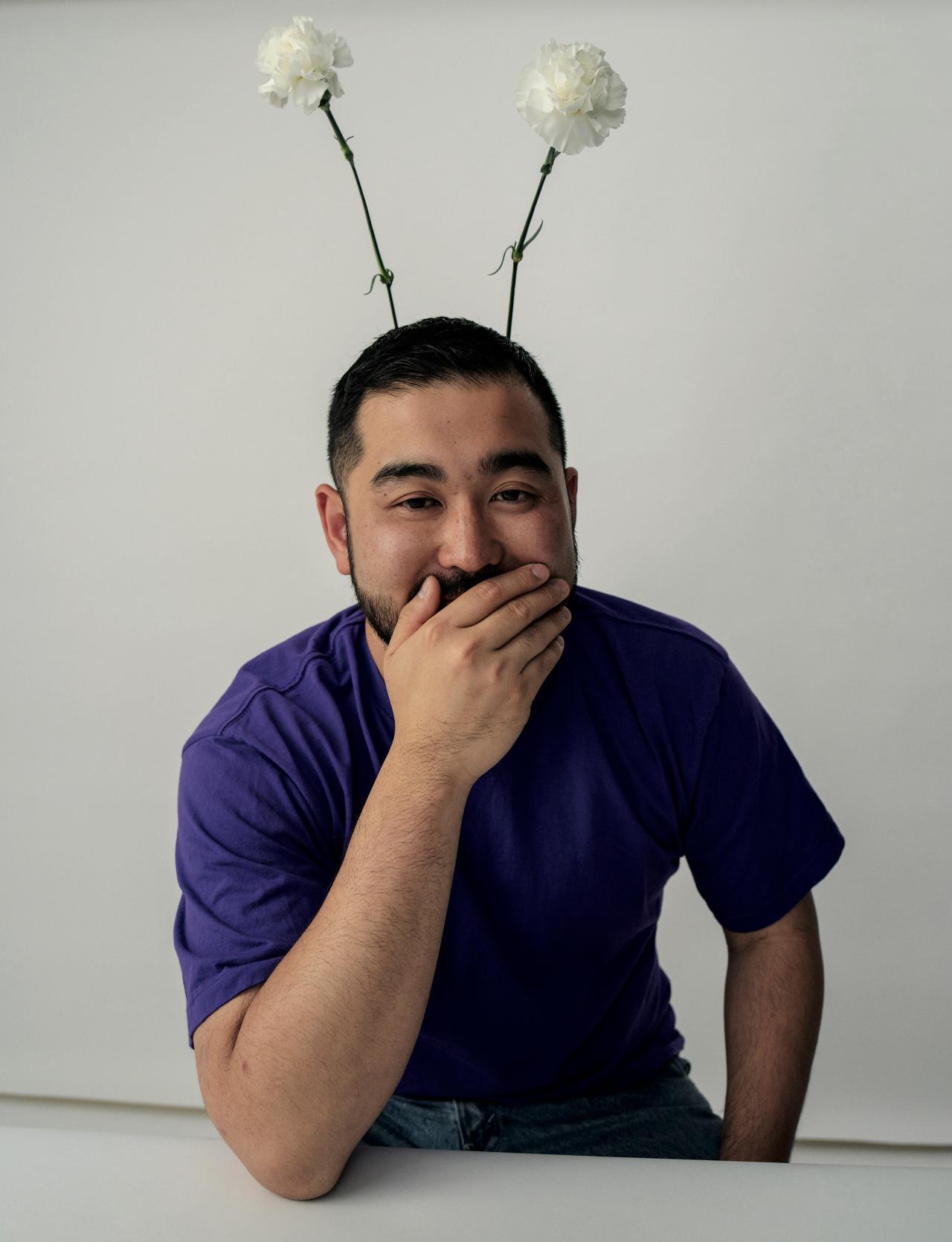 Atong Atem uses photography and video to explore migrant stories and post-colonial practices in the African diaspora. She has an ongoing interest in photography and portraiture as a vehicle to express culture and identity. The photographs featured in NGV Triennial are from an early series of portraits created by the artist. These works not only explore the various experiences and identity of Atem and her friends but also draw on the history of studio photography in Africa, most notably the practice of renowned photographers Malick Sidibé and Seydou Keïta, who were active in Mali in the 1960s. Atem’s photographs are all staged studio portraits. In each of the images her subjects are photographed against brilliantly coloured backdrops, and her sets are further decorated with intricately patterned fabric, furniture and abundant bunches of flowers, resulting in a riot of colour and pattern.