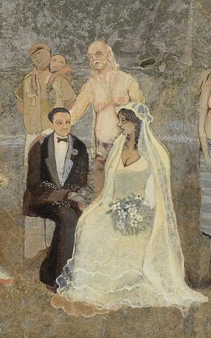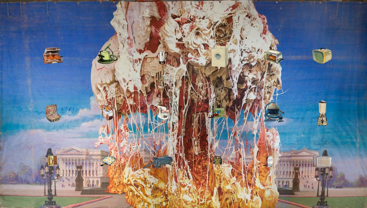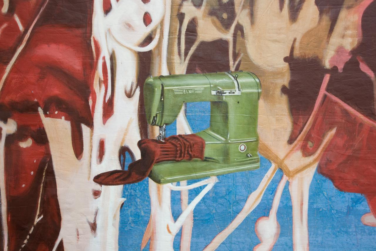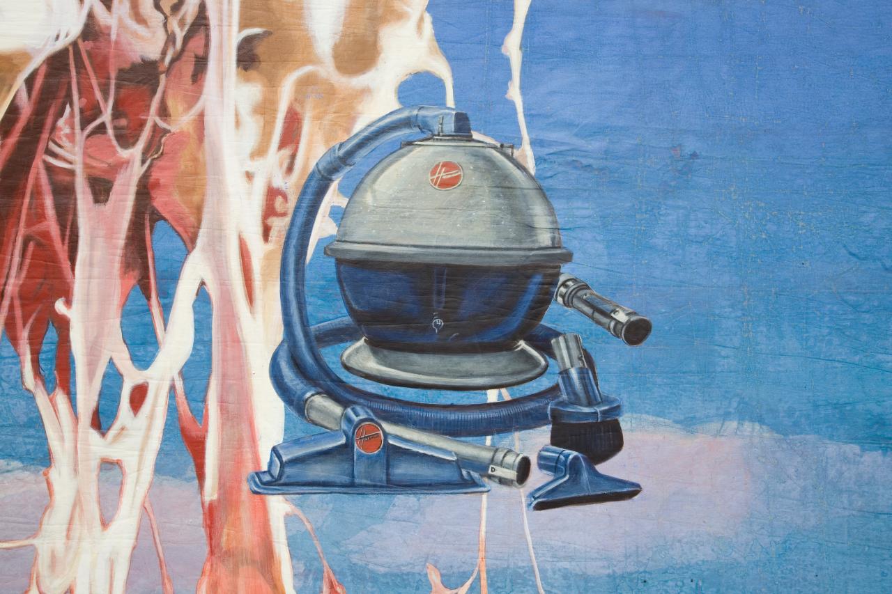The imagery – almost a disintegration of the parts of a vehicle – evokes automotive mechanism, as well as organic and bodily forms. Through depictions of engine parts, exhaust pipes, a shell, a male driver caught by a traffic camera on his phone, and decorative patterns and flourishes, the painting draws associations between automation, gender and sexuality.