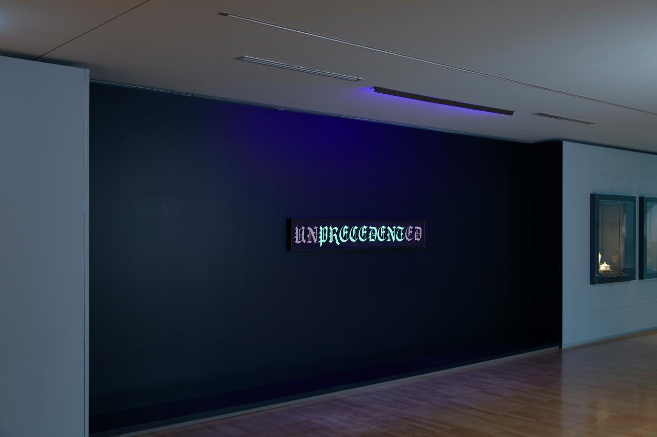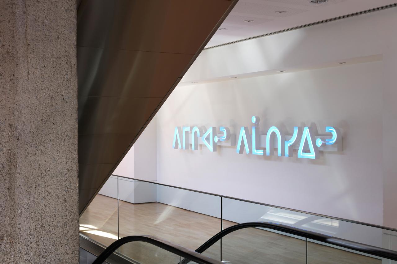 Joi T. Arcand’s new media installation pimiciwan pimatisowin 2020 marks the first time a Cree contemporary artist has had their work enter the NGV Collection. Featuring a blue neon sign set back into a wall cavity, the work draws attention to the loss of Indigenous languages in Canada by creating a hyper visible sign using Cree syllabics. Arcand uses this approach to declare that the language wasn’t ‘lost’, but was instead taken, and Cree people are now here to reclaim it. The work will resonate powerfully in Australia where Aboriginal and Torres Strait Islander people share a similar history with regard to loss of language and culture by way of colonisation. Sometimes Arcand intentionally does not provide translations for her work so as not to give audiences the immediate satisfaction of understanding the word. Instead, she forces them to take the time to look up the word and learn some Cree language on the way. For NGV Triennial, Arcand has decided to provide a translation of the Cree language used – her neon sign translates roughly to ‘the flow of life’.