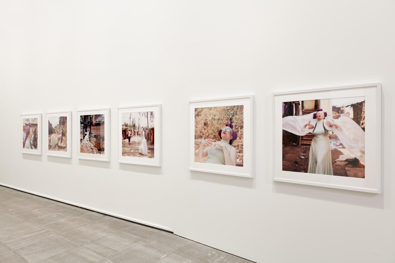 The photographs in Sarah Waiswa’s 2016 series Stranger in a familiar land are staged portraits of an albino woman, Florence Kisombe, captured within the Kibera slums in Kenya. The photographs oscillate between seemingly documentary images of Kisombe interacting with local people, and highly staged, surrealist-inspired photographs of the woman set in the rough, urban landscape. Working closely with the model to choreograph each scene, Waiswa’s images convey the cruel realities of a woman being rejected because of her physical appearance within her own country. Describing her model, Waiswa wrote: ‘[Kisombe] is very outgoing, wants to be a model, and I knew she would be perfect for the project. The concept of Stranger in a familiar land groups together various portraits of an albino woman set against the backdrop of the Kibera slums, which are a metaphor for my turbulent vision of the outside world. The series also explores how the sense of non-belonging has led her to wander and exist in a dreamlike state. People notice Kisombe, but at the same time, they don’t.’