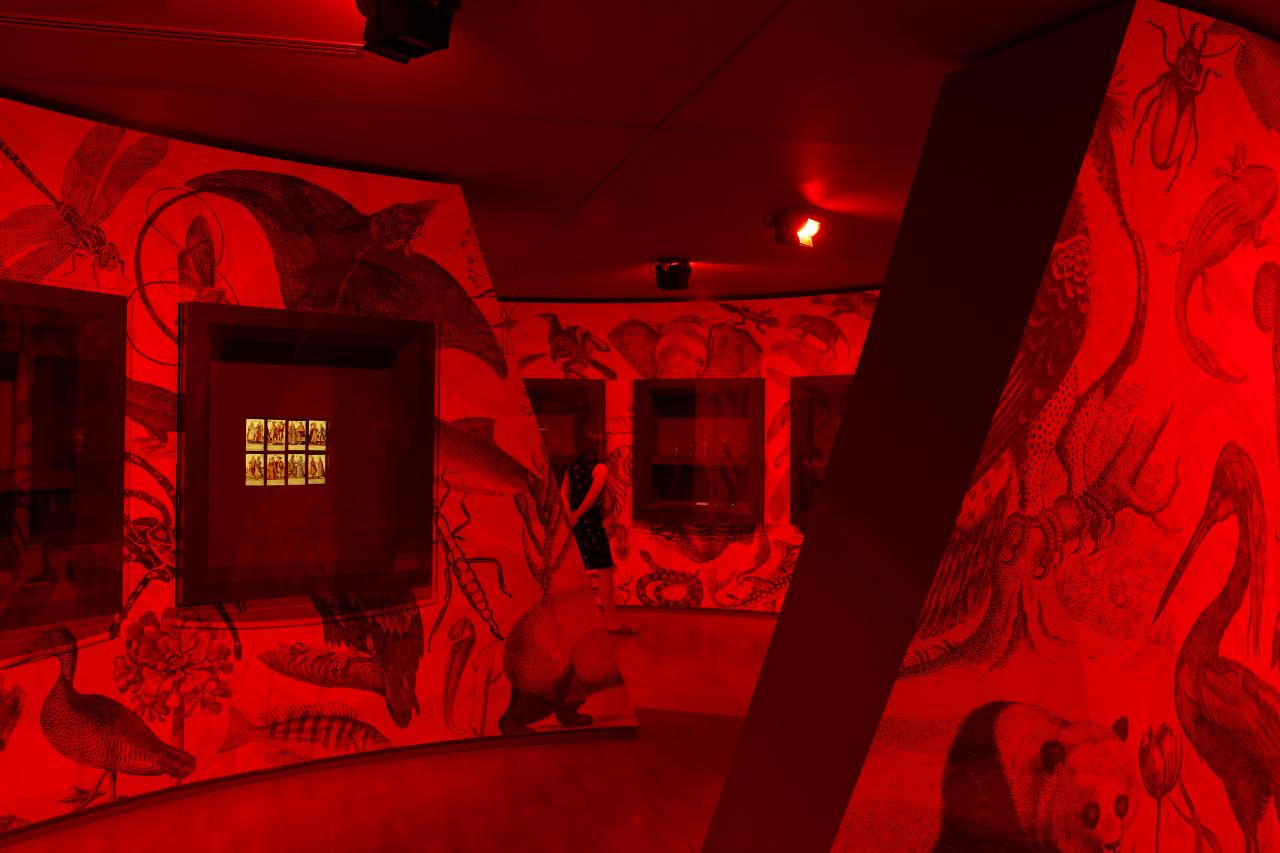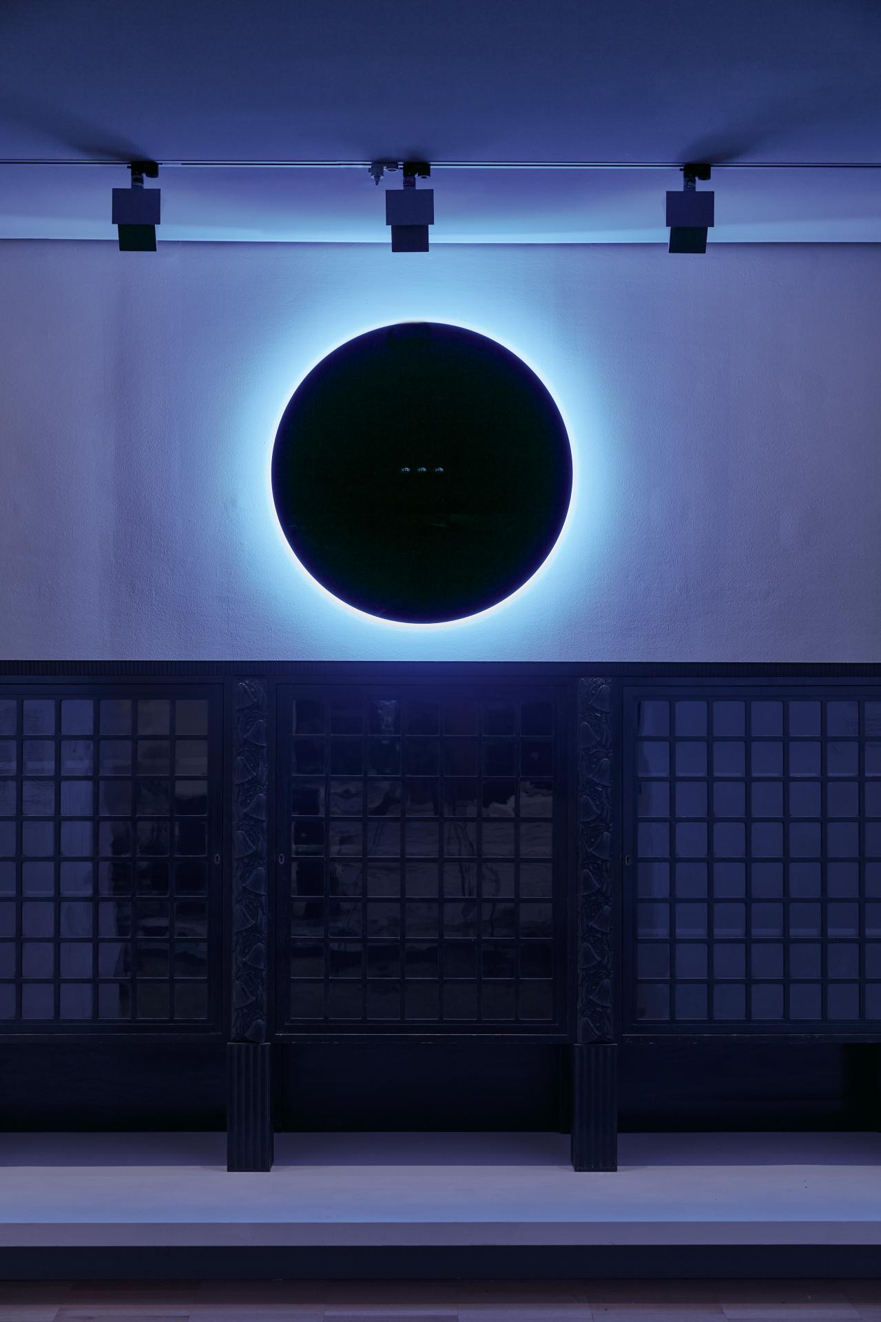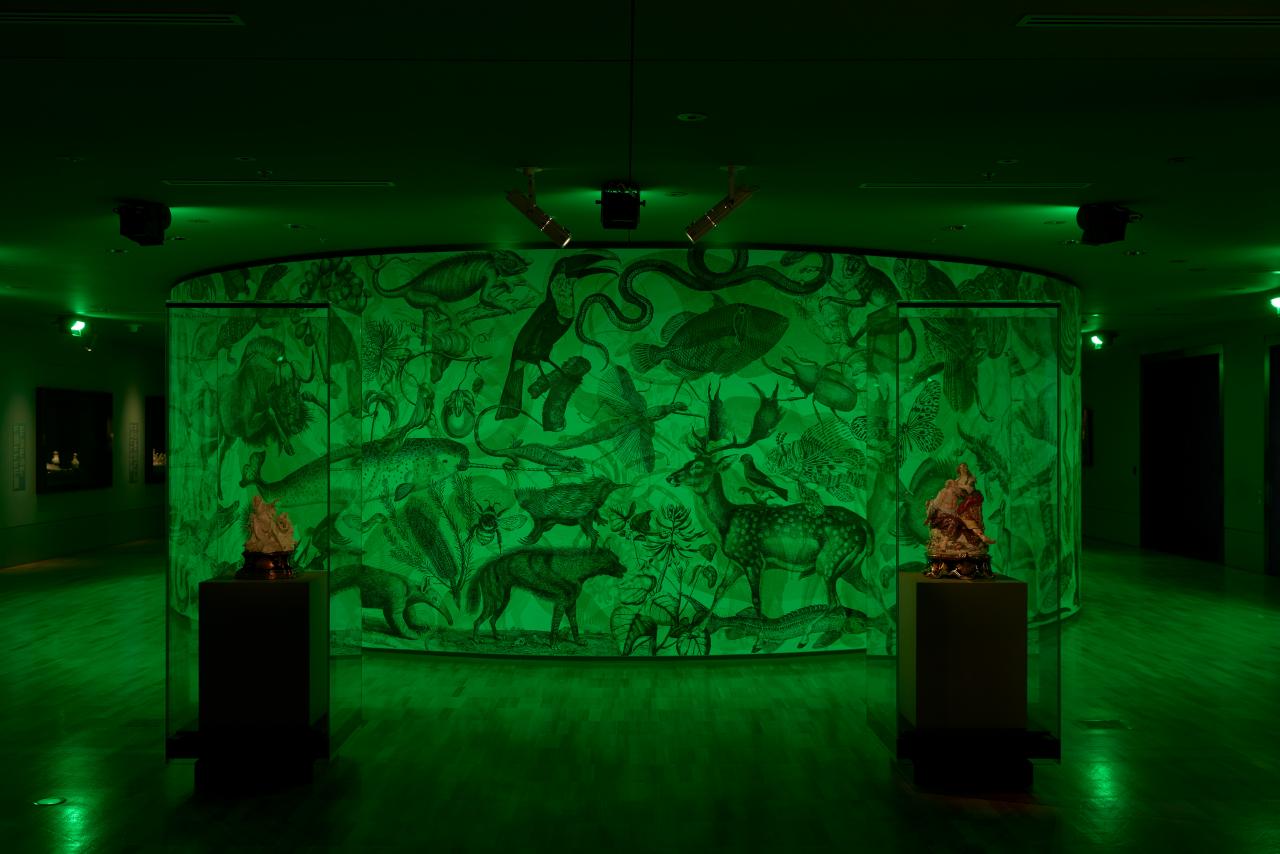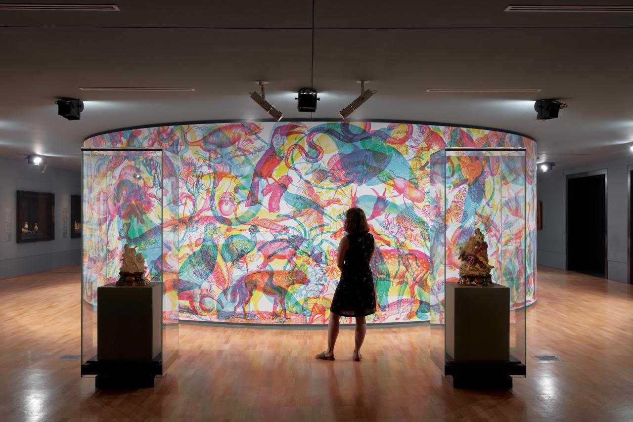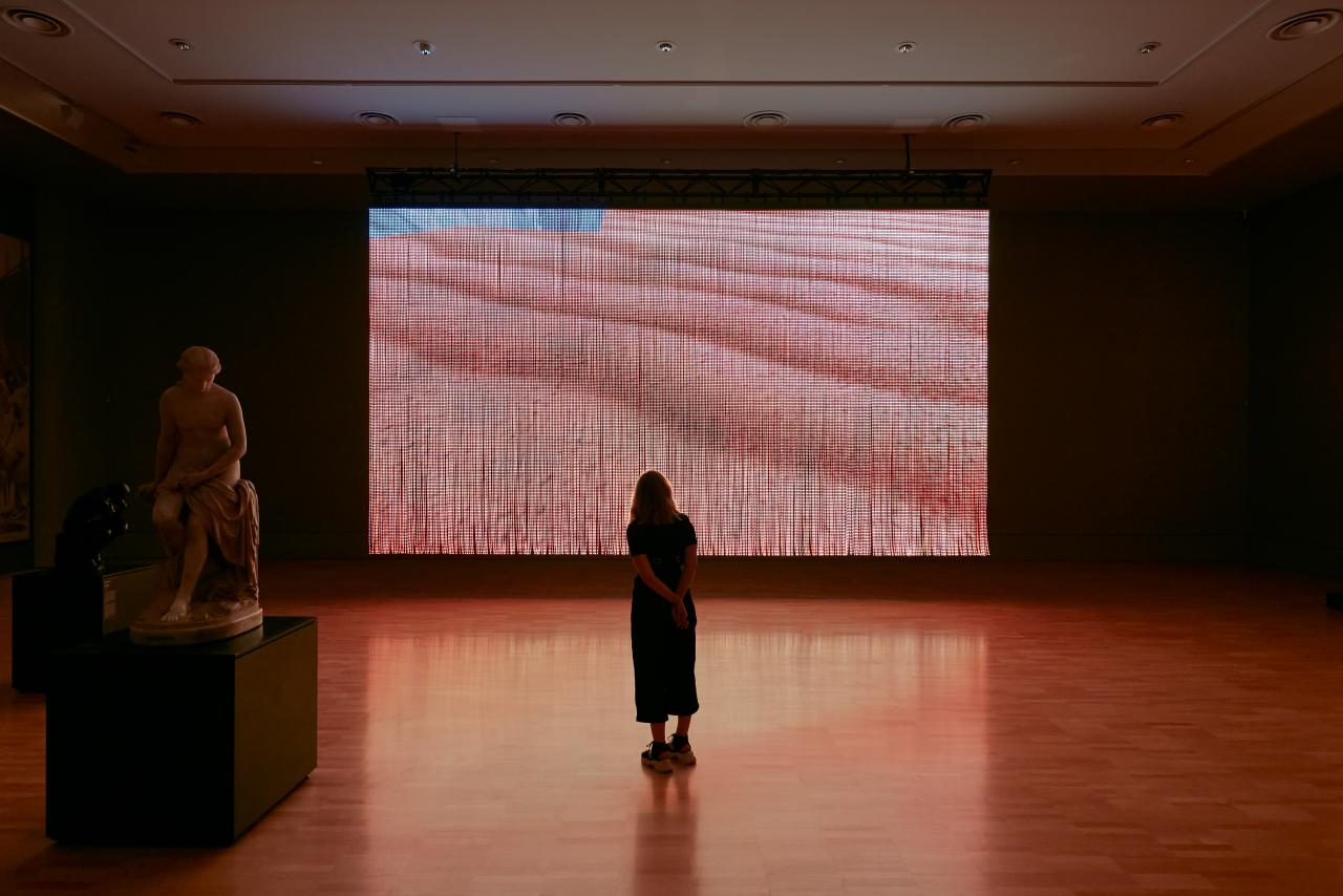 Presented in the 19th Century galleries Solaris 2020 is a mural-sized LED curtain screening a spectacular, luminous ecosystem populated with blooms of jellyfish. Created with a computer program commonly used in video game platforms, the screening presents a digital simulation of a unique marine environment – a landlocked body of salt and rainwater formed over 11,000 years ago, located off the coast of Kalimantan, Indonesia. Predator-free and able to thrive in warm waters, these jellyfish species have evolved differently, providing scientific communities with a living laboratory for studying the potential effects climate change may have on marine systems.