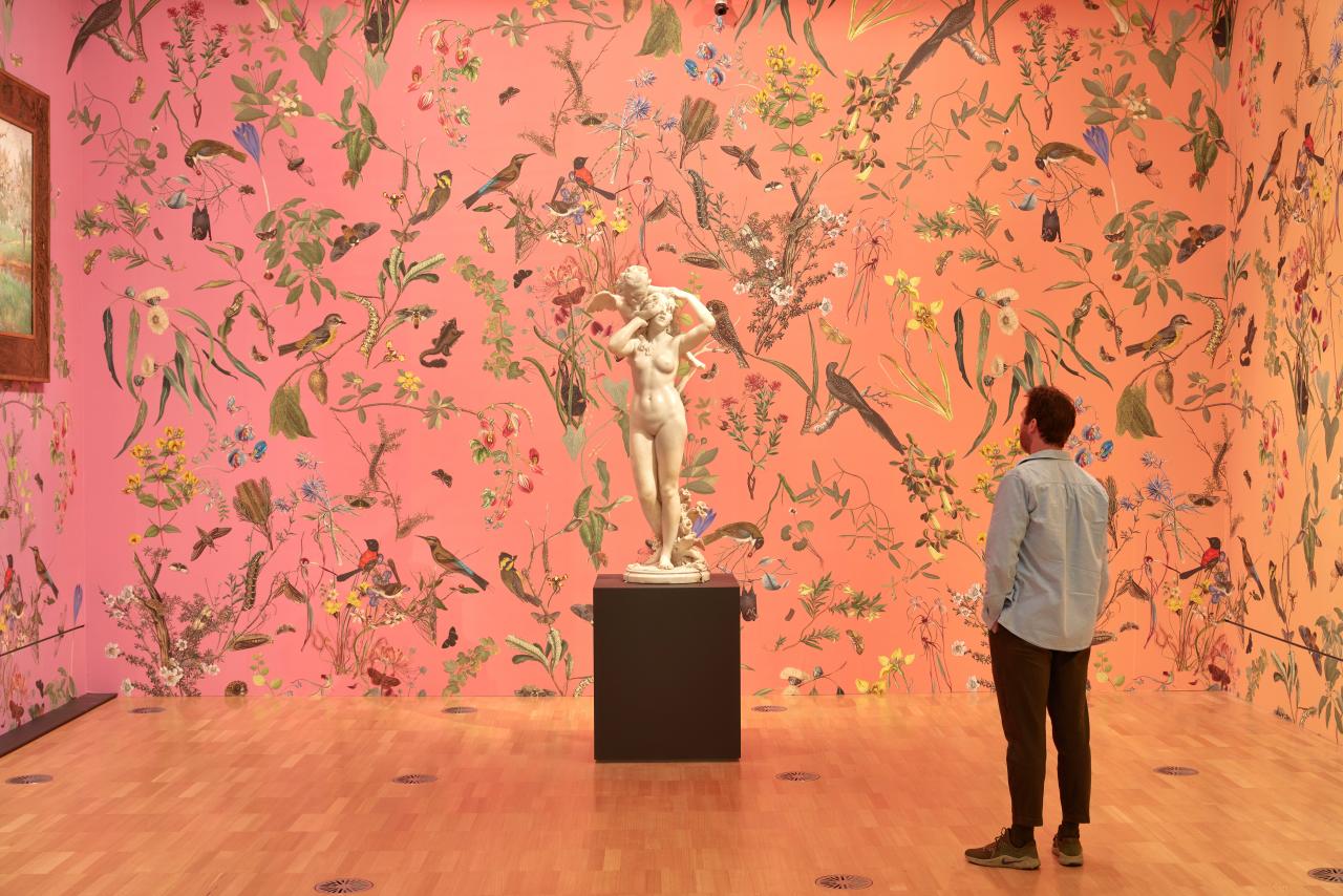 Drawing from real-time weather data from the lake, elements in the simulated world respond to weather changes – wind speed moves the camera across the undulating terrain, temperature readings affect the size and number of jellyfish, and cloud cover and UV readings alter the colour palette of the environment. Situated in a room flanked by similarly large-scale artworks depicting subjects and large-scale events relevant to the 19th century, this contemporary work provides viewers with a virtual forecast of what is arguably one of the most significant events currently affecting the planet today.