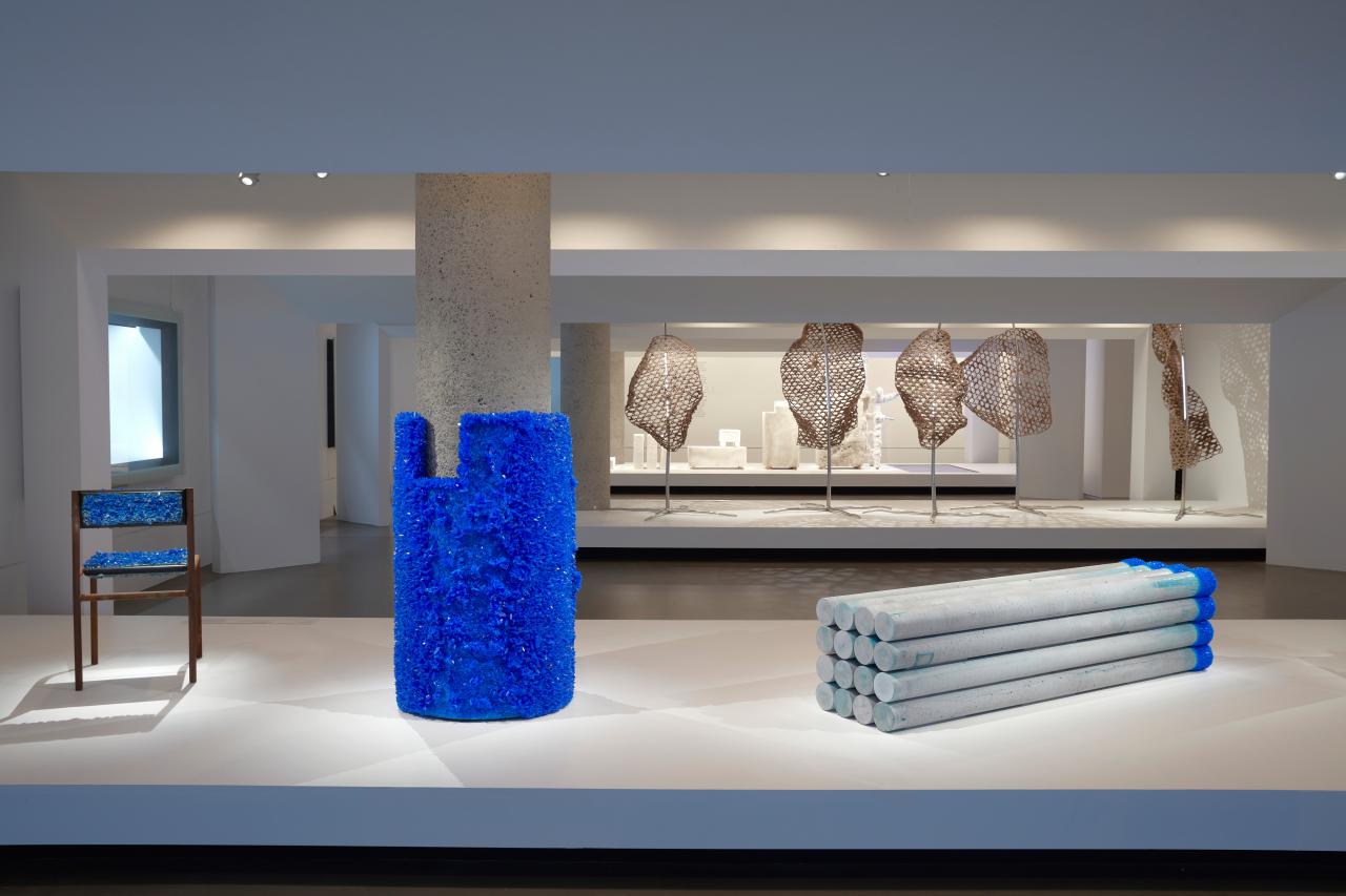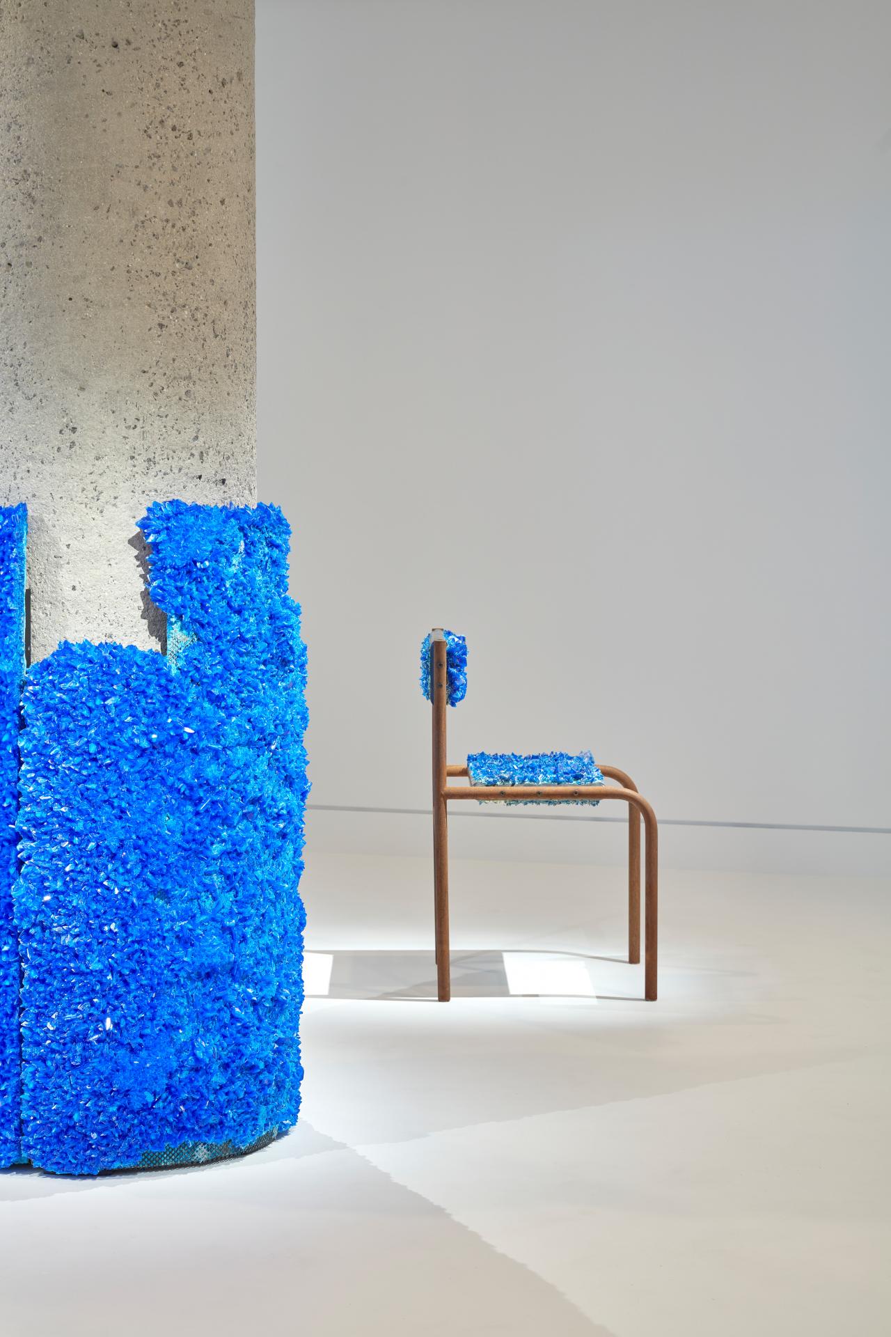 Designing and making uncommon furniture and objects from ordinary chemicals and materials, Elliot Bastianon’s crystal encrusted works contribute to a display of speculative design projects that look to systems and processes found in nature to communicate ideas of order, disorder and entropy. Comprising new works Cylinder bench seat 2020, Column 2020 and Chair from the Growth Site series 2018, Bastianon submerges his steel and concrete designs in a copper sulphate bath to encourage the propagation of dazzling blue crystals. Taking hold, the crystallization process is directed by the designer with the use of extraneous apparatus and tools. The crystal growth appears to render the furniture and objects dysfunctional, while introducing striking aesthetic features that remind us intellectually of nature’s own inherent and recurrent ability to create, adapt and colonise. The works open the proverbial door to rethinking this intersection between human-centric design and the natural systems of our planet that enable people and societies to exist.