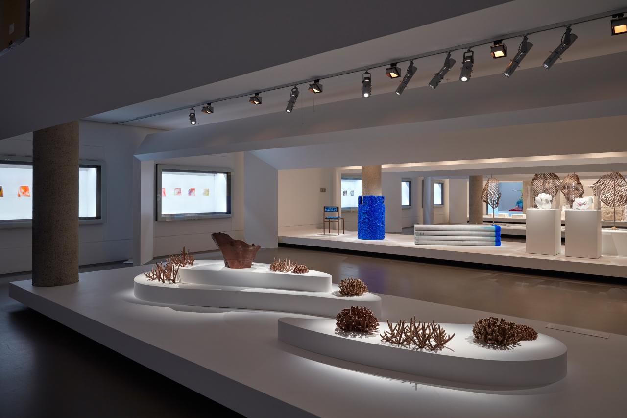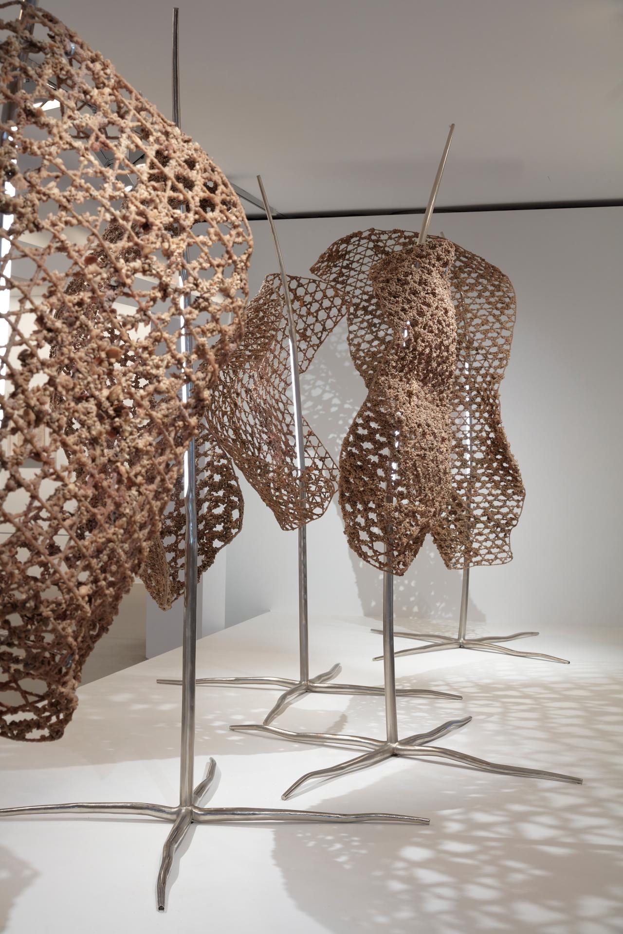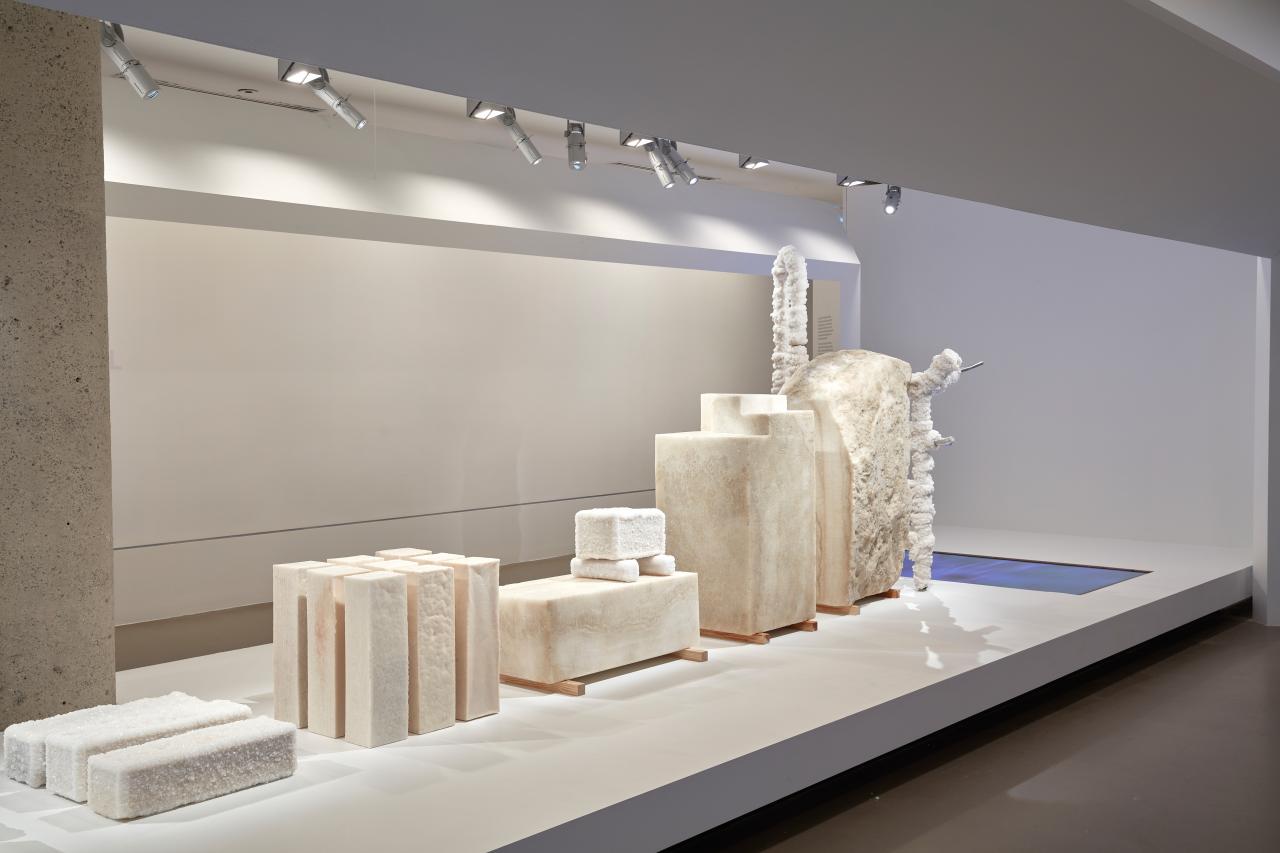 In her 2016 series consisting of a brooch and three necklaces, Naama Bergman’s collection of salt jewellery is presented alongside a display of design projects that harness natural processes of emergence, growth, and decay to draw attention to the constant cycles of change that shape our lives. Inspired by her experiences relocating from Israel to Germany, Bergman began experimenting with materials and aesthetics of preservation to reflect the morphology of identity – particularly how identities are formed collectively and individually, and how migration and the passage of time can reshape the way people see themselves and others. To create each piece, Bergman delicately weaves strands of iron wire into a fine mesh which is formed over a mould to create voluminous, three-dimensional forms. The piece is then submerged in a concentrated salt solution which catalyses he process of simultaneous growth and decay that is central to her practice. As the salt crystallises along the surface of the mesh, the interaction of materials begins digesting the iron. When the piece is removed from the solution and exposed to air, the salt begins its own process of decay. In creating unstable jewellery pieces based on transient materiality, Bergman sets up a confrontation between preservation and decomposition, and questions the power, function, and mutability of medium and form.