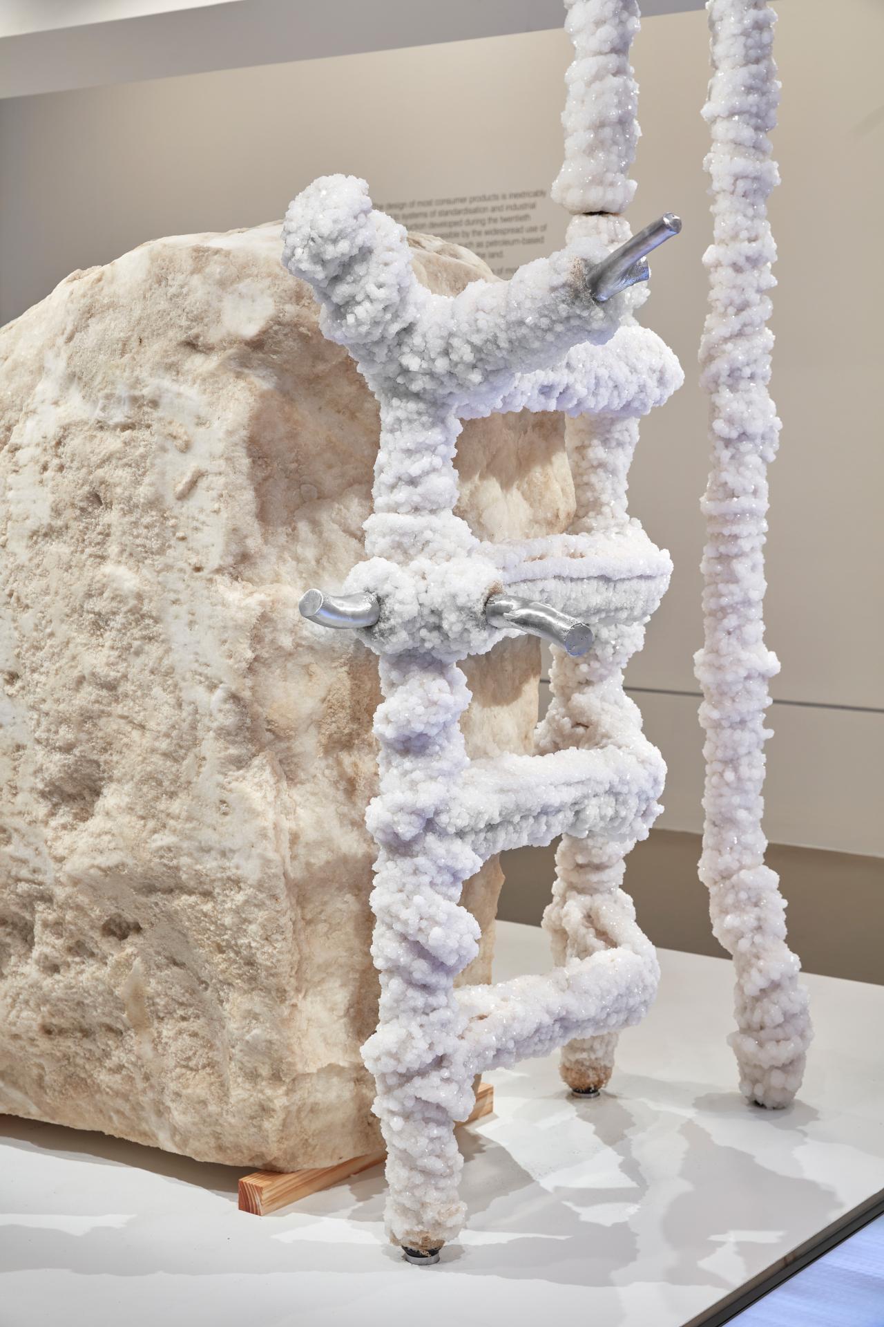 Lukas Wegwerth’s works Crystallization 152 2019 and Crystallization 146 2019 repurpose existing ceramic vessels by transforming them into hosts for the growth of salt crystals. Submerging the vessels in a chemical solution, cracks and chips are slowly colonised by crystal formations over time. Wegwerth monitors the crystal’s growth and intervenes to manipulate the path and size of the crystal structure. The process Wegwerth applies to his vessels references the 15th century Japanese art of fixing broken pottery called Kintsugi or ‘golden repair’. Here lacquer dusted with powdered gold, silver, or platinum is applied to the cracks of a ceramic vessel. Kintsugi is also related to the Japanese concept of mottainai, which encapsulates a sense of regret when something is wasted. This sense of regret broadly acknowledges that all objects, broken or not, have an intrinsic value — a sum of natural resources, energy and human capital. For Wegwerth, restoring the ceramic vessels using the crystallization process symbolises the interdependence of the human made environment with the natural. Recognising that we are a part of, and not separate from nature, is central to charting a sustainable future.