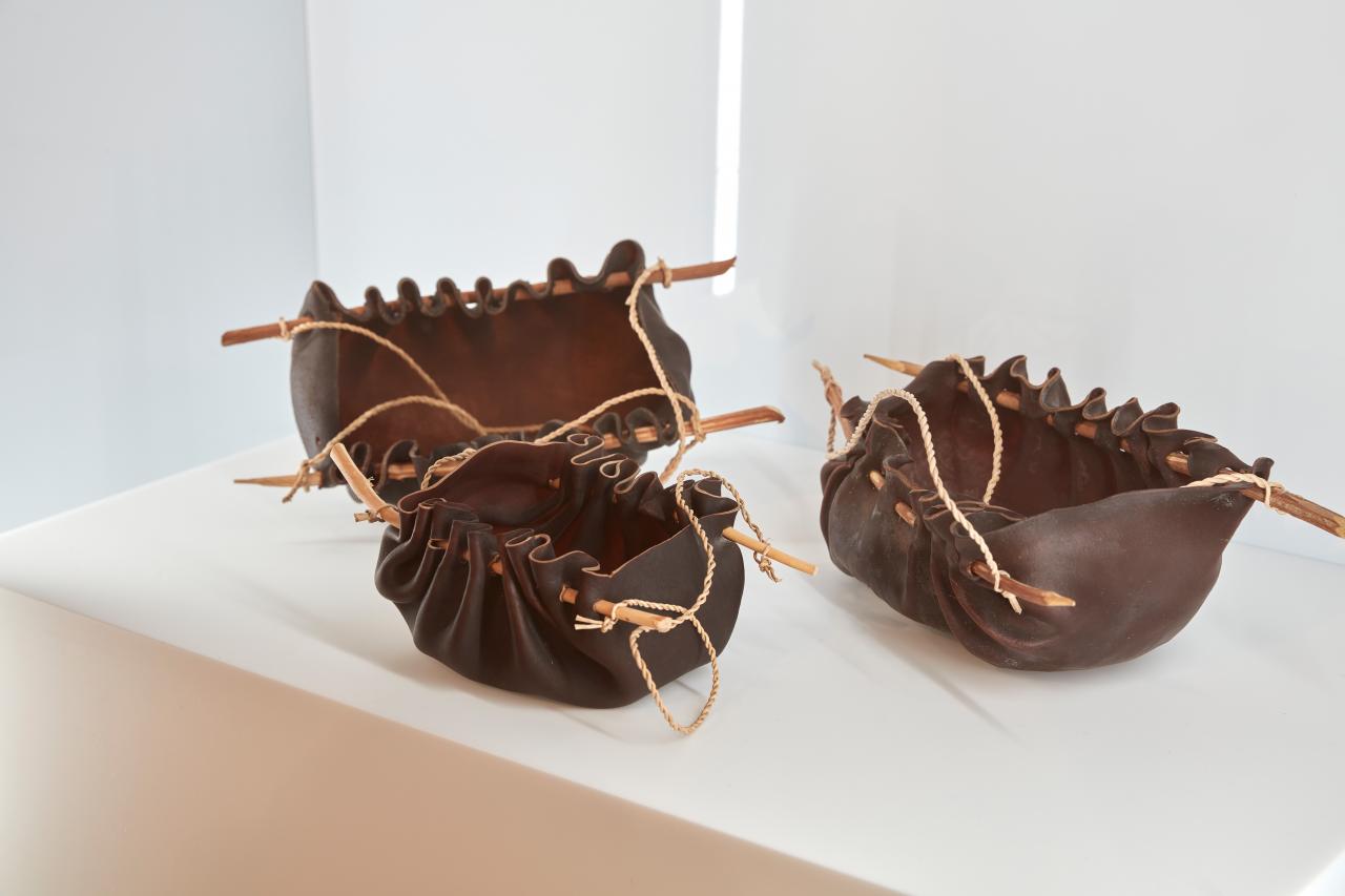PROJECT Reflection 2020 presents a group of nine kelp sculptures that pay homage to the nine traditional (pre-invasion) nations of Tasmania and are Vicki West’s contemporary re-interpretation of traditional vessels. In these works, she uses her wealth of acquired knowledge to reflect the traditional, material and customary practices of her ancestral family in north eastern Tasmania: the Trawlwoolway people.