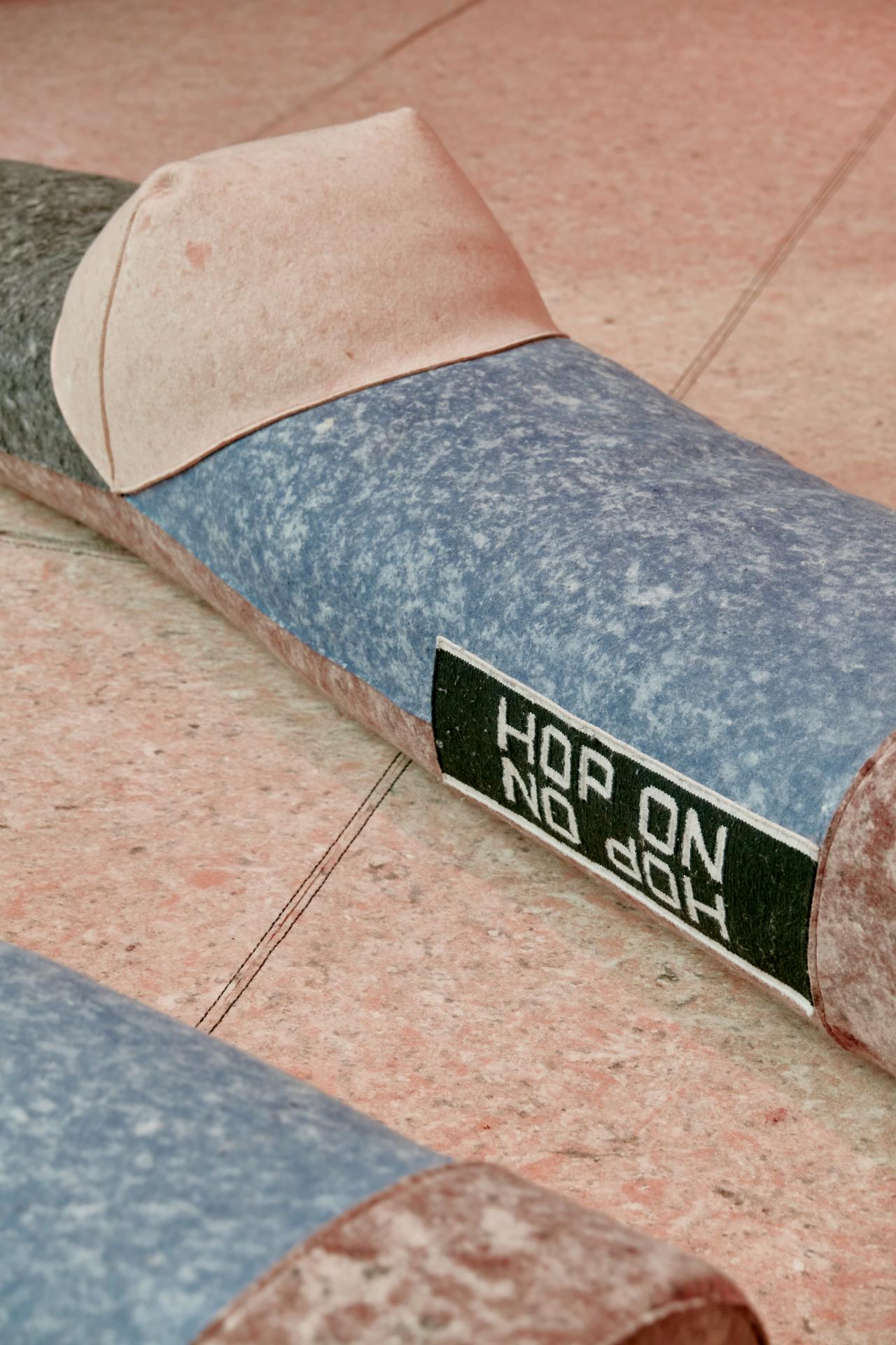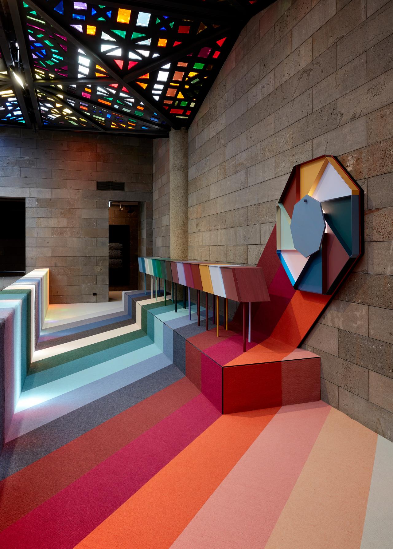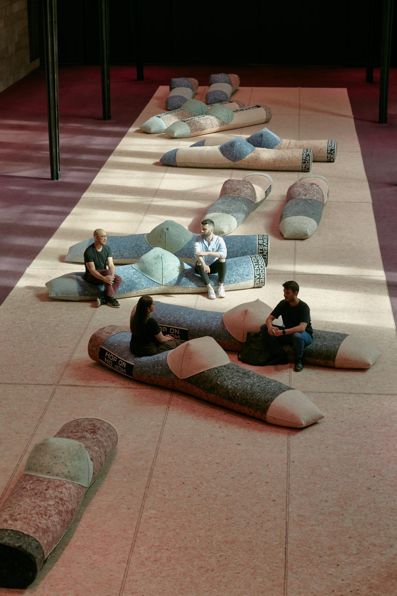 PROJECT Recycled woollen island 2020 is the first major installation by the designer in Australia; a large-scale, floor-based installation commissioned by the NGV. The installation is an interactive resting place that encourages audiences to pause and reflect on the intricate details and colour arrays of the NGV Great Hall ceiling by artist Leonard French. The project consists of numerous super-sized ‘socks’ resting on a carpet ‘island’. Drawing on Urquiola’s ongoing investigation into environmental production, recycled textile, and artisanal crafts, the work turns recycled wool felt and upcycled PET textile into sophisticated furnishings – hand fabricated by Valencia-based furniture and textile manufacturer GAN with associated artisans. Continuing Urquiola’s passion for the capacity of objects to have an embedded narrative, message or meaning, this project draws upon the universal language of humour. Giant socks create a quirky and evocative landscape within which to rest and play. Urquiola’s intention is for these ‘soft giants’ to create a utopian space where socks are larger than humans, and where the colours of the ceiling plus the colours of the installation will ‘melt together with each sun ray’.