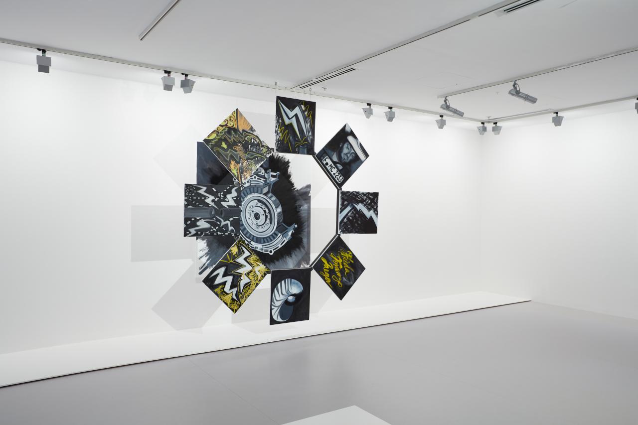 Frieda Toranzo Jaeger’s autofelatio 2018 is a multi-part painting that fans out from a central canvas, referring to art-historical precedents of polyptychs and folding paintings primarily seen in Medieval and Byzantine altarpieces, but simultaneously evoking a mechanical crank.