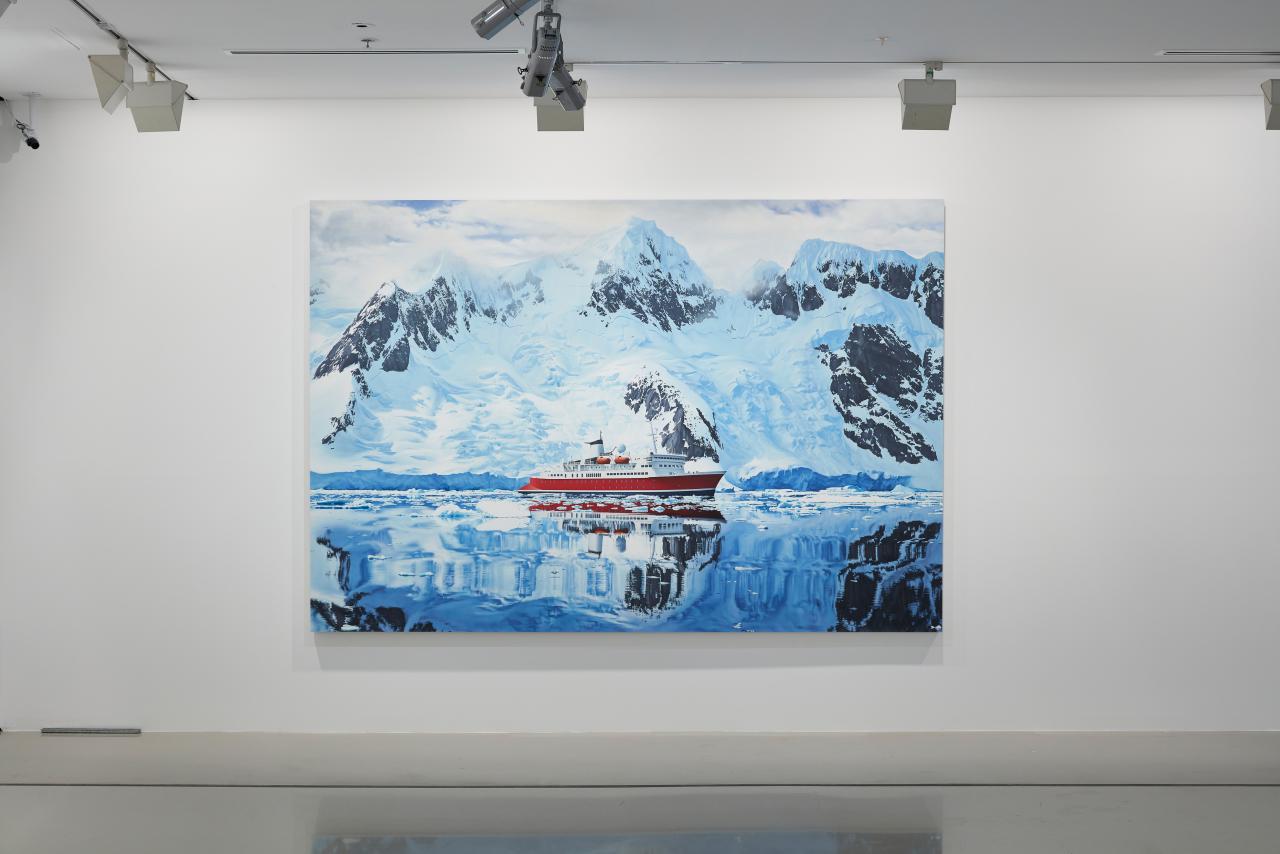Drawing from real-time weather data from the lake, elements in the simulated world respond to weather changes – wind speed moves the camera across the undulating terrain, temperature readings affect the size and number of jellyfish, and cloud cover and UV readings alter the colour palette of the environment. Situated in a room flanked by similarly large-scale artworks depicting subjects and large-scale events relevant to the 19th century, this contemporary work provides viewers with a virtual forecast of what is arguably one of the most significant events currently affecting the planet today.