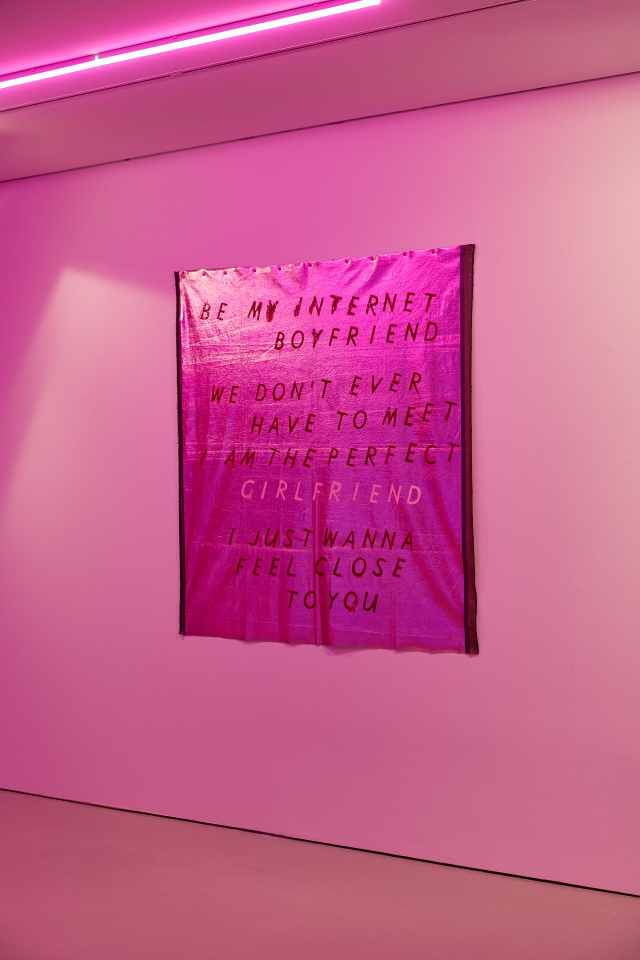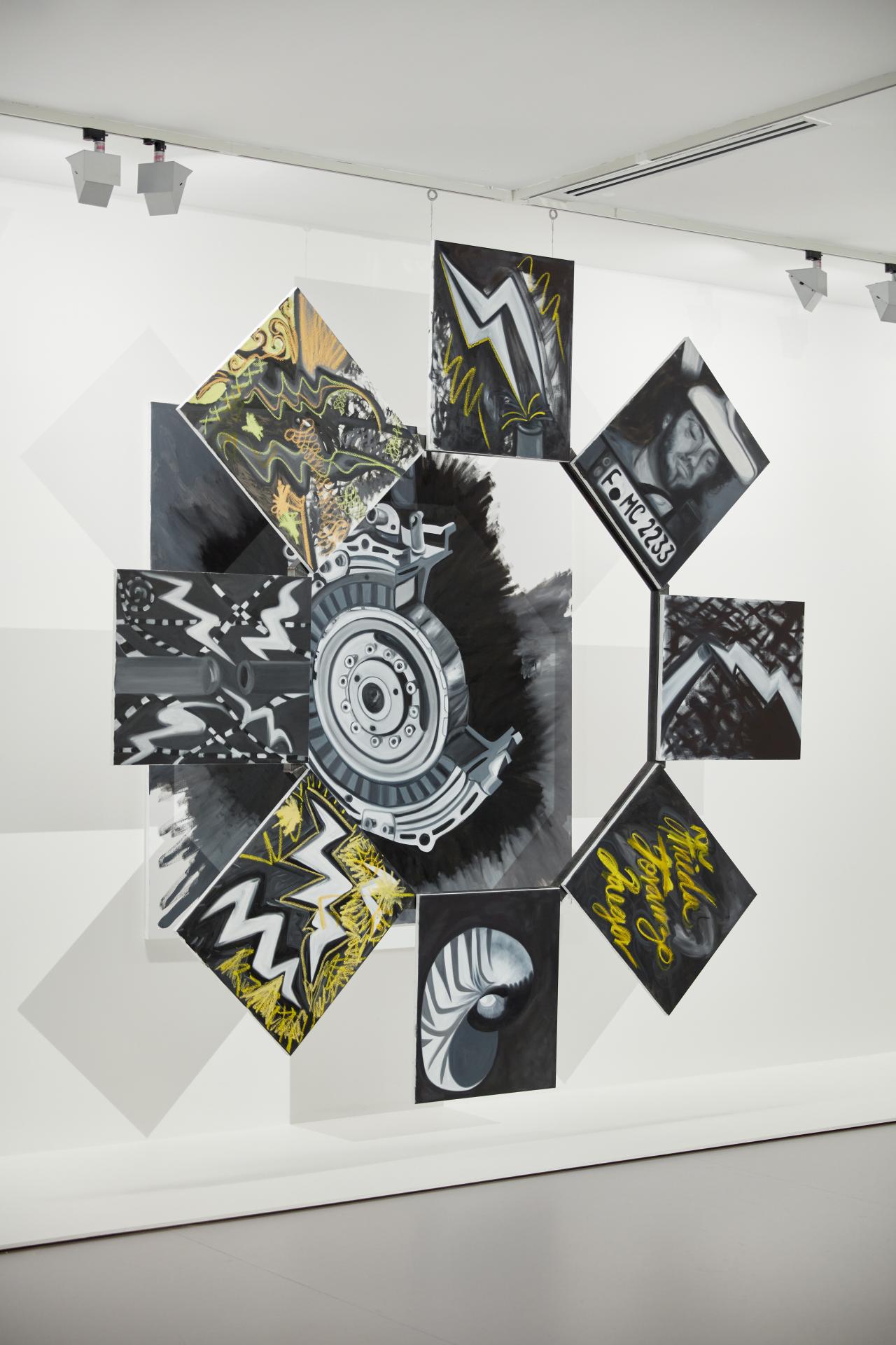 Toranzo Jaeger leads our attention to the sensuality of the surface in automotive and art objects, creating tension between the realms of the interior and exterior, the public and private. In this work, the loop of autoeroticism and the potential of infinite mechanisation is at play. The exaggerated size of the artist’s signature, emblazoned boldly on one of the canvases, parodies painting’s traditionally male authorship and reclaims that space for a queer female voice.