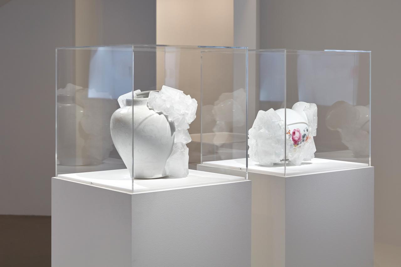 Lukas Wegwerth’s works Crystallization 152 2019 and Crystallization 146 2019 repurpose existing ceramic vessels by transforming them into hosts for the growth of salt crystals. Submerging the vessels in a chemical solution, cracks and chips are slowly colonised by crystal formations over time. Wegwerth monitors the crystal’s growth and intervenes to manipulate the path and size of the crystal structure. The process Wegwerth applies to his vessels references the 15th century Japanese art of fixing broken pottery called Kintsugi or ‘golden repair’. Here lacquer dusted with powdered gold, silver, or platinum is applied to the cracks of a ceramic vessel. Kintsugi is also related to the Japanese concept of mottainai, which encapsulates a sense of regret when something is wasted. This sense of regret broadly acknowledges that all objects, broken or not, have an intrinsic value — a sum of natural resources, energy and human capital. For Wegwerth, restoring the ceramic vessels using the crystallization process symbolises the interdependence of the human made environment with the natural. Recognising that we are a part of, and not separate from nature, is central to charting a sustainable future.