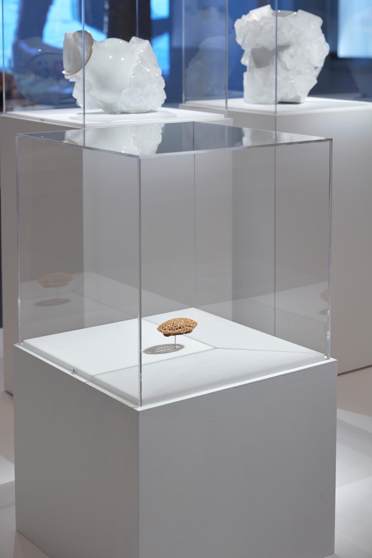 In her 2016 series consisting of a brooch and three necklaces, Naama Bergman’s collection of salt jewellery is presented alongside a display of design projects that harness natural processes of emergence, growth, and decay to draw attention to the constant cycles of change that shape our lives. Inspired by her experiences relocating from Israel to Germany, Bergman began experimenting with materials and aesthetics of preservation to reflect the morphology of identity – particularly how identities are formed collectively and individually, and how migration and the passage of time can reshape the way people see themselves and others. To create each piece, Bergman delicately weaves strands of iron wire into a fine mesh which is formed over a mould to create voluminous, three-dimensional forms. The piece is then submerged in a concentrated salt solution which catalyses he process of simultaneous growth and decay that is central to her practice. As the salt crystallises along the surface of the mesh, the interaction of materials begins digesting the iron. When the piece is removed from the solution and exposed to air, the salt begins its own process of decay. In creating unstable jewellery pieces based on transient materiality, Bergman sets up a confrontation between preservation and decomposition, and questions the power, function, and mutability of medium and form.