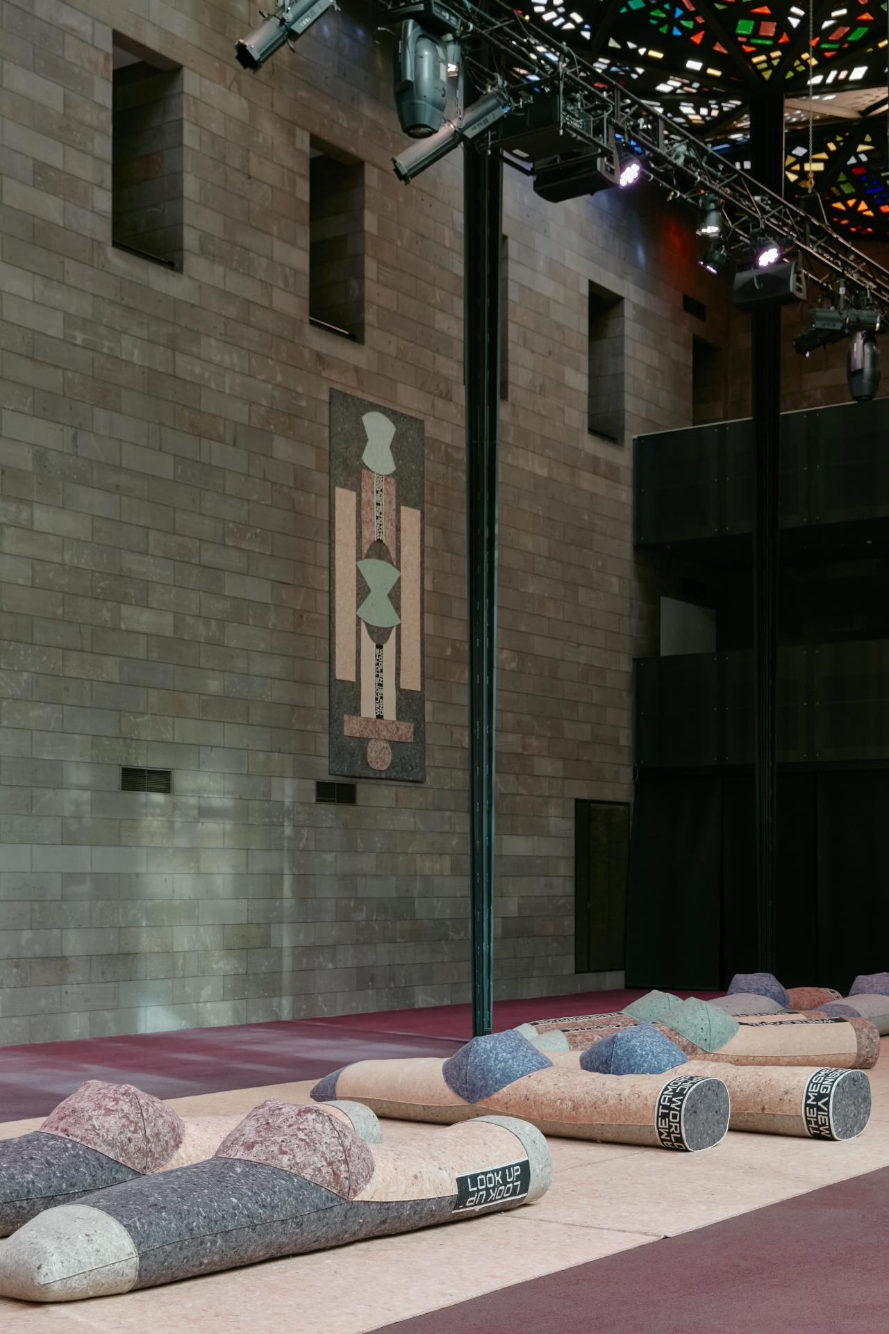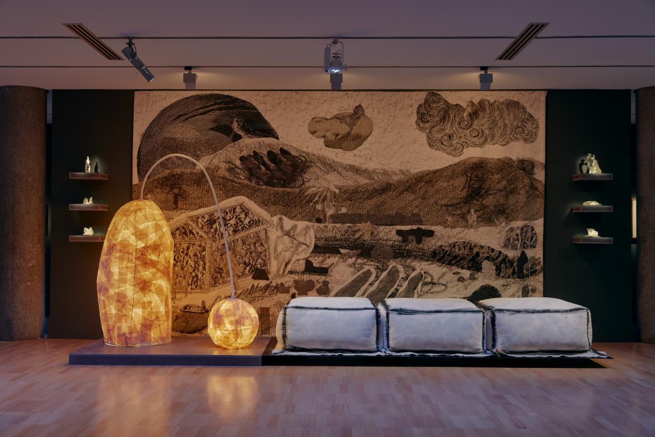 PROJECT Recycled woollen island 2020 is the first major installation by the designer in Australia; a large-scale, floor-based installation commissioned by the NGV. The installation is an interactive resting place that encourages audiences to pause and reflect on the intricate details and colour arrays of the NGV Great Hall ceiling by artist Leonard French. The project consists of numerous super-sized ‘socks’ resting on a carpet ‘island’. Drawing on Urquiola’s ongoing investigation into environmental production, recycled textile, and artisanal crafts, the work turns recycled wool felt and upcycled PET textile into sophisticated furnishings – hand fabricated by Valencia-based furniture and textile manufacturer GAN with associated artisans. Continuing Urquiola’s passion for the capacity of objects to have an embedded narrative, message or meaning, this project draws upon the universal language of humour. Giant socks create a quirky and evocative landscape within which to rest and play. Urquiola’s intention is for these ‘soft giants’ to create a utopian space where socks are larger than humans, and where the colours of the ceiling plus the colours of the installation will ‘melt together with each sun ray’.