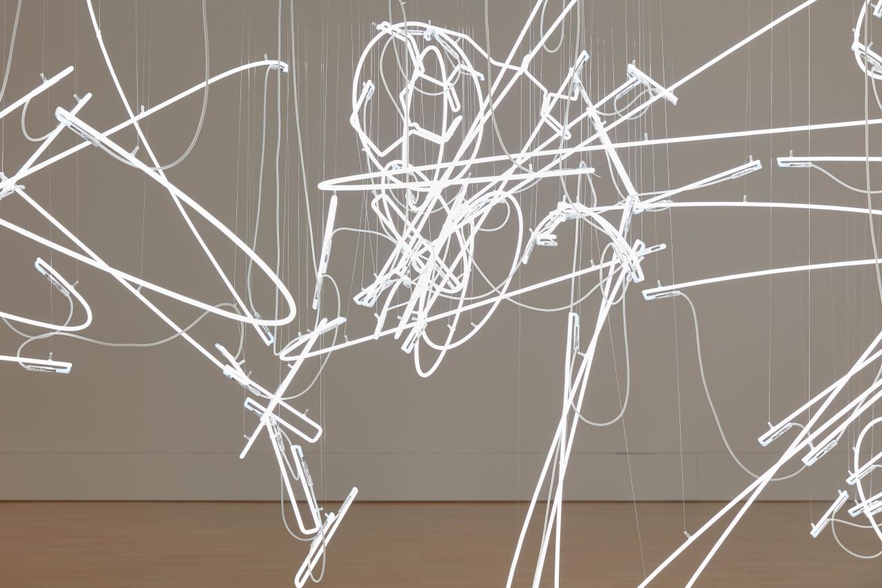 Cerith Wyn Evans’s C=O=D=A 2019–20 unfolds as a drawing in light, suspended in space. The work is regarded by the artist as a culmination of his suite of large neon ‘drawings’ that have explored the legacy of Noh Theatre. Comprising multiple elements, some busy and scribble-like, others diagrammatic – including references to the structural formulae for chemical compounds – the light sculpture will invite visitors to consider the relationships of each form to the next, as they move around the work and alter their perspectives. The work punctuates the visitor’s field of vision with rapid vectors, loops, straight lines, curves and complex geometric forms lit up in white neon.