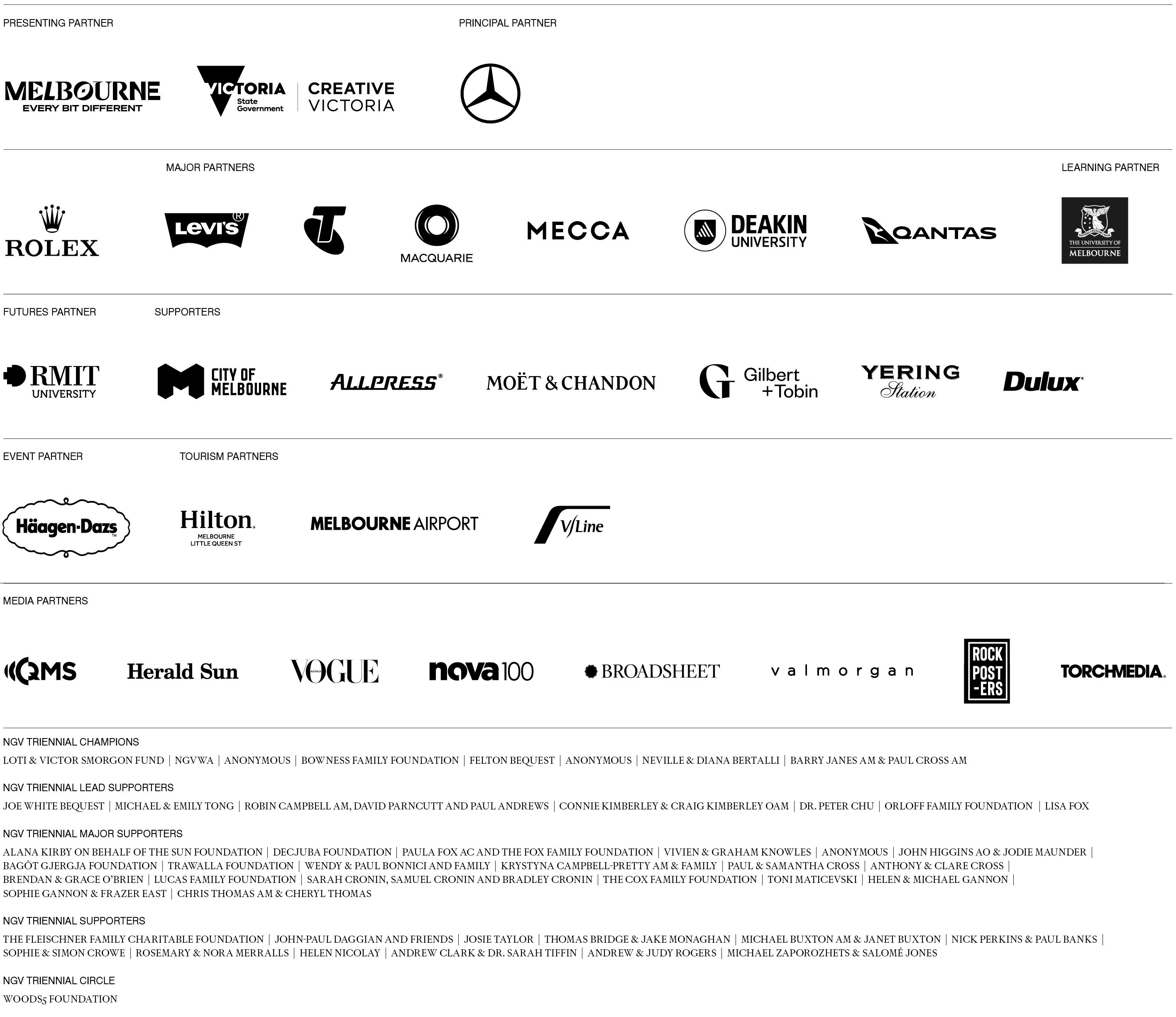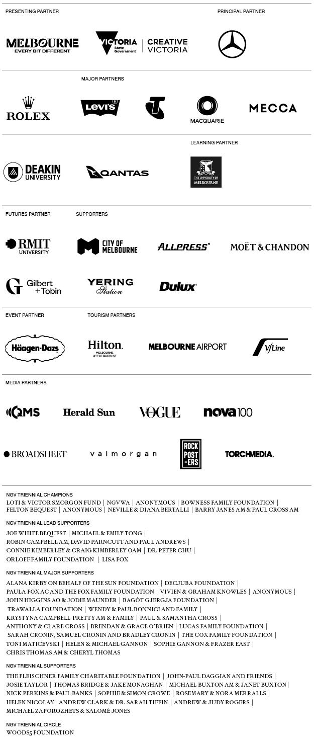 Unfolding across all four levels of NGV International, the fourth NGV Triennial brings together the work of some of the most respected artists and designers from around the world, while amplifying the voices of emerging talents. Spanning painting, video, sculpture, installation, fashion, textiles, ceramics and design, the exhibition places contemporary works in dialogue with the NGV’s historical collections.