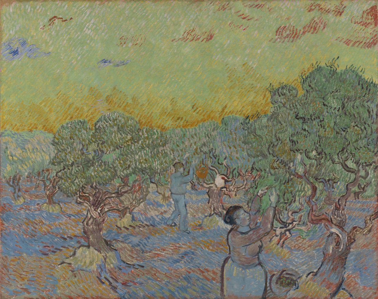 Van Gogh made paintings and drawings depicting the different seasons throughout his later career, although not necessarily as a series, and continued to link them to the life of the peasants, as in his many drawings of peasants harvesting dating to the summer of 1885. The subject remained important in the highly avant-garde work he made after moving to France in 1886 and is clearly evident in many of the themes he painted in Arles and Saint-Rémy: fruit orchards in bloom (spring); the wheat harvest, the reaping of the wheat (summer); sowers, the grape harvest, the olive harvest (autumn); and a plough and harrow on bleak fields (after Millet, winter).