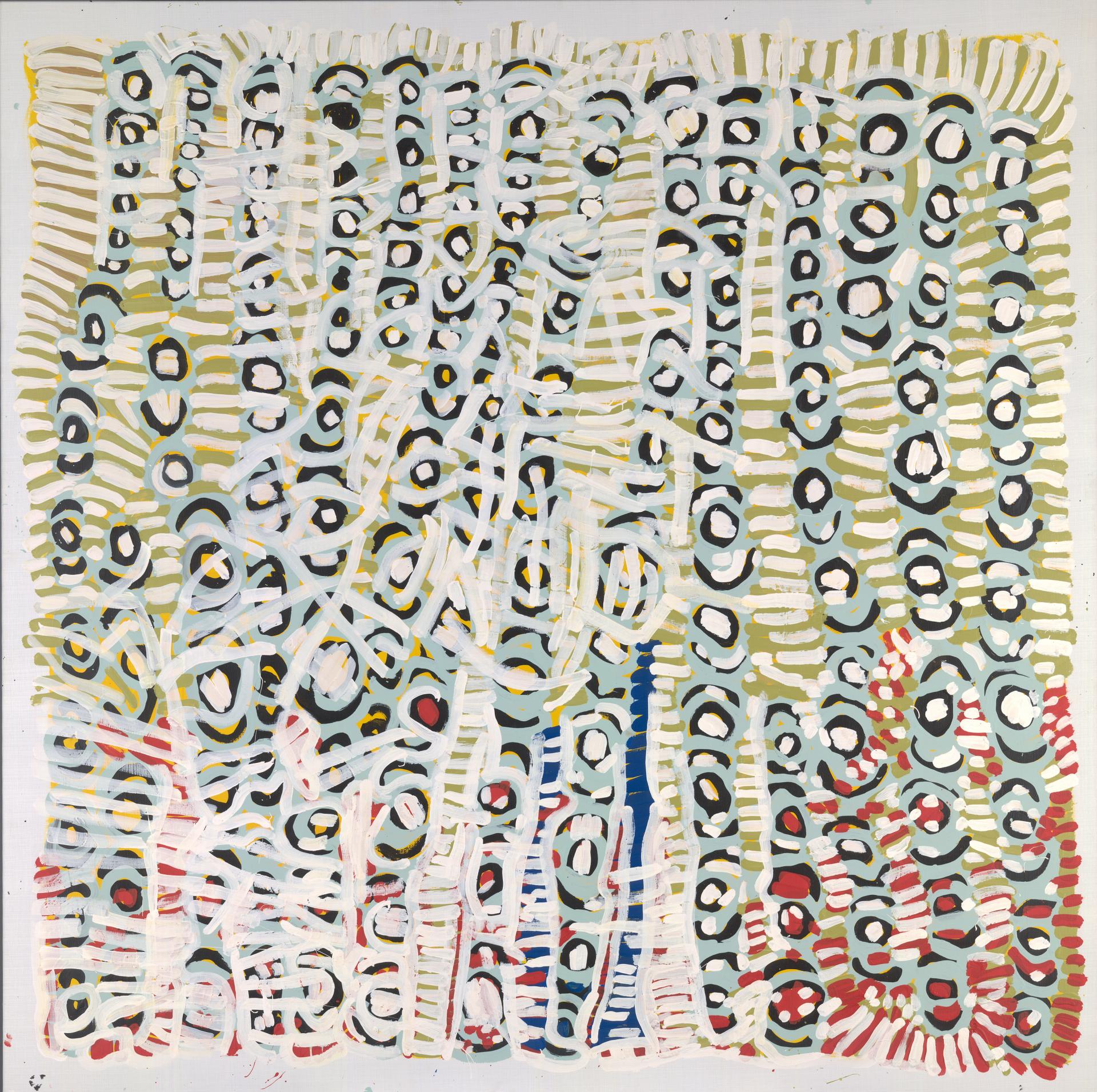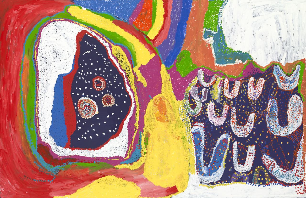 During the 1990s, Indigenous Australian women emerged as artists of astonishing innovation and eloquence, a phenomenon that has positioned them at the forefront of contemporary Indigenous art practice. The eight senior Indigenous masters of light and colour represented in this special NGV Collection Focus inform their paintings with profound knowledge and cultural memory of Country and its sanctity. The works evidence the artists’ embodied experiences that are both physical and mnemonic and which predated European contact and its consequent cultural and intellectual assail. These intrepid practitioners of contemporary art have simultaneously come to the fore in two distinct cultural and geographical regions of Indigenous Australia: the vast inland deserts and a tiny island in the Gulf of Carpentaria, Queensland.