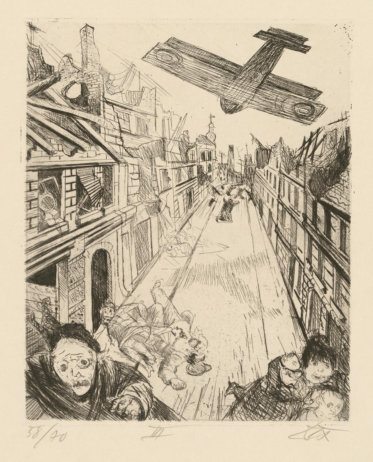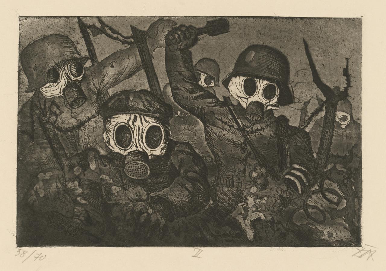 Otto Dix’s series War [Der Krieg], 1924, arose out of his personal experiences as a soldier in the First World War. Dix (1891–1969) fought as a machine-gunner on the Western Front, where he was wounded a number of times. War profoundly affected him as an individual and as an artist. He took every opportunity to document what he saw and, still haunted by his memories several years after the end of the war, Dix produced a series of 51 etchings based on his sketches and recollections.