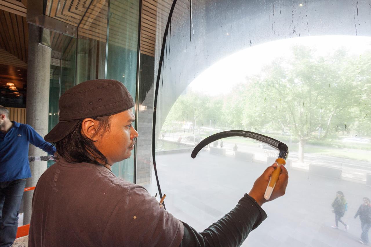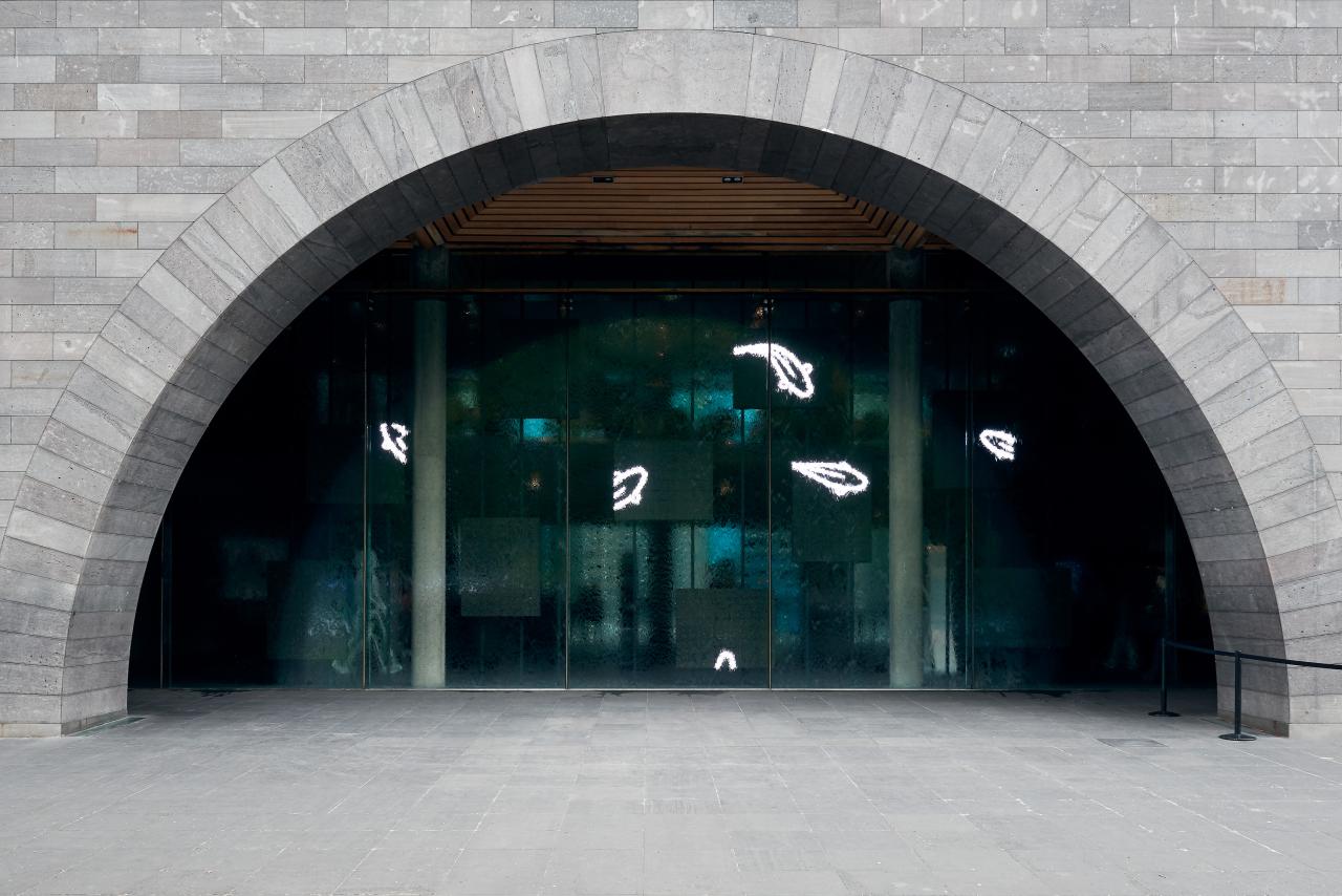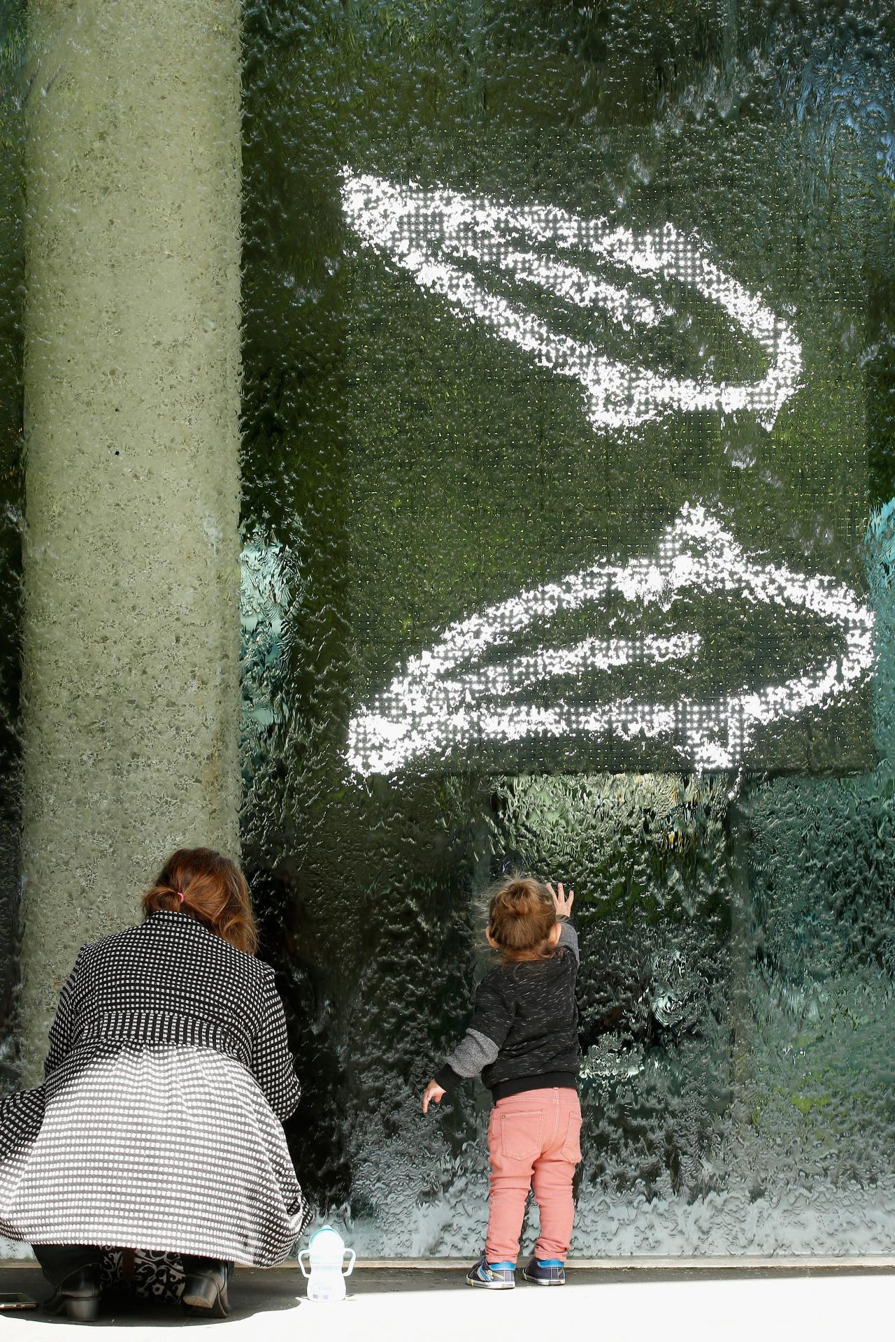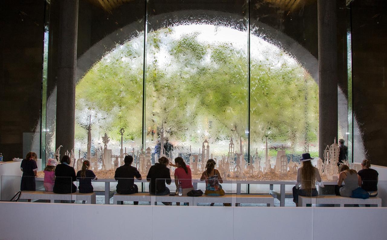 Keith Haring was the first artist to create a mural on the NGV Waterwall. In the midst of his rise to fame, Haring visited Melbourne for a number of weeks in 1984. During this time, he undertook a series of public works including a now-iconic mural in Collingwood and a mural commissioned for the NGV’s Waterwall. Thirty-five years later, the mural was recreated for the blockbuster exhibition Keith Haring | Jean-Michel Basquiat: Crossing Lines in 2019.