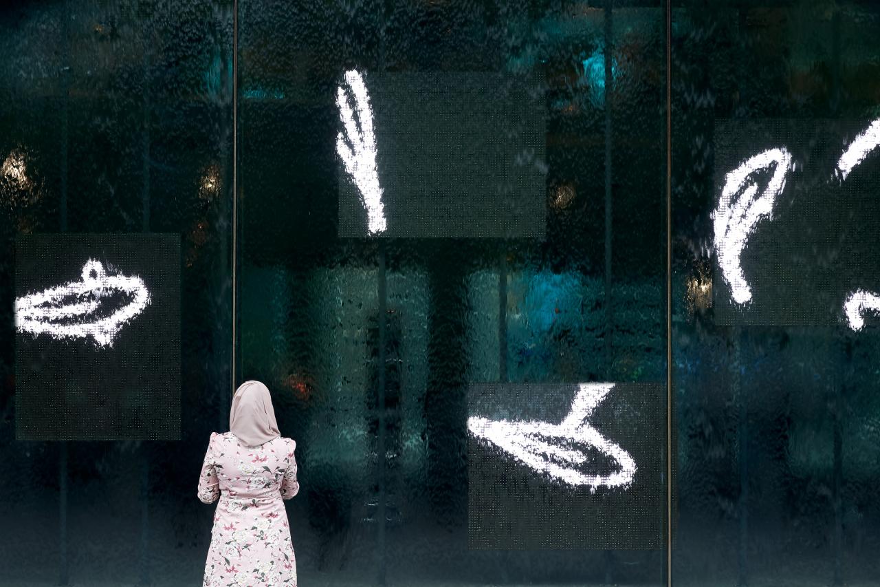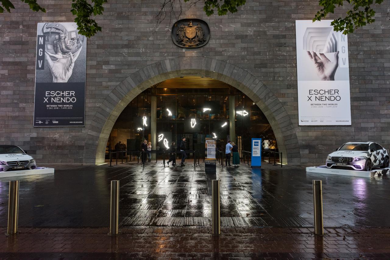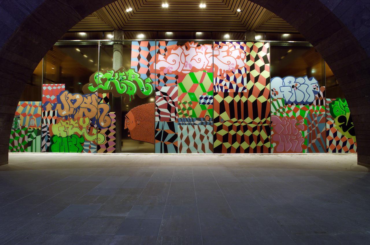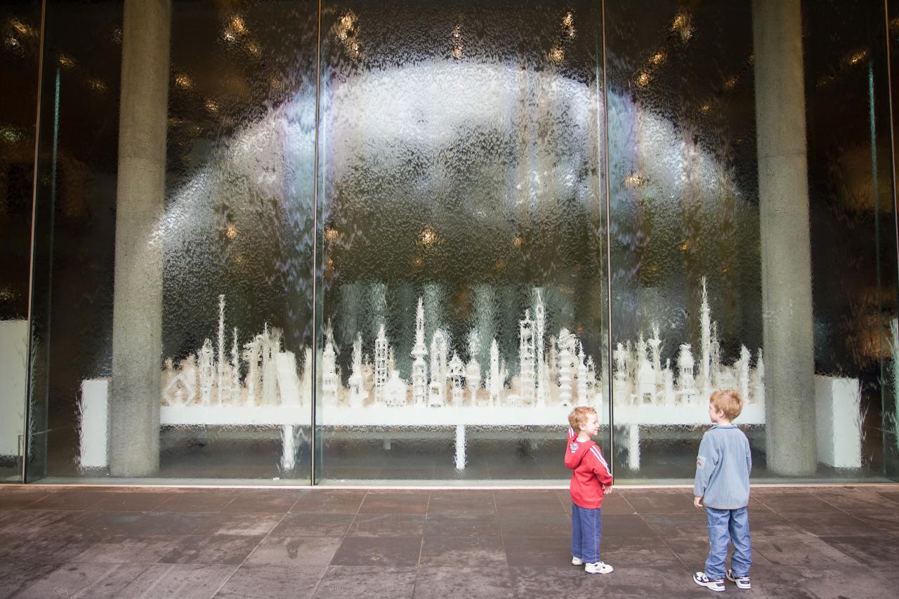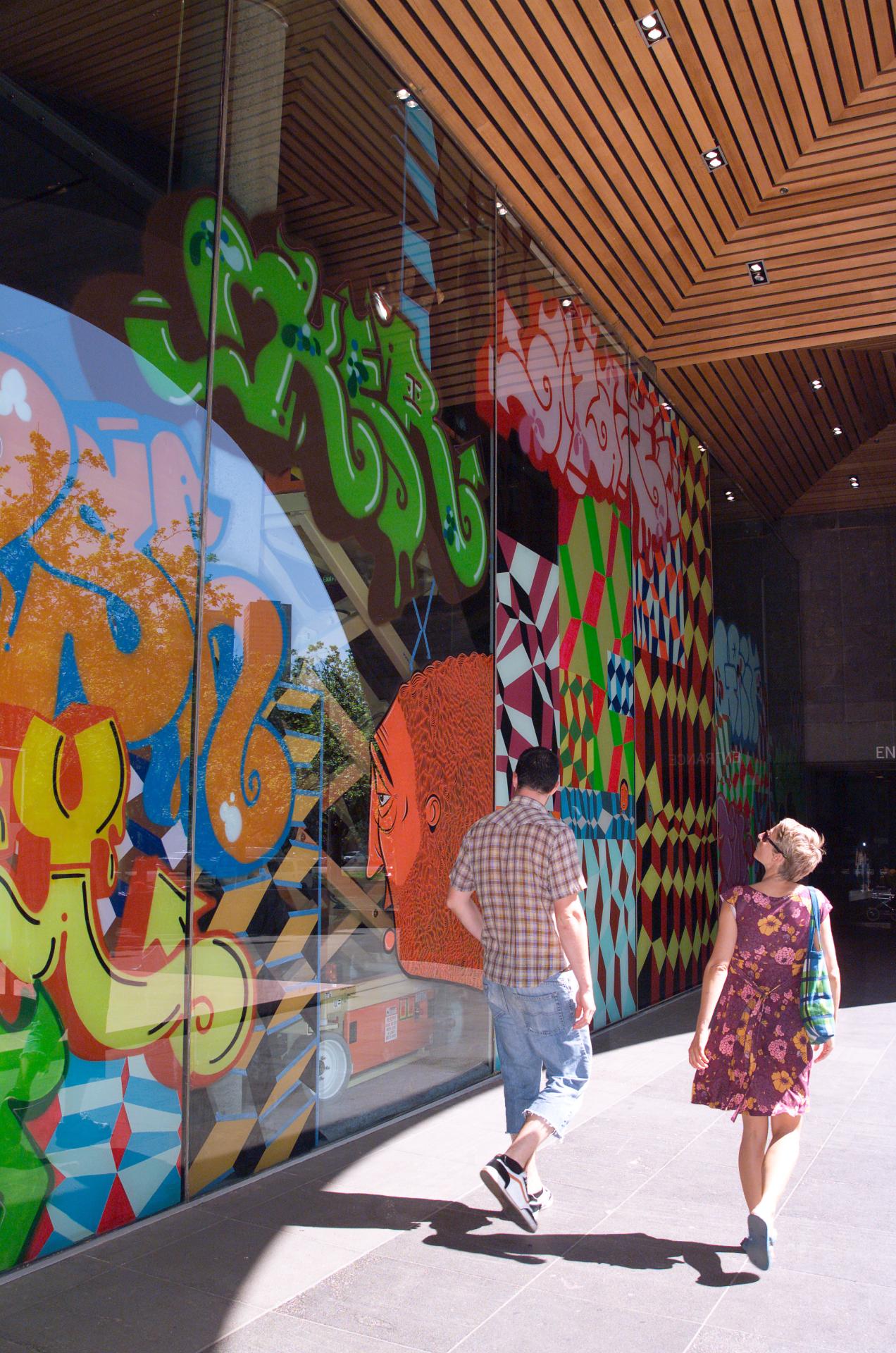 Keith Haring was the first artist to create a mural on the NGV Waterwall. In the midst of his rise to fame, Haring visited Melbourne for a number of weeks in 1984. During this time, he undertook a series of public works including a now-iconic mural in Collingwood and a mural commissioned for the NGV’s Waterwall. Thirty-five years later, the mural was recreated for the blockbuster exhibition Keith Haring | Jean-Michel Basquiat: Crossing Lines in 2019.