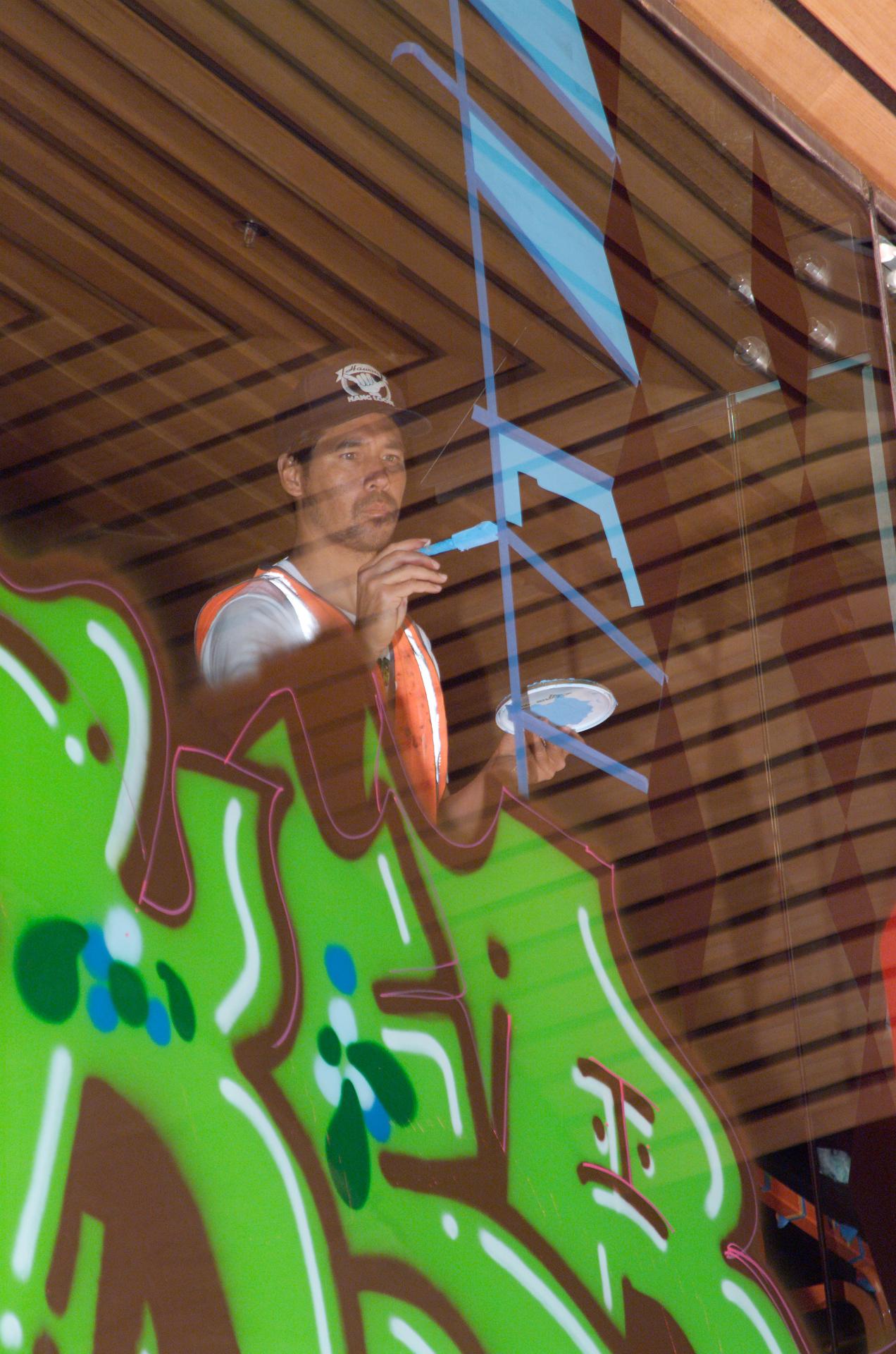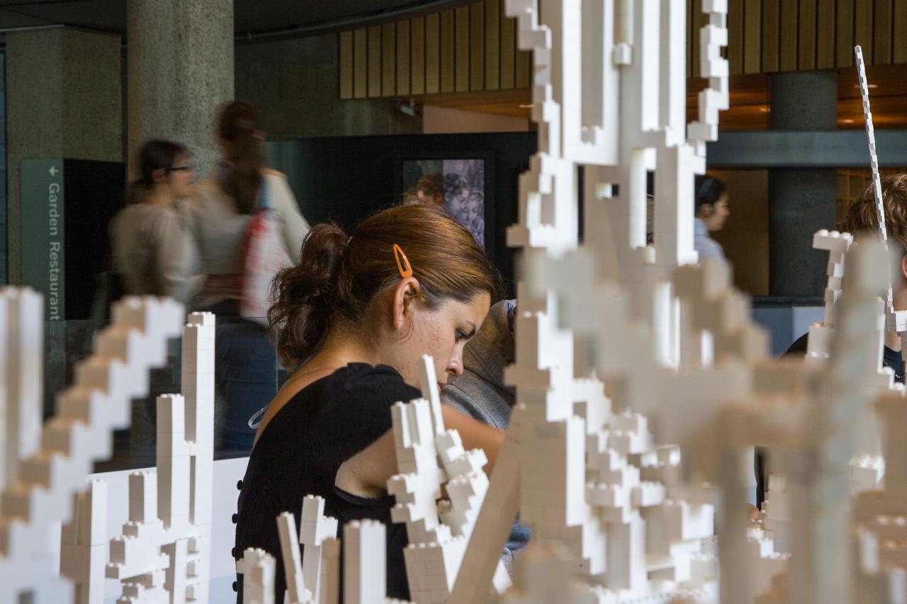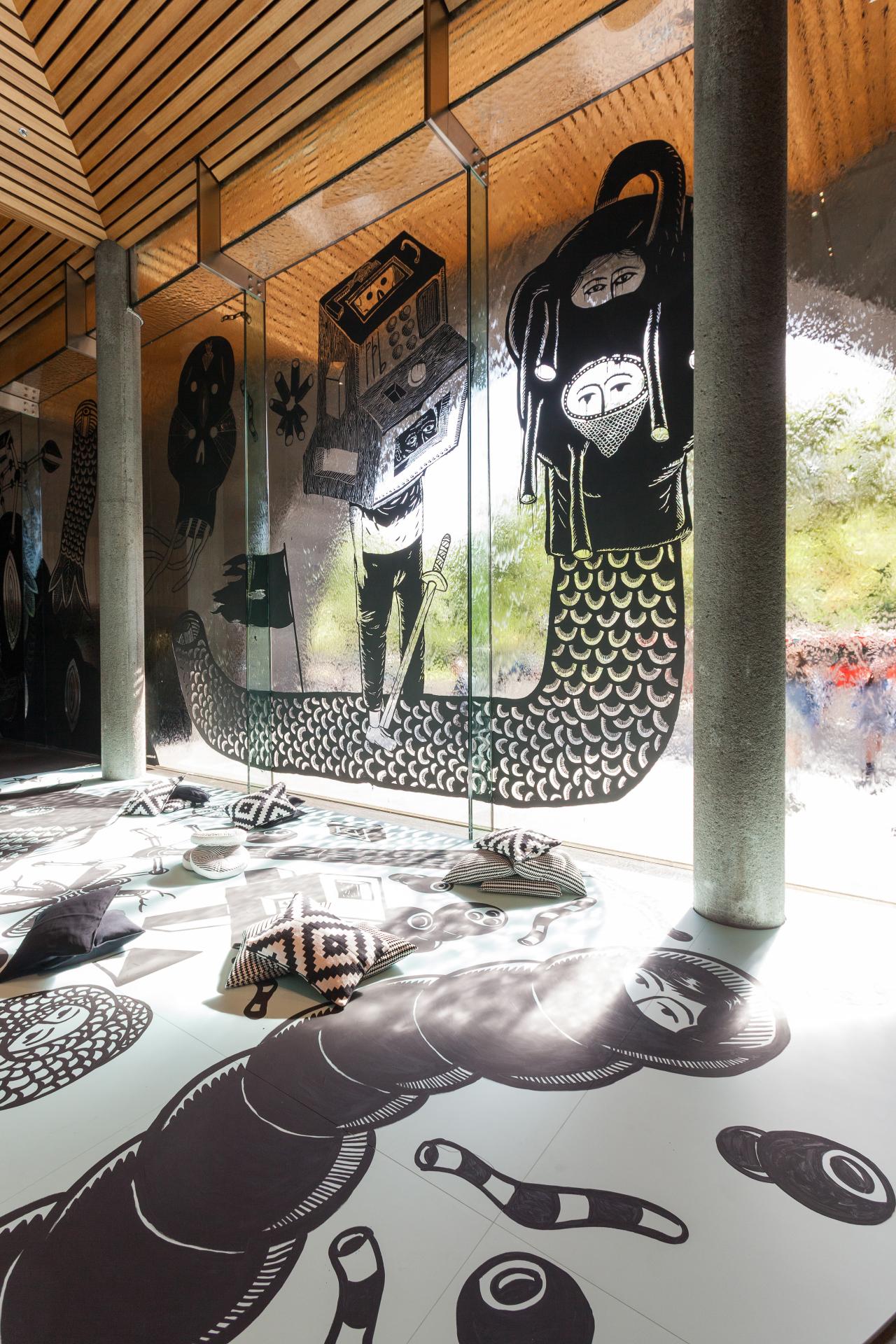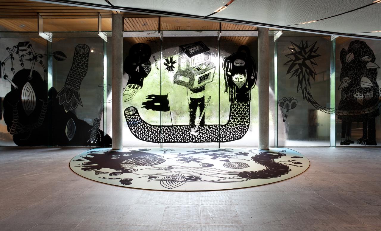 Keith Haring was the first artist to create a mural on the NGV Waterwall. In the midst of his rise to fame, Haring visited Melbourne for a number of weeks in 1984. During this time, he undertook a series of public works including a now-iconic mural in Collingwood and a mural commissioned for the NGV’s Waterwall. Thirty-five years later, the mural was recreated for the blockbuster exhibition Keith Haring | Jean-Michel Basquiat: Crossing Lines in 2019.
