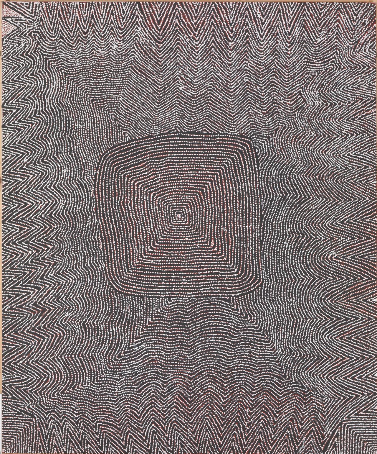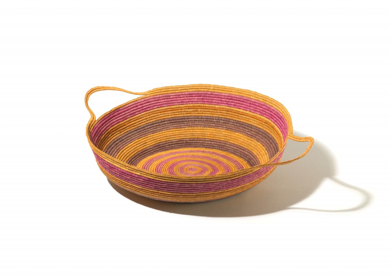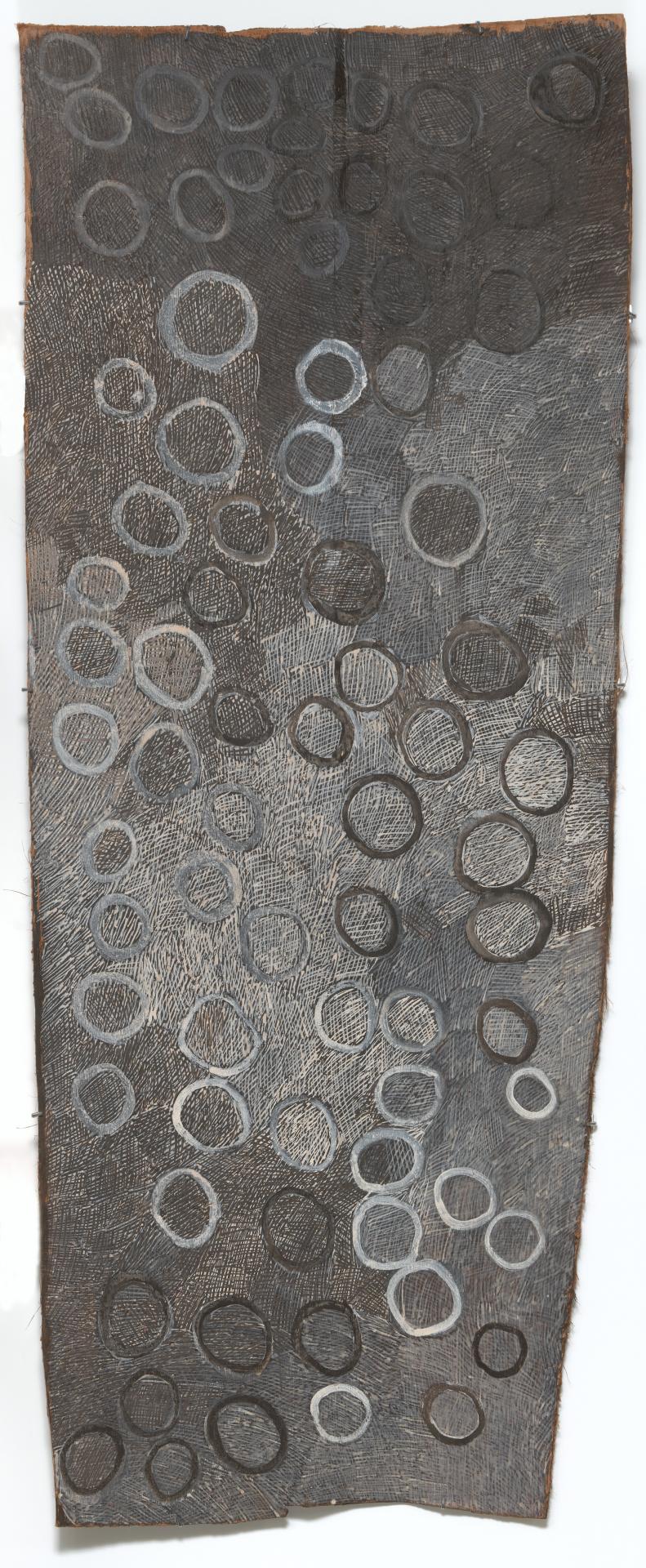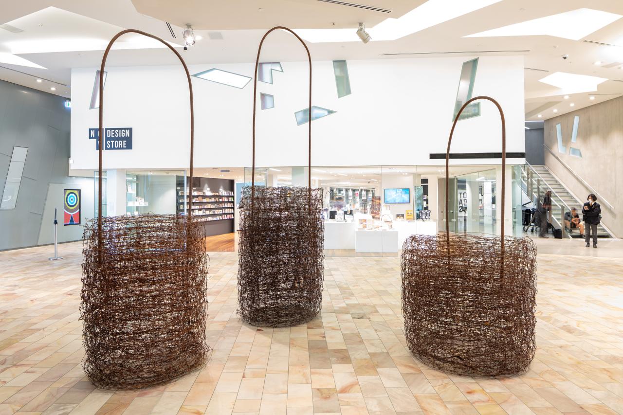 These three wire bags produced in 2013 were displayed for the first time at the NGV for the exhibition Melbourne Now. Each sculpture is made from coiled fencing wire and has been supersized, reflecting the scale of destruction that followed post- European arrival in Australia. In an interview from 2014, Connelly-Northey described her process and reflections when working with this material, saying: ‘I thought about how this fencing wire was where my mum was living, on missions and reserves and how wire was used to keep mum in, like sheep in a paddock, but also to keep her out of her traditional Country, to go and hunt and gather, and those kind of things’.